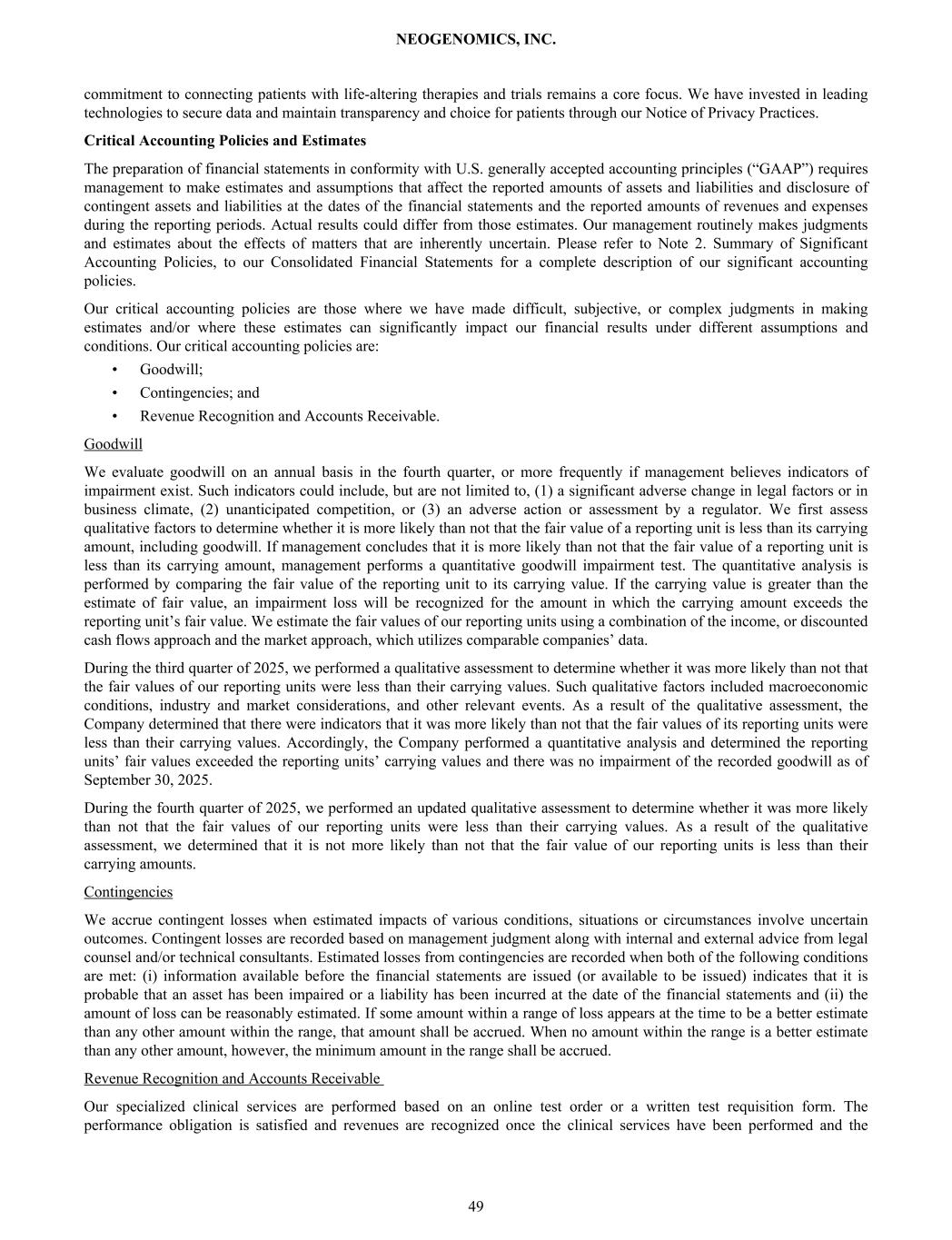 commitment to connecting patients with life-altering therapies and trials remains a core focus. We have invested in leading technologies to secure data and maintain transparency and choice for patients through our Notice of Privacy Practices. Critical Accounting Policies and Estimates The preparation of financial statements in conformity with U.S. generally accepted accounting principles (“GAAP”) requires management to make estimates and assumptions that affect the reported amounts of assets and liabilities and disclosure of contingent assets and liabilities at the dates of the financial statements and the reported amounts of revenues and expenses during the reporting periods. Actual results could differ from those estimates. Our management routinely makes judgments and estimates about the effects of matters that are inherently uncertain. Please refer to Note 2. Summary of Significant Accounting Policies, to our Consolidated Financial Statements for a complete description of our significant accounting policies. Our critical accounting policies are those where we have made difficult, subjective, or complex judgments in making estimates and/or where these estimates can significantly impact our financial results under different assumptions and conditions. Our critical accounting policies are: • Goodwill; • Contingencies; and • Revenue Recognition and Accounts Receivable. Goodwill We evaluate goodwill on an annual basis in the fourth quarter, or more frequently if management believes indicators of impairment exist. Such indicators could include, but are not limited to, (1) a significant adverse change in legal factors or in business climate, (2) unanticipated competition, or (3) an adverse action or assessment by a regulator. We first assess qualitative factors to determine whether it is more likely than not that the fair value of a reporting unit is less than its carrying amount, including goodwill. If management concludes that it is more likely than not that the fair value of a reporting unit is less than its carrying amount, management performs a quantitative goodwill impairment test. The quantitative analysis is performed by comparing the fair value of the reporting unit to its carrying value. If the carrying value is greater than the estimate of fair value, an impairment loss will be recognized for the amount in which the carrying amount exceeds the reporting unit’s fair value. We estimate the fair values of our reporting units using a combination of the income, or discounted cash flows approach and the market approach, which utilizes comparable companies’ data. During the third quarter of 2025, we performed a qualitative assessment to determine whether it was more likely than not that the fair values of our reporting units were less than their carrying values. Such qualitative factors included macroeconomic conditions, industry and market considerations, and other relevant events. As a result of the qualitative assessment, the Company determined that there were indicators that it was more likely than not that the fair values of its reporting units were less than their carrying values. Accordingly, the Company performed a quantitative analysis and determined the reporting units’ fair values exceeded the reporting units’ carrying values and there was no impairment of the recorded goodwill as of September 30, 2025. During the fourth quarter of 2025, we performed an updated qualitative assessment to determine whether it was more likely than not that the fair values of our reporting units were less than their carrying values. As a result of the qualitative assessment, we determined that it is not more likely than not that the fair value of our reporting units is less than their carrying amounts. Contingencies We accrue contingent losses when estimated impacts of various conditions, situations or circumstances involve uncertain outcomes. Contingent losses are recorded based on management judgment along with internal and external advice from legal counsel and/or technical consultants. Estimated losses from contingencies are recorded when both of the following conditions are met: (i) information available before the financial statements are issued (or available to be issued) indicates that it is probable that an asset has been impaired or a liability has been incurred at the date of the financial statements and (ii) the amount of loss can be reasonably estimated. If some amount within a range of loss appears at the time to be a better estimate than any other amount within the range, that amount shall be accrued. When no amount within the range is a better estimate than any other amount, however, the minimum amount in the range shall be accrued. Revenue Recognition and Accounts Receivable Our specialized clinical services are performed based on an online test order or a written test requisition form. The performance obligation is satisfied and revenues are recognized once the clinical services have been performed and the NEOGENOMICS, INC. 49