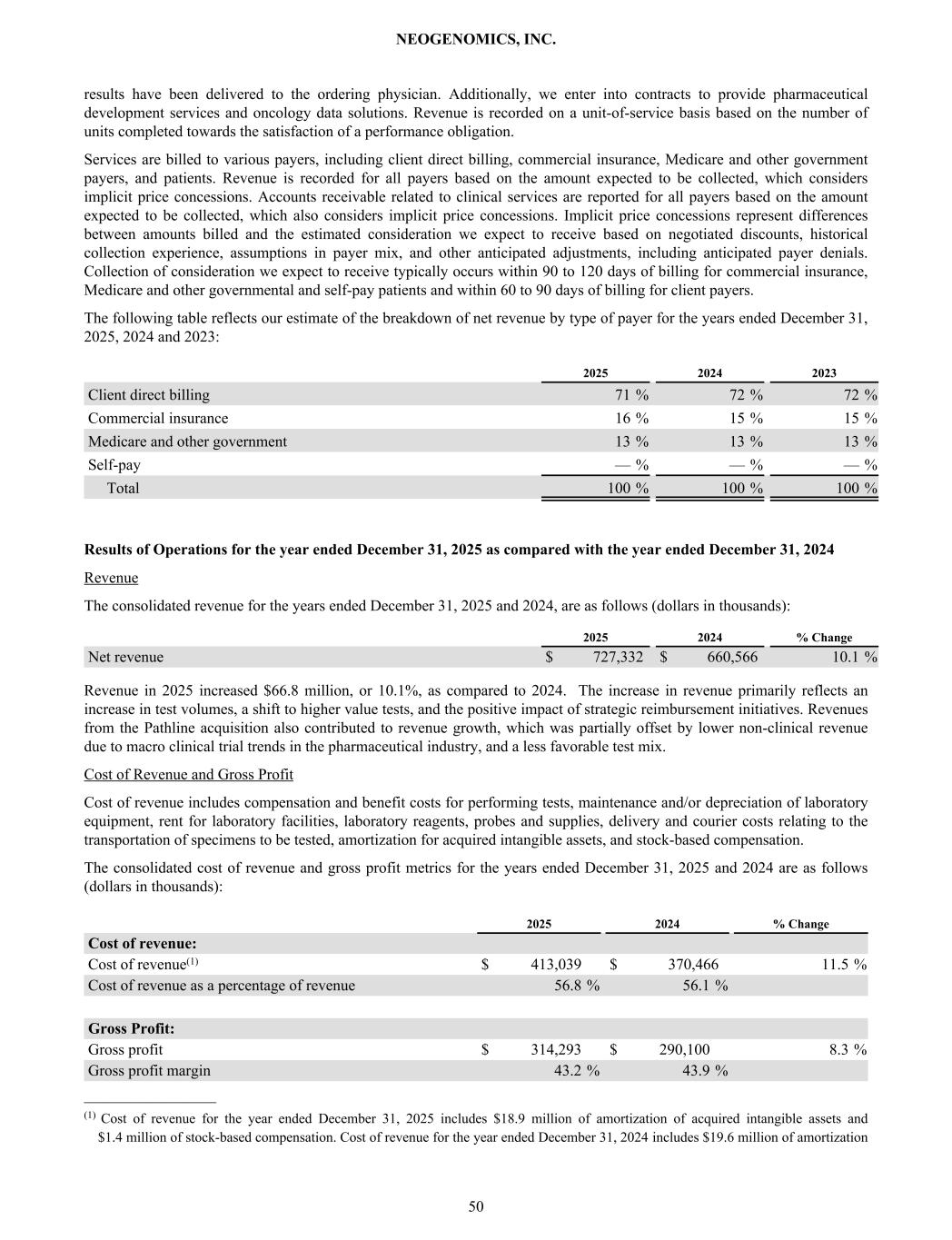 results have been delivered to the ordering physician. Additionally, we enter into contracts to provide pharmaceutical development services and oncology data solutions. Revenue is recorded on a unit-of-service basis based on the number of units completed towards the satisfaction of a performance obligation. Services are billed to various payers, including client direct billing, commercial insurance, Medicare and other government payers, and patients. Revenue is recorded for all payers based on the amount expected to be collected, which considers implicit price concessions. Accounts receivable related to clinical services are reported for all payers based on the amount expected to be collected, which also considers implicit price concessions. Implicit price concessions represent differences between amounts billed and the estimated consideration we expect to receive based on negotiated discounts, historical collection experience, assumptions in payer mix, and other anticipated adjustments, including anticipated payer denials. Collection of consideration we expect to receive typically occurs within 90 to 120 days of billing for commercial insurance, Medicare and other governmental and self-pay patients and within 60 to 90 days of billing for client payers. The following table reflects our estimate of the breakdown of net revenue by type of payer for the years ended December 31, 2025, 2024 and 2023: 2025 2024 2023 Client direct billing 71 % 72 % 72 % Commercial insurance 16 % 15 % 15 % Medicare and other government 13 % 13 % 13 % Self-pay — % — % — % Total 100 % 100 % 100 % Results of Operations for the year ended December 31, 2025 as compared with the year ended December 31, 2024 Revenue The consolidated revenue for the years ended December 31, 2025 and 2024, are as follows (dollars in thousands): 2025 2024 % Change Net revenue $ 727,332 $ 660,566 10.1 % Revenue in 2025 increased $66.8 million, or 10.1%, as compared to 2024. The increase in revenue primarily reflects an increase in test volumes, a shift to higher value tests, and the positive impact of strategic reimbursement initiatives. Revenues from the Pathline acquisition also contributed to revenue growth, which was partially offset by lower non-clinical revenue due to macro clinical trial trends in the pharmaceutical industry, and a less favorable test mix. Cost of Revenue and Gross Profit Cost of revenue includes compensation and benefit costs for performing tests, maintenance and/or depreciation of laboratory equipment, rent for laboratory facilities, laboratory reagents, probes and supplies, delivery and courier costs relating to the transportation of specimens to be tested, amortization for acquired intangible assets, and stock-based compensation. The consolidated cost of revenue and gross profit metrics for the years ended December 31, 2025 and 2024 are as follows (dollars in thousands): 2025 2024 % Change Cost of revenue: Cost of revenue(1) $ 413,039 $ 370,466 11.5 % Cost of revenue as a percentage of revenue 56.8 % 56.1 % Gross Profit: Gross profit $ 314,293 $ 290,100 8.3 % Gross profit margin 43.2 % 43.9 % _________________ (1) Cost of revenue for the year ended December 31, 2025 includes $18.9 million of amortization of acquired intangible assets and $1.4 million of stock-based compensation. Cost of revenue for the year ended December 31, 2024 includes $19.6 million of amortization NEOGENOMICS, INC. 50