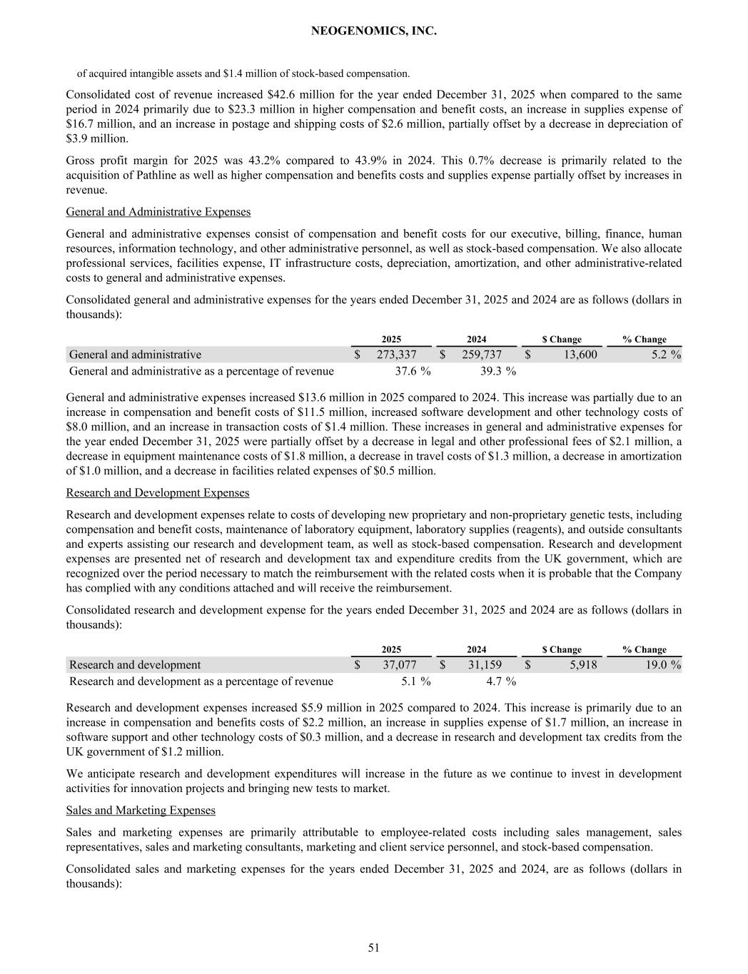 of acquired intangible assets and $1.4 million of stock-based compensation. Consolidated cost of revenue increased $42.6 million for the year ended December 31, 2025 when compared to the same period in 2024 primarily due to $23.3 million in higher compensation and benefit costs, an increase in supplies expense of $16.7 million, and an increase in postage and shipping costs of $2.6 million, partially offset by a decrease in depreciation of $3.9 million. Gross profit margin for 2025 was 43.2% compared to 43.9% in 2024. This 0.7% decrease is primarily related to the acquisition of Pathline as well as higher compensation and benefits costs and supplies expense partially offset by increases in revenue. General and Administrative Expenses General and administrative expenses consist of compensation and benefit costs for our executive, billing, finance, human resources, information technology, and other administrative personnel, as well as stock-based compensation. We also allocate professional services, facilities expense, IT infrastructure costs, depreciation, amortization, and other administrative-related costs to general and administrative expenses. Consolidated general and administrative expenses for the years ended December 31, 2025 and 2024 are as follows (dollars in thousands): 2025 2024 $ Change % Change General and administrative $ 273,337 $ 259,737 $ 13,600 5.2 % General and administrative as a percentage of revenue 37.6 % 39.3 % General and administrative expenses increased $13.6 million in 2025 compared to 2024. This increase was partially due to an increase in compensation and benefit costs of $11.5 million, increased software development and other technology costs of $8.0 million, and an increase in transaction costs of $1.4 million. These increases in general and administrative expenses for the year ended December 31, 2025 were partially offset by a decrease in legal and other professional fees of $2.1 million, a decrease in equipment maintenance costs of $1.8 million, a decrease in travel costs of $1.3 million, a decrease in amortization of $1.0 million, and a decrease in facilities related expenses of $0.5 million. Research and Development Expenses Research and development expenses relate to costs of developing new proprietary and non-proprietary genetic tests, including compensation and benefit costs, maintenance of laboratory equipment, laboratory supplies (reagents), and outside consultants and experts assisting our research and development team, as well as stock-based compensation. Research and development expenses are presented net of research and development tax and expenditure credits from the UK government, which are recognized over the period necessary to match the reimbursement with the related costs when it is probable that the Company has complied with any conditions attached and will receive the reimbursement. Consolidated research and development expense for the years ended December 31, 2025 and 2024 are as follows (dollars in thousands): 2025 2024 $ Change % Change Research and development $ 37,077 $ 31,159 $ 5,918 19.0 % Research and development as a percentage of revenue 5.1 % 4.7 % Research and development expenses increased $5.9 million in 2025 compared to 2024. This increase is primarily due to an increase in compensation and benefits costs of $2.2 million, an increase in supplies expense of $1.7 million, an increase in software support and other technology costs of $0.3 million, and a decrease in research and development tax credits from the UK government of $1.2 million. We anticipate research and development expenditures will increase in the future as we continue to invest in development activities for innovation projects and bringing new tests to market. Sales and Marketing Expenses Sales and marketing expenses are primarily attributable to employee-related costs including sales management, sales representatives, sales and marketing consultants, marketing and client service personnel, and stock-based compensation. Consolidated sales and marketing expenses for the years ended December 31, 2025 and 2024, are as follows (dollars in thousands): NEOGENOMICS, INC. 51