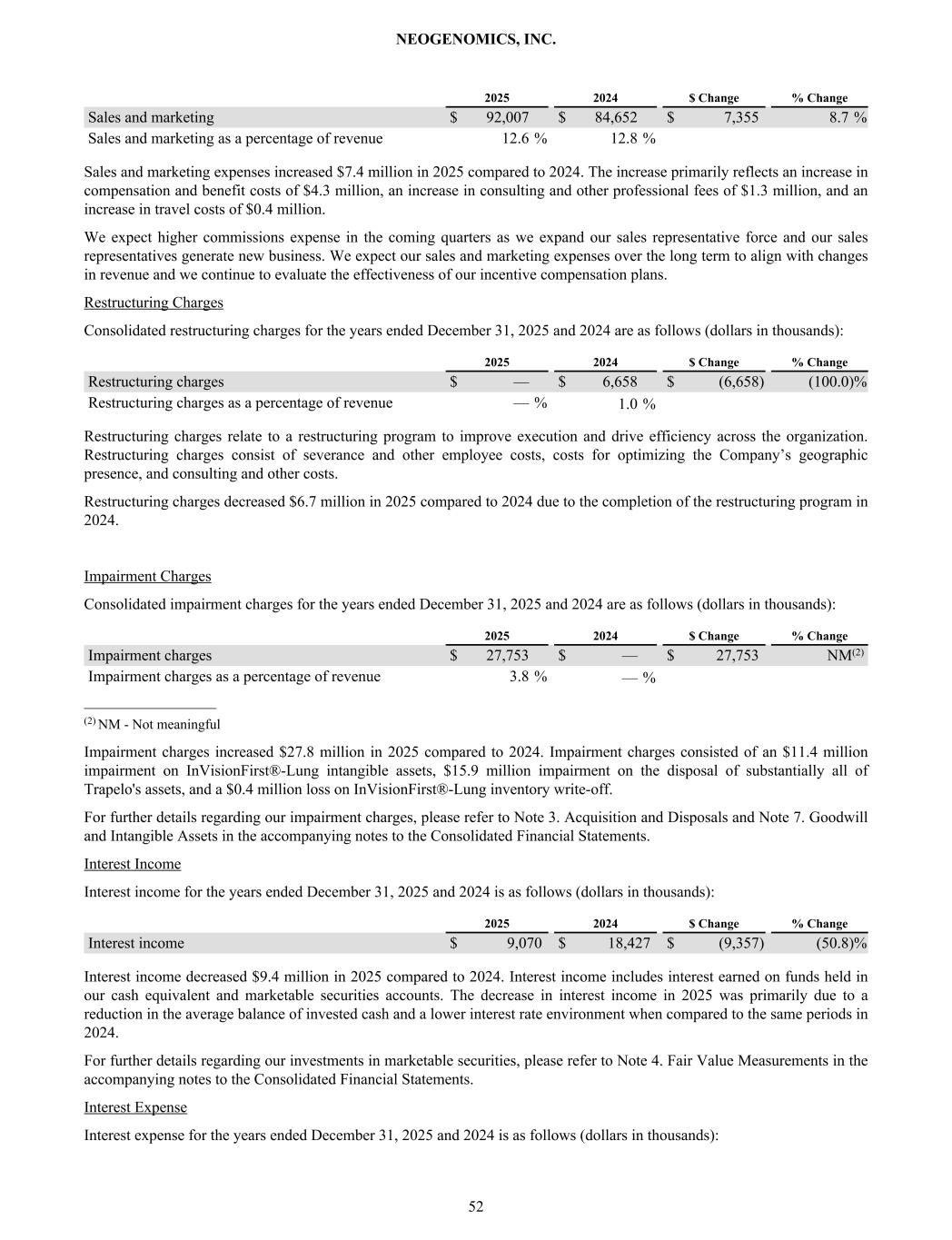 2025 2024 $ Change % Change Sales and marketing $ 92,007 $ 84,652 $ 7,355 8.7 % Sales and marketing as a percentage of revenue 12.6 % 12.8 % Sales and marketing expenses increased $7.4 million in 2025 compared to 2024. The increase primarily reflects an increase in compensation and benefit costs of $4.3 million, an increase in consulting and other professional fees of $1.3 million, and an increase in travel costs of $0.4 million. We expect higher commissions expense in the coming quarters as we expand our sales representative force and our sales representatives generate new business. We expect our sales and marketing expenses over the long term to align with changes in revenue and we continue to evaluate the effectiveness of our incentive compensation plans. Restructuring Charges Consolidated restructuring charges for the years ended December 31, 2025 and 2024 are as follows (dollars in thousands): 2025 2024 $ Change % Change Restructuring charges $ — $ 6,658 $ (6,658) (100.0) % Restructuring charges as a percentage of revenue — % 1.0 % Restructuring charges relate to a restructuring program to improve execution and drive efficiency across the organization. Restructuring charges consist of severance and other employee costs, costs for optimizing the Company’s geographic presence, and consulting and other costs. Restructuring charges decreased $6.7 million in 2025 compared to 2024 due to the completion of the restructuring program in 2024. Impairment Charges Consolidated impairment charges for the years ended December 31, 2025 and 2024 are as follows (dollars in thousands): 2025 2024 $ Change % Change Impairment charges $ 27,753 $ — $ 27,753 NM(2) Impairment charges as a percentage of revenue 3.8 % — % _________________ (2) NM - Not meaningful Impairment charges increased $27.8 million in 2025 compared to 2024. Impairment charges consisted of an $11.4 million impairment on InVisionFirst®-Lung intangible assets, $15.9 million impairment on the disposal of substantially all of Trapelo's assets, and a $0.4 million loss on InVisionFirst®-Lung inventory write-off. For further details regarding our impairment charges, please refer to Note 3. Acquisition and Disposals and Note 7. Goodwill and Intangible Assets in the accompanying notes to the Consolidated Financial Statements. Interest Income Interest income for the years ended December 31, 2025 and 2024 is as follows (dollars in thousands): 2025 2024 $ Change % Change Interest income $ 9,070 $ 18,427 $ (9,357) (50.8) % Interest income decreased $9.4 million in 2025 compared to 2024. Interest income includes interest earned on funds held in our cash equivalent and marketable securities accounts. The decrease in interest income in 2025 was primarily due to a reduction in the average balance of invested cash and a lower interest rate environment when compared to the same periods in 2024. For further details regarding our investments in marketable securities, please refer to Note 4. Fair Value Measurements in the accompanying notes to the Consolidated Financial Statements. Interest Expense Interest expense for the years ended December 31, 2025 and 2024 is as follows (dollars in thousands): NEOGENOMICS, INC. 52