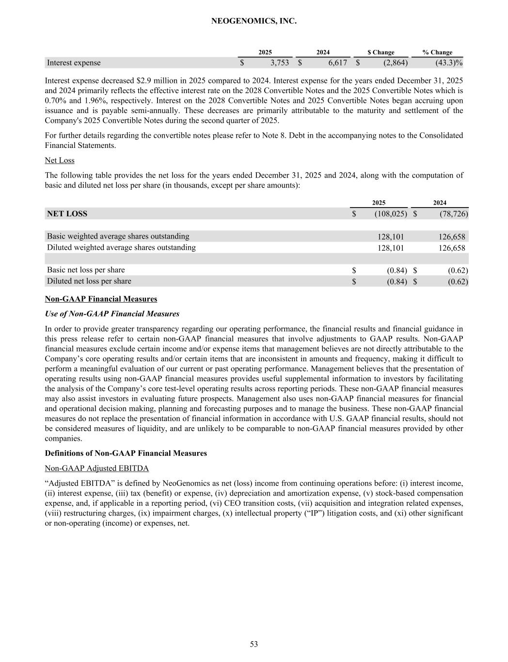 2025 2024 $ Change % Change Interest expense $ 3,753 $ 6,617 $ (2,864) (43.3) % Interest expense decreased $2.9 million in 2025 compared to 2024. Interest expense for the years ended December 31, 2025 and 2024 primarily reflects the effective interest rate on the 2028 Convertible Notes and the 2025 Convertible Notes which is 0.70% and 1.96%, respectively. Interest on the 2028 Convertible Notes and 2025 Convertible Notes began accruing upon issuance and is payable semi-annually. These decreases are primarily attributable to the maturity and settlement of the Company's 2025 Convertible Notes during the second quarter of 2025. For further details regarding the convertible notes please refer to Note 8. Debt in the accompanying notes to the Consolidated Financial Statements. Net Loss The following table provides the net loss for the years ended December 31, 2025 and 2024, along with the computation of basic and diluted net loss per share (in thousands, except per share amounts): 2025 2024 NET LOSS $ (108,025) $ (78,726) Basic weighted average shares outstanding 128,101 126,658 Diluted weighted average shares outstanding 128,101 126,658 Basic net loss per share $ (0.84) $ (0.62) Diluted net loss per share $ (0.84) $ (0.62) Non-GAAP Financial Measures Use of Non-GAAP Financial Measures In order to provide greater transparency regarding our operating performance, the financial results and financial guidance in this press release refer to certain non-GAAP financial measures that involve adjustments to GAAP results. Non-GAAP financial measures exclude certain income and/or expense items that management believes are not directly attributable to the Company’s core operating results and/or certain items that are inconsistent in amounts and frequency, making it difficult to perform a meaningful evaluation of our current or past operating performance. Management believes that the presentation of operating results using non-GAAP financial measures provides useful supplemental information to investors by facilitating the analysis of the Company’s core test-level operating results across reporting periods. These non-GAAP financial measures may also assist investors in evaluating future prospects. Management also uses non-GAAP financial measures for financial and operational decision making, planning and forecasting purposes and to manage the business. These non-GAAP financial measures do not replace the presentation of financial information in accordance with U.S. GAAP financial results, should not be considered measures of liquidity, and are unlikely to be comparable to non-GAAP financial measures provided by other companies. Definitions of Non-GAAP Financial Measures Non-GAAP Adjusted EBITDA “Adjusted EBITDA” is defined by NeoGenomics as net (loss) income from continuing operations before: (i) interest income, (ii) interest expense, (iii) tax (benefit) or expense, (iv) depreciation and amortization expense, (v) stock-based compensation expense, and, if applicable in a reporting period, (vi) CEO transition costs, (vii) acquisition and integration related expenses, (viii) restructuring charges, (ix) impairment charges, (x) intellectual property (“IP”) litigation costs, and (xi) other significant or non-operating (income) or expenses, net. NEOGENOMICS, INC. 53