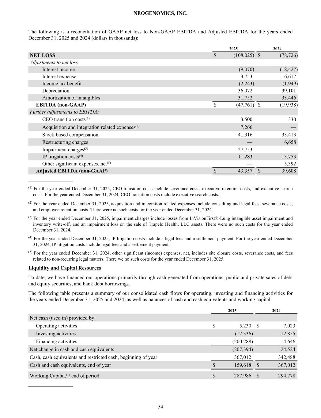 The following is a reconciliation of GAAP net loss to Non-GAAP EBITDA and Adjusted EBITDA for the years ended December 31, 2025 and 2024 (dollars in thousands): 2025 2024 NET LOSS $ (108,025) $ (78,726) Adjustments to net loss Interest income (9,070) (18,427) Interest expense 3,753 6,617 Income tax benefit (2,243) (1,949) Depreciation 36,072 39,101 Amortization of intangibles 31,752 33,446 EBITDA (non-GAAP) $ (47,761) $ (19,938) Further adjustments to EBITDA: CEO transition costs(1) 3,500 330 Acquisition and integration related expenses(2) 7,266 — Stock-based compensation 41,316 33,413 Restructuring charges — 6,658 Impairment charges(3) 27,753 — IP litigation costs(4) 11,283 13,753 Other significant expenses, net(5) — 5,392 Adjusted EBITDA (non-GAAP) $ 43,357 $ 39,608 _________________ (1) For the year ended December 31, 2025, CEO transition costs include severance costs, executive retention costs, and executive search costs. For the year ended December 31, 2024, CEO transition costs include executive search costs. (2) For the year ended December 31, 2025, acquisition and integration related expenses include consulting and legal fees, severance costs, and employee retention costs. There were no such costs for the year ended December 31, 2024. (3) For the year ended December 31, 2025, impairment charges include losses from InVisionFirst®-Lung intangible asset impairment and inventory write-off, and an impairment loss on the sale of Trapelo Health, LLC assets. There were no such costs for the year ended December 31, 2024. (4) For the year ended December 31, 2025, IP litigation costs include a legal fees and a settlement payment. For the year ended December 31, 2024, IP litigation costs include legal fees and a settlement payment. (5) For the year ended December 31, 2024, other significant (income) expenses, net, includes site closure costs, severance costs, and fees related to non-recurring legal matters. There we no such costs for the year ended December 31, 2025. Liquidity and Capital Resources To date, we have financed our operations primarily through cash generated from operations, public and private sales of debt and equity securities, and bank debt borrowings. The following table presents a summary of our consolidated cash flows for operating, investing and financing activities for the years ended December 31, 2025 and 2024, as well as balances of cash and cash equivalents and working capital: 2025 2024 Net cash (used in) provided by: Operating activities $ 5,230 $ 7,023 Investing activities (12,336) 12,855 Financing activities (200,288) 4,646 Net change in cash and cash equivalents (207,394) 24,524 Cash, cash equivalents and restricted cash, beginning of year 367,012 342,488 Cash and cash equivalents, end of year $ 159,618 $ 367,012 Working Capital,(1) end of period $ 287,986 $ 294,778 _________________ NEOGENOMICS, INC. 54