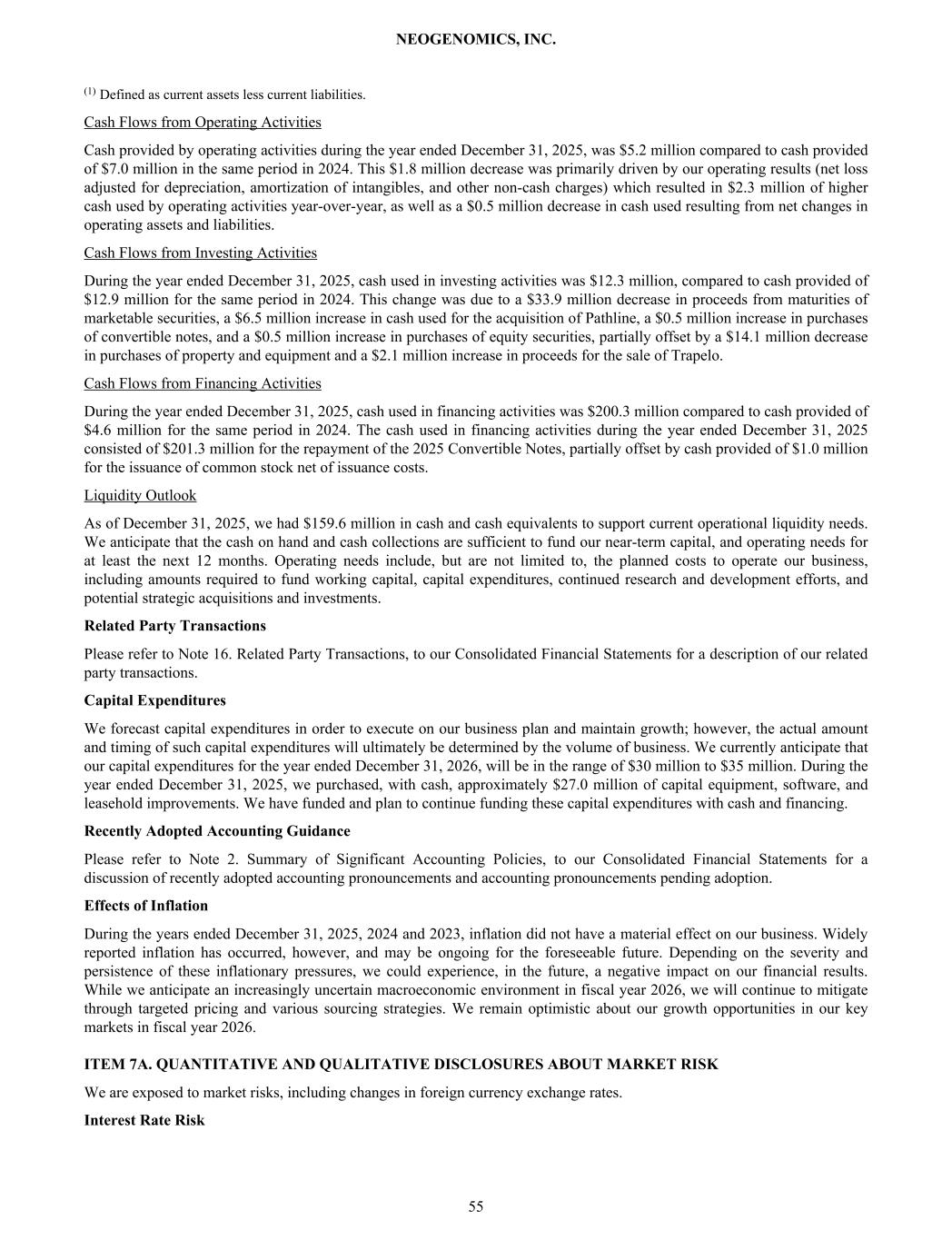 (1) Defined as current assets less current liabilities. Cash Flows from Operating Activities Cash provided by operating activities during the year ended December 31, 2025, was $5.2 million compared to cash provided of $7.0 million in the same period in 2024. This $1.8 million decrease was primarily driven by our operating results (net loss adjusted for depreciation, amortization of intangibles, and other non-cash charges) which resulted in $2.3 million of higher cash used by operating activities year-over-year, as well as a $0.5 million decrease in cash used resulting from net changes in operating assets and liabilities. Cash Flows from Investing Activities During the year ended December 31, 2025, cash used in investing activities was $12.3 million, compared to cash provided of $12.9 million for the same period in 2024. This change was due to a $33.9 million decrease in proceeds from maturities of marketable securities, a $6.5 million increase in cash used for the acquisition of Pathline, a $0.5 million increase in purchases of convertible notes, and a $0.5 million increase in purchases of equity securities, partially offset by a $14.1 million decrease in purchases of property and equipment and a $2.1 million increase in proceeds for the sale of Trapelo. Cash Flows from Financing Activities During the year ended December 31, 2025, cash used in financing activities was $200.3 million compared to cash provided of $4.6 million for the same period in 2024. The cash used in financing activities during the year ended December 31, 2025 consisted of $201.3 million for the repayment of the 2025 Convertible Notes, partially offset by cash provided of $1.0 million for the issuance of common stock net of issuance costs. Liquidity Outlook As of December 31, 2025, we had $159.6 million in cash and cash equivalents to support current operational liquidity needs. We anticipate that the cash on hand and cash collections are sufficient to fund our near-term capital, and operating needs for at least the next 12 months. Operating needs include, but are not limited to, the planned costs to operate our business, including amounts required to fund working capital, capital expenditures, continued research and development efforts, and potential strategic acquisitions and investments. Related Party Transactions Please refer to Note 16. Related Party Transactions, to our Consolidated Financial Statements for a description of our related party transactions. Capital Expenditures We forecast capital expenditures in order to execute on our business plan and maintain growth; however, the actual amount and timing of such capital expenditures will ultimately be determined by the volume of business. We currently anticipate that our capital expenditures for the year ended December 31, 2026, will be in the range of $30 million to $35 million. During the year ended December 31, 2025, we purchased, with cash, approximately $27.0 million of capital equipment, software, and leasehold improvements. We have funded and plan to continue funding these capital expenditures with cash and financing. Recently Adopted Accounting Guidance Please refer to Note 2. Summary of Significant Accounting Policies, to our Consolidated Financial Statements for a discussion of recently adopted accounting pronouncements and accounting pronouncements pending adoption. Effects of Inflation During the years ended December 31, 2025, 2024 and 2023, inflation did not have a material effect on our business. Widely reported inflation has occurred, however, and may be ongoing for the foreseeable future. Depending on the severity and persistence of these inflationary pressures, we could experience, in the future, a negative impact on our financial results. While we anticipate an increasingly uncertain macroeconomic environment in fiscal year 2026, we will continue to mitigate through targeted pricing and various sourcing strategies. We remain optimistic about our growth opportunities in our key markets in fiscal year 2026. ITEM 7A. QUANTITATIVE AND QUALITATIVE DISCLOSURES ABOUT MARKET RISK We are exposed to market risks, including changes in foreign currency exchange rates. Interest Rate Risk NEOGENOMICS, INC. 55