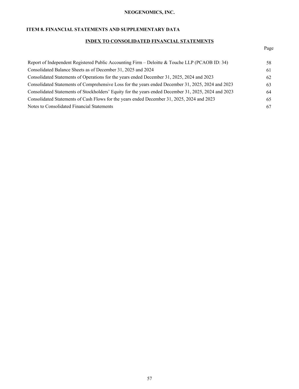 ITEM 8. FINANCIAL STATEMENTS AND SUPPLEMENTARY DATA INDEX TO CONSOLIDATED FINANCIAL STATEMENTS Page Report of Independent Registered Public Accounting Firm – Deloitte & Touche LLP (PCAOB ID: 34) 58 Consolidated Balance Sheets as of December 31, 2025 and 2024 61 Consolidated Statements of Operations for the years ended December 31, 2025, 2024 and 2023 62 Consolidated Statements of Comprehensive Loss for the years ended December 31, 2025, 2024 and 2023 63 Consolidated Statements of Stockholders’ Equity for the years ended December 31, 2025, 2024 and 2023 64 Consolidated Statements of Cash Flows for the years ended December 31, 2025, 2024 and 2023 65 Notes to Consolidated Financial Statements 67 NEOGENOMICS, INC. 57