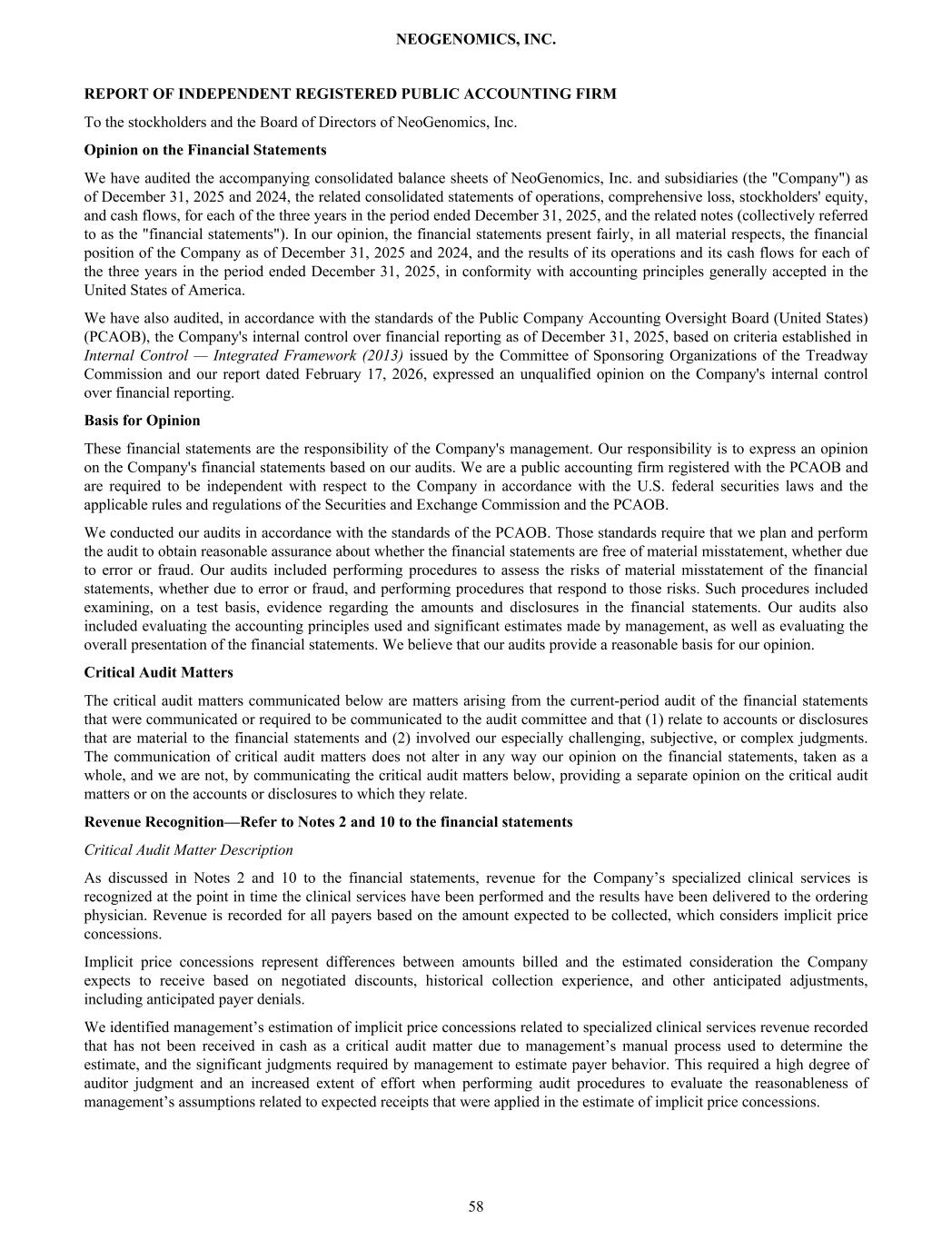 REPORT OF INDEPENDENT REGISTERED PUBLIC ACCOUNTING FIRM To the stockholders and the Board of Directors of NeoGenomics, Inc. Opinion on the Financial Statements We have audited the accompanying consolidated balance sheets of NeoGenomics, Inc. and subsidiaries (the "Company") as of December 31, 2025 and 2024, the related consolidated statements of operations, comprehensive loss, stockholders' equity, and cash flows, for each of the three years in the period ended December 31, 2025, and the related notes (collectively referred to as the "financial statements"). In our opinion, the financial statements present fairly, in all material respects, the financial position of the Company as of December 31, 2025 and 2024, and the results of its operations and its cash flows for each of the three years in the period ended December 31, 2025, in conformity with accounting principles generally accepted in the United States of America. We have also audited, in accordance with the standards of the Public Company Accounting Oversight Board (United States) (PCAOB), the Company's internal control over financial reporting as of December 31, 2025, based on criteria established in Internal Control — Integrated Framework (2013) issued by the Committee of Sponsoring Organizations of the Treadway Commission and our report dated February 17, 2026, expressed an unqualified opinion on the Company's internal control over financial reporting. Basis for Opinion These financial statements are the responsibility of the Company's management. Our responsibility is to express an opinion on the Company's financial statements based on our audits. We are a public accounting firm registered with the PCAOB and are required to be independent with respect to the Company in accordance with the U.S. federal securities laws and the applicable rules and regulations of the Securities and Exchange Commission and the PCAOB. We conducted our audits in accordance with the standards of the PCAOB. Those standards require that we plan and perform the audit to obtain reasonable assurance about whether the financial statements are free of material misstatement, whether due to error or fraud. Our audits included performing procedures to assess the risks of material misstatement of the financial statements, whether due to error or fraud, and performing procedures that respond to those risks. Such procedures included examining, on a test basis, evidence regarding the amounts and disclosures in the financial statements. Our audits also included evaluating the accounting principles used and significant estimates made by management, as well as evaluating the overall presentation of the financial statements. We believe that our audits provide a reasonable basis for our opinion. Critical Audit Matters The critical audit matters communicated below are matters arising from the current-period audit of the financial statements that were communicated or required to be communicated to the audit committee and that (1) relate to accounts or disclosures that are material to the financial statements and (2) involved our especially challenging, subjective, or complex judgments. The communication of critical audit matters does not alter in any way our opinion on the financial statements, taken as a whole, and we are not, by communicating the critical audit matters below, providing a separate opinion on the critical audit matters or on the accounts or disclosures to which they relate. Revenue Recognition—Refer to Notes 2 and 10 to the financial statements Critical Audit Matter Description As discussed in Notes 2 and 10 to the financial statements, revenue for the Company’s specialized clinical services is recognized at the point in time the clinical services have been performed and the results have been delivered to the ordering physician. Revenue is recorded for all payers based on the amount expected to be collected, which considers implicit price concessions. Implicit price concessions represent differences between amounts billed and the estimated consideration the Company expects to receive based on negotiated discounts, historical collection experience, and other anticipated adjustments, including anticipated payer denials. We identified management’s estimation of implicit price concessions related to specialized clinical services revenue recorded that has not been received in cash as a critical audit matter due to management’s manual process used to determine the estimate, and the significant judgments required by management to estimate payer behavior. This required a high degree of auditor judgment and an increased extent of effort when performing audit procedures to evaluate the reasonableness of management’s assumptions related to expected receipts that were applied in the estimate of implicit price concessions. NEOGENOMICS, INC. 58