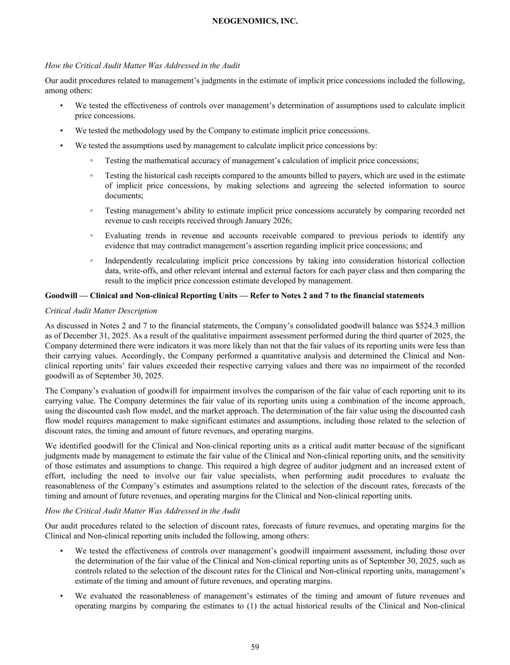How the Critical Audit Matter Was Addressed in the Audit Our audit procedures related to management’s judgments in the estimate of implicit price concessions included the following, among others: • We tested the effectiveness of controls over management’s determination of assumptions used to calculate implicit price concessions. • We tested the methodology used by the Company to estimate implicit price concessions. • We tested the assumptions used by management to calculate implicit price concessions by: ◦ Testing the mathematical accuracy of management’s calculation of implicit price concessions; ◦ Testing the historical cash receipts compared to the amounts billed to payers, which are used in the estimate of implicit price concessions, by making selections and agreeing the selected information to source documents; ◦ Testing management’s ability to estimate implicit price concessions accurately by comparing recorded net revenue to cash receipts received through January 2026; ◦ Evaluating trends in revenue and accounts receivable compared to previous periods to identify any evidence that may contradict management’s assertion regarding implicit price concessions; and ◦ Independently recalculating implicit price concessions by taking into consideration historical collection data, write-offs, and other relevant internal and external factors for each payer class and then comparing the result to the implicit price concession estimate developed by management. Goodwill — Clinical and Non-clinical Reporting Units — Refer to Notes 2 and 7 to the financial statements Critical Audit Matter Description As discussed in Notes 2 and 7 to the financial statements, the Company’s consolidated goodwill balance was $524.3 million as of December 31, 2025. As a result of the qualitative impairment assessment performed during the third quarter of 2025, the Company determined there were indicators it was more likely than not that the fair values of its reporting units were less than their carrying values. Accordingly, the Company performed a quantitative analysis and determined the Clinical and Non- clinical reporting units’ fair values exceeded their respective carrying values and there was no impairment of the recorded goodwill as of September 30, 2025. The Company’s evaluation of goodwill for impairment involves the comparison of the fair value of each reporting unit to its carrying value. The Company determines the fair value of its reporting units using a combination of the income approach, using the discounted cash flow model, and the market approach. The determination of the fair value using the discounted cash flow model requires management to make significant estimates and assumptions, including those related to the selection of discount rates, the timing and amount of future revenues, and operating margins. We identified goodwill for the Clinical and Non-clinical reporting units as a critical audit matter because of the significant judgments made by management to estimate the fair value of the Clinical and Non-clinical reporting units, and the sensitivity of those estimates and assumptions to change. This required a high degree of auditor judgment and an increased extent of effort, including the need to involve our fair value specialists, when performing audit procedures to evaluate the reasonableness of the Company’s estimates and assumptions related to the selection of the discount rates, forecasts of the timing and amount of future revenues, and operating margins for the Clinical and Non-clinical reporting units. How the Critical Audit Matter Was Addressed in the Audit Our audit procedures related to the selection of discount rates, forecasts of future revenues, and operating margins for the Clinical and Non-clinical reporting units included the following, among others: • We tested the effectiveness of controls over management’s goodwill impairment assessment, including those over the determination of the fair value of the Clinical and Non-clinical reporting units as of September 30, 2025, such as controls related to the selection of the discount rates for the Clinical and Non-clinical reporting units, management’s estimate of the timing and amount of future revenues, and operating margins. • We evaluated the reasonableness of management’s estimates of the timing and amount of future revenues and operating margins by comparing the estimates to (1) the actual historical results of the Clinical and Non-clinical NEOGENOMICS, INC. 59