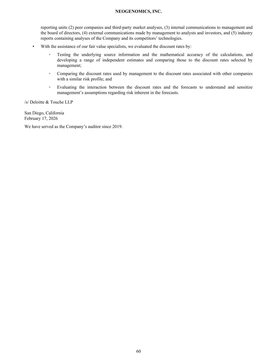 reporting units (2) peer companies and third-party market analyses, (3) internal communications to management and the board of directors, (4) external communications made by management to analysts and investors, and (5) industry reports containing analyses of the Company and its competitors’ technologies. • With the assistance of our fair value specialists, we evaluated the discount rates by: ◦ Testing the underlying source information and the mathematical accuracy of the calculations, and developing a range of independent estimates and comparing those to the discount rates selected by management; ◦ Comparing the discount rates used by management to the discount rates associated with other companies with a similar risk profile; and ◦ Evaluating the interaction between the discount rates and the forecasts to understand and sensitize management’s assumptions regarding risk inherent in the forecasts. /s/ Deloitte & Touche LLP San Diego, California February 17, 2026 We have served as the Company’s auditor since 2019. NEOGENOMICS, INC. 60