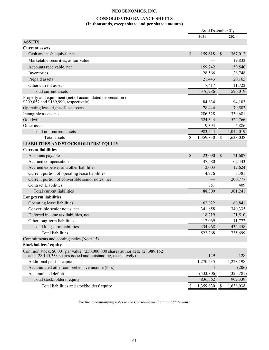 CONSOLIDATED BALANCE SHEETS (In thousands, except share and per share amounts) As of December 31, 2025 2024 ASSETS Current assets Cash and cash equivalents $ 159,618 $ 367,012 Marketable securities, at fair value — 19,832 Accounts receivable, net 159,242 150,540 Inventories 28,566 26,748 Prepaid assets 21,443 20,165 Other current assets 7,417 11,722 Total current assets 376,286 596,019 Property and equipment (net of accumulated depreciation of $209,057 and $189,990, respectively) 84,834 94,103 Operating lease right-of-use assets 78,444 79,583 Intangible assets, net 286,528 339,681 Goodwill 524,344 522,766 Other assets 9,394 5,886 Total non-current assets 983,544 1,042,019 Total assets $ 1,359,830 $ 1,638,038 LIABILITIES AND STOCKHOLDERS’ EQUITY Current liabilities Accounts payable $ 23,090 $ 21,607 Accrued compensation 47,580 62,443 Accrued expenses and other liabilities 12,003 12,624 Current portion of operating lease liabilities 4,776 3,381 Current portion of convertible senior notes, net — 200,777 Contract Liabilities 851 409 Total current liabilities 88,300 301,241 Long-term liabilities Operating lease liabilities 62,822 60,841 Convertible senior notes, net 341,858 340,335 Deferred income tax liabilities, net 18,219 21,510 Other long-term liabilities 12,069 11,772 Total long-term liabilities 434,968 434,458 Total liabilities 523,268 735,699 Commitments and contingencies (Note 15) Stockholders’ equity Common stock, $0.001 par value, (250,000,000 shares authorized; 128,989,152 and 128,145,333 shares issued and outstanding, respectively) 129 128 Additional paid-in capital 1,270,235 1,228,198 Accumulated other comprehensive income (loss) 4 (206) Accumulated deficit (433,806) (325,781) Total stockholders’ equity 836,562 902,339 Total liabilities and stockholders' equity $ 1,359,830 $ 1,638,038 See the accompanying notes to the Consolidated Financial Statements. NEOGENOMICS, INC. 61