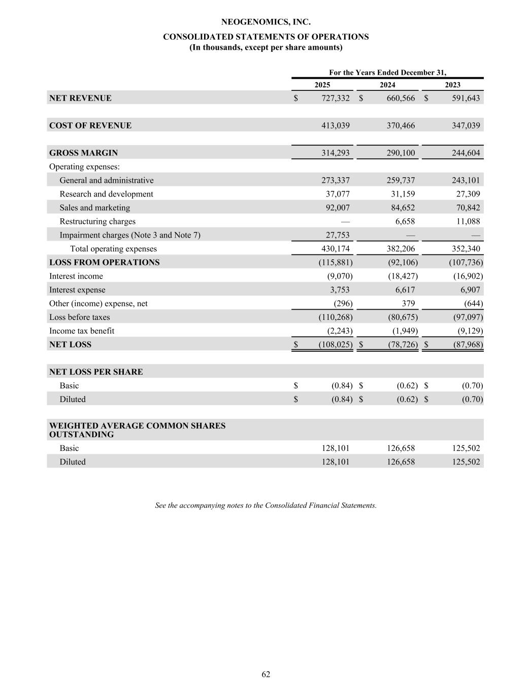 CONSOLIDATED STATEMENTS OF OPERATIONS (In thousands, except per share amounts) For the Years Ended December 31, 2025 2024 2023 NET REVENUE $ 727,332 $ 660,566 $ 591,643 COST OF REVENUE 413,039 370,466 347,039 GROSS MARGIN 314,293 290,100 244,604 Operating expenses: General and administrative 273,337 259,737 243,101 Research and development 37,077 31,159 27,309 Sales and marketing 92,007 84,652 70,842 Restructuring charges — 6,658 11,088 Impairment charges (Note 3 and Note 7) 27,753 — — Total operating expenses 430,174 382,206 352,340 LOSS FROM OPERATIONS (115,881) (92,106) (107,736) Interest income (9,070) (18,427) (16,902) Interest expense 3,753 6,617 6,907 Other (income) expense, net (296) 379 (644) Loss before taxes (110,268) (80,675) (97,097) Income tax benefit (2,243) (1,949) (9,129) NET LOSS $ (108,025) $ (78,726) $ (87,968) NET LOSS PER SHARE Basic $ (0.84) $ (0.62) $ (0.70) Diluted $ (0.84) $ (0.62) $ (0.70) WEIGHTED AVERAGE COMMON SHARES OUTSTANDING Basic 128,101 126,658 125,502 Diluted 128,101 126,658 125,502 See the accompanying notes to the Consolidated Financial Statements. NEOGENOMICS, INC. 62
