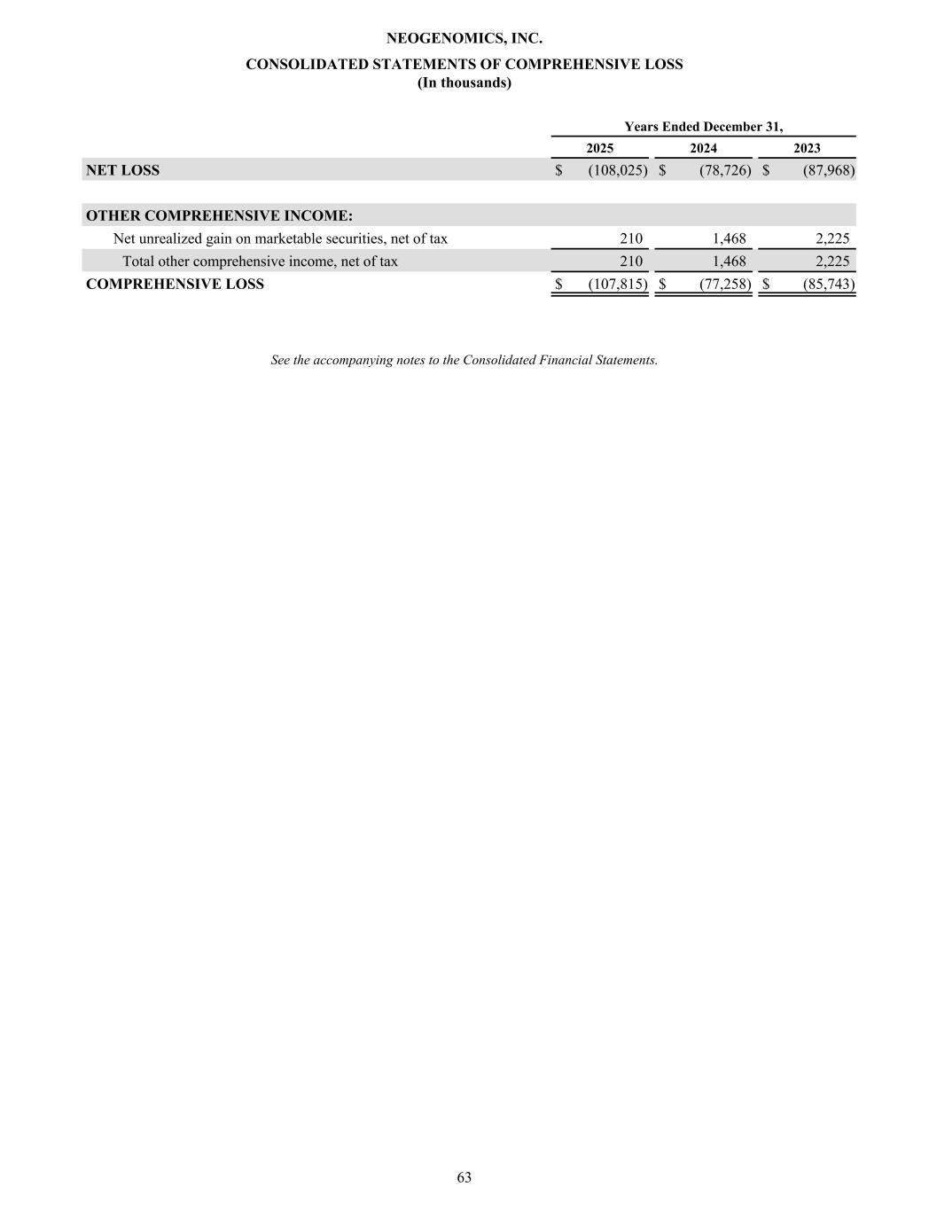CONSOLIDATED STATEMENTS OF COMPREHENSIVE LOSS (In thousands) Years Ended December 31, 2025 2024 2023 NET LOSS $ (108,025) $ (78,726) $ (87,968) OTHER COMPREHENSIVE INCOME: Net unrealized gain on marketable securities, net of tax 210 1,468 2,225 Total other comprehensive income, net of tax 210 1,468 2,225 COMPREHENSIVE LOSS $ (107,815) $ (77,258) $ (85,743) See the accompanying notes to the Consolidated Financial Statements. NEOGENOMICS, INC. 63