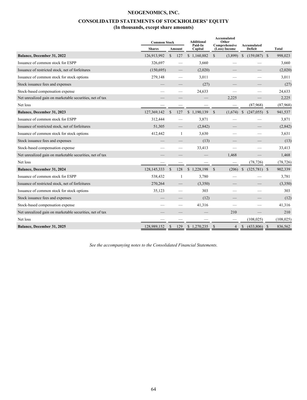 CONSOLIDATED STATEMENTS OF STOCKHOLDERS’ EQUITY (In thousands, except share amounts) Common Stock Additional Paid-In Capital Accumulated Other Comprehensive (Loss) Income Accumulated Deficit Shares Amount Total Balance, December 31, 2022 126,913,992 $ 127 $ 1,160,882 $ (3,899) $ (159,087) $ 998,023 Issuance of common stock for ESPP 326,697 — 3,660 — — 3,660 Issuance of restricted stock, net of forfeitures (150,695) — (2,020) — — (2,020) Issuance of common stock for stock options 279,148 — 3,011 — — 3,011 Stock issuance fees and expenses — — (27) — — (27) Stock-based compensation expense — — 24,633 — — 24,633 Net unrealized gain on marketable securities, net of tax — — — 2,225 — 2,225 Net loss — — — — (87,968) (87,968) Balance, December 31, 2023 127,369,142 $ 127 $ 1,190,139 $ (1,674) $ (247,055) $ 941,537 Issuance of common stock for ESPP 312,444 — 3,871 — — 3,871 Issuance of restricted stock, net of forfeitures 51,305 — (2,842) — — (2,842) Issuance of common stock for stock options 412,442 1 3,630 — — 3,631 Stock issuance fees and expenses — — (13) — — (13) Stock-based compensation expense — — 33,413 — — 33,413 Net unrealized gain on marketable securities, net of tax — — — 1,468 — 1,468 Net loss — — — — (78,726) (78,726) Balance, December 31, 2024 128,145,333 $ 128 $ 1,228,198 $ (206) $ (325,781) $ 902,339 Issuance of common stock for ESPP 538,432 1 3,780 — — 3,781 Issuance of restricted stock, net of forfeitures 270,264 — (3,350) — — (3,350) Issuance of common stock for stock options 35,123 — 303 — — 303 Stock issuance fees and expenses — — (12) — — (12) Stock-based compensation expense — — 41,316 — — 41,316 Net unrealized gain on marketable securities, net of tax — — — 210 — 210 Net loss — — — — (108,025) (108,025) Balance, December 31, 2025 128,989,152 $ 129 $ 1,270,235 $ 4 $ (433,806) $ 836,562 See the accompanying notes to the Consolidated Financial Statements. NEOGENOMICS, INC. 64