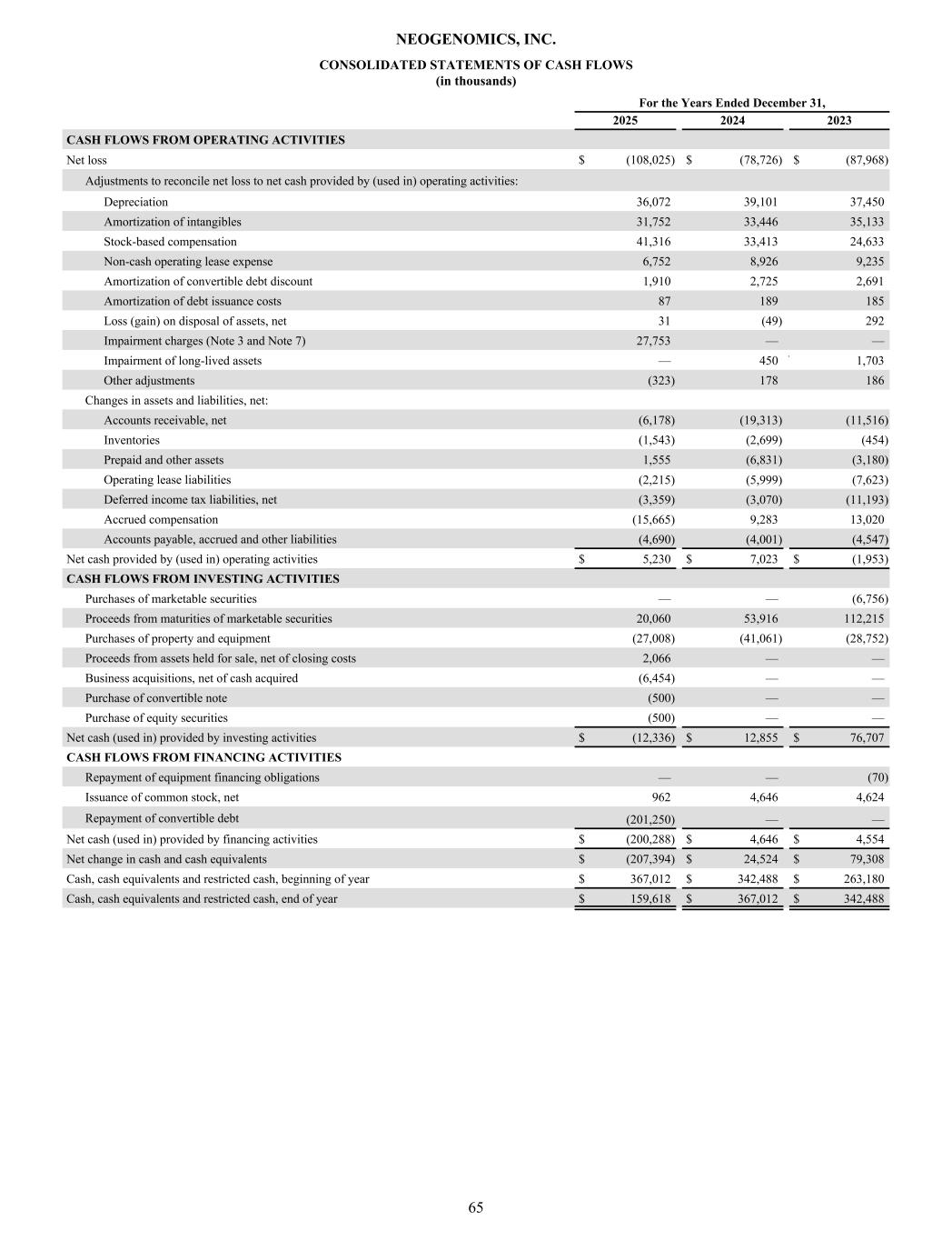 CONSOLIDATED STATEMENTS OF CASH FLOWS (in thousands) For the Years Ended December 31, 2025 2024 2023 CASH FLOWS FROM OPERATING ACTIVITIES Net loss $ (108,025) $ (78,726) $ (87,968) Adjustments to reconcile net loss to net cash provided by (used in) operating activities: Depreciation 36,072 39,101 37,450 Amortization of intangibles 31,752 33,446 35,133 Stock-based compensation 41,316 33,413 24,633 Non-cash operating lease expense 6,752 8,926 9,235 Amortization of convertible debt discount 1,910 2,725 2,691 Amortization of debt issuance costs 87 189 185 Loss (gain) on disposal of assets, net 31 (49) 292 Impairment charges (Note 3 and Note 7) 27,753 — — Impairment of long-lived assets — 450 ` 1,703 Other adjustments (323) 178 186 Changes in assets and liabilities, net: Accounts receivable, net (6,178) (19,313) (11,516) Inventories (1,543) (2,699) (454) Prepaid and other assets 1,555 (6,831) (3,180) Operating lease liabilities (2,215) (5,999) (7,623) Deferred income tax liabilities, net (3,359) (3,070) (11,193) Accrued compensation (15,665) 9,283 13,020 Accounts payable, accrued and other liabilities (4,690) (4,001) (4,547) Net cash provided by (used in) operating activities $ 5,230 $ 7,023 $ (1,953) CASH FLOWS FROM INVESTING ACTIVITIES Purchases of marketable securities — — (6,756) Proceeds from maturities of marketable securities 20,060 53,916 112,215 Purchases of property and equipment (27,008) (41,061) (28,752) Proceeds from assets held for sale, net of closing costs 2,066 — — Business acquisitions, net of cash acquired (6,454) — — Purchase of convertible note (500) — — Purchase of equity securities (500) — — Net cash (used in) provided by investing activities $ (12,336) $ 12,855 $ 76,707 CASH FLOWS FROM FINANCING ACTIVITIES Repayment of equipment financing obligations — — (70) Issuance of common stock, net 962 4,646 4,624 Repayment of convertible debt (201,250) — — Net cash (used in) provided by financing activities $ (200,288) $ 4,646 $ 4,554 Net change in cash and cash equivalents $ (207,394) $ 24,524 $ 79,308 Cash, cash equivalents and restricted cash, beginning of year $ 367,012 $ 342,488 $ 263,180 Cash, cash equivalents and restricted cash, end of year $ 159,618 $ 367,012 $ 342,488 NEOGENOMICS, INC. 65