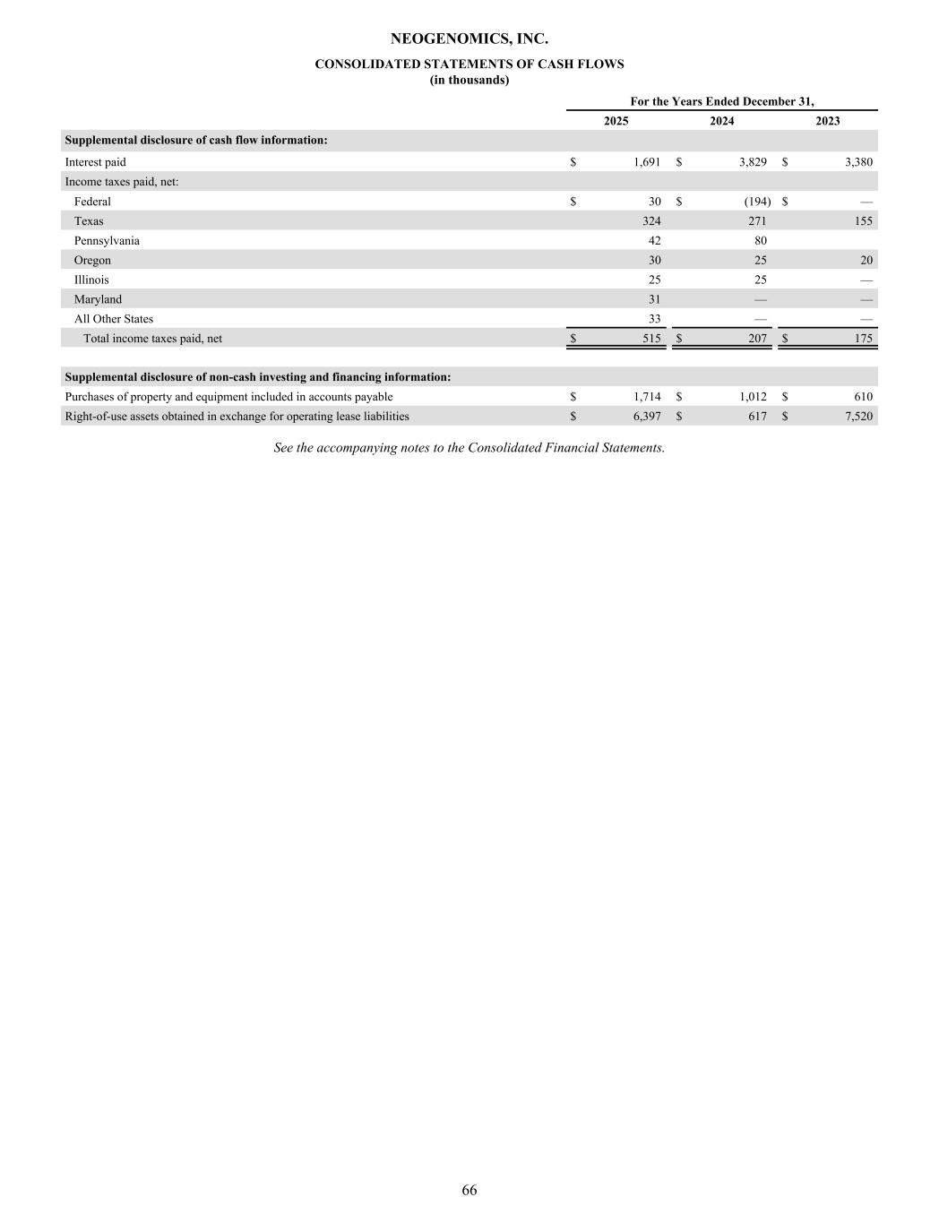 CONSOLIDATED STATEMENTS OF CASH FLOWS (in thousands) For the Years Ended December 31, 2025 2024 2023 Supplemental disclosure of cash flow information: Interest paid $ 1,691 $ 3,829 $ 3,380 Income taxes paid, net: Federal $ 30 $ (194) $ — Texas 324 271 155 Pennsylvania 42 80 Oregon 30 25 20 Illinois 25 25 — Maryland 31 — — All Other States 33 — — Total income taxes paid, net $ 515 $ 207 $ 175 Supplemental disclosure of non-cash investing and financing information: Purchases of property and equipment included in accounts payable $ 1,714 $ 1,012 $ 610 Right-of-use assets obtained in exchange for operating lease liabilities $ 6,397 $ 617 $ 7,520 See the accompanying notes to the Consolidated Financial Statements. NEOGENOMICS, INC. 66