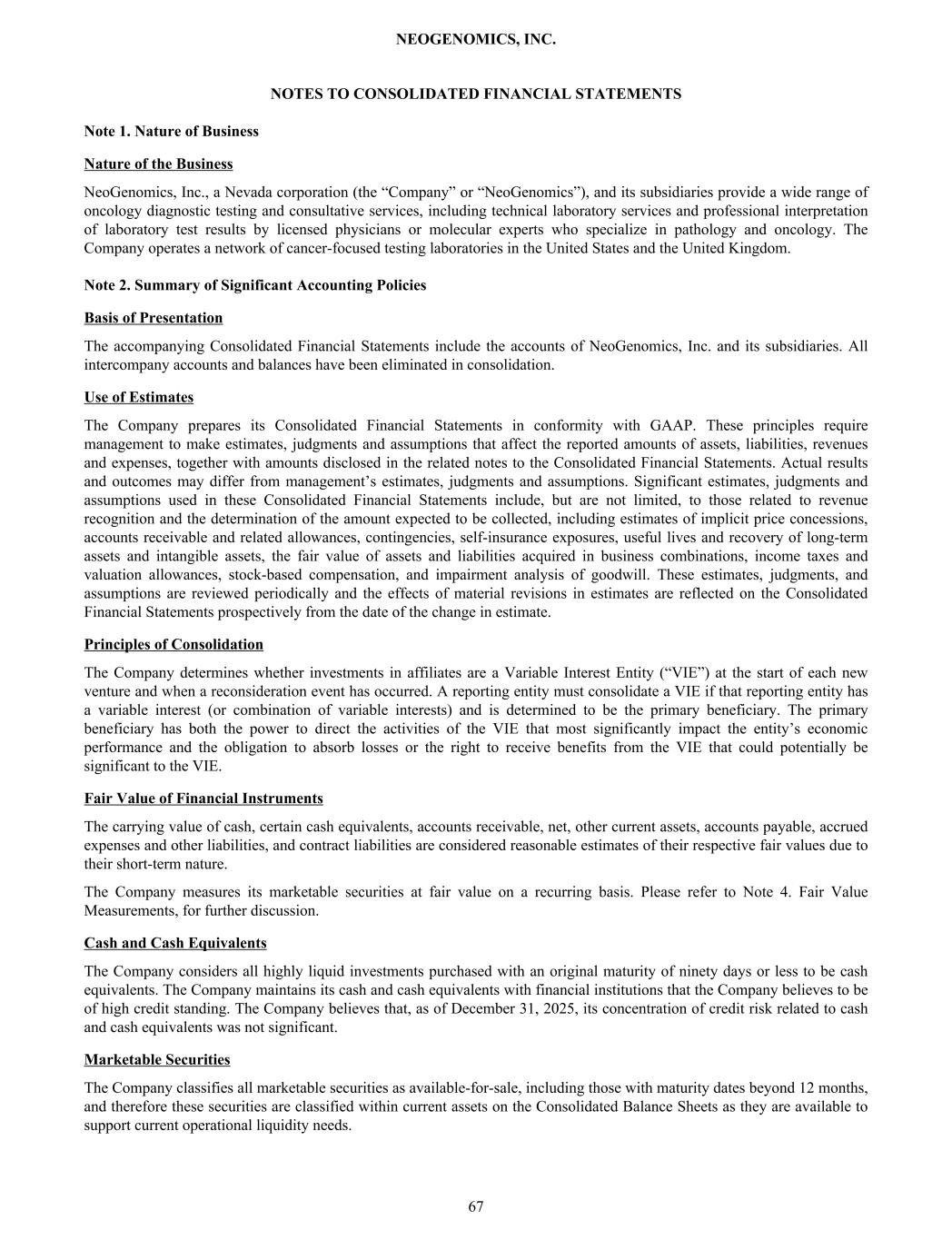 NOTES TO CONSOLIDATED FINANCIAL STATEMENTS Note 1. Nature of Business Nature of the Business NeoGenomics, Inc., a Nevada corporation (the “Company” or “NeoGenomics”), and its subsidiaries provide a wide range of oncology diagnostic testing and consultative services, including technical laboratory services and professional interpretation of laboratory test results by licensed physicians or molecular experts who specialize in pathology and oncology. The Company operates a network of cancer-focused testing laboratories in the United States and the United Kingdom. Note 2. Summary of Significant Accounting Policies Basis of Presentation The accompanying Consolidated Financial Statements include the accounts of NeoGenomics, Inc. and its subsidiaries. All intercompany accounts and balances have been eliminated in consolidation. Use of Estimates The Company prepares its Consolidated Financial Statements in conformity with GAAP. These principles require management to make estimates, judgments and assumptions that affect the reported amounts of assets, liabilities, revenues and expenses, together with amounts disclosed in the related notes to the Consolidated Financial Statements. Actual results and outcomes may differ from management’s estimates, judgments and assumptions. Significant estimates, judgments and assumptions used in these Consolidated Financial Statements include, but are not limited, to those related to revenue recognition and the determination of the amount expected to be collected, including estimates of implicit price concessions, accounts receivable and related allowances, contingencies, self-insurance exposures, useful lives and recovery of long-term assets and intangible assets, the fair value of assets and liabilities acquired in business combinations, income taxes and valuation allowances, stock-based compensation, and impairment analysis of goodwill. These estimates, judgments, and assumptions are reviewed periodically and the effects of material revisions in estimates are reflected on the Consolidated Financial Statements prospectively from the date of the change in estimate. Principles of Consolidation The Company determines whether investments in affiliates are a Variable Interest Entity (“VIE”) at the start of each new venture and when a reconsideration event has occurred. A reporting entity must consolidate a VIE if that reporting entity has a variable interest (or combination of variable interests) and is determined to be the primary beneficiary. The primary beneficiary has both the power to direct the activities of the VIE that most significantly impact the entity’s economic performance and the obligation to absorb losses or the right to receive benefits from the VIE that could potentially be significant to the VIE. Fair Value of Financial Instruments The carrying value of cash, certain cash equivalents, accounts receivable, net, other current assets, accounts payable, accrued expenses and other liabilities, and contract liabilities are considered reasonable estimates of their respective fair values due to their short-term nature. The Company measures its marketable securities at fair value on a recurring basis. Please refer to Note 4. Fair Value Measurements, for further discussion. Cash and Cash Equivalents The Company considers all highly liquid investments purchased with an original maturity of ninety days or less to be cash equivalents. The Company maintains its cash and cash equivalents with financial institutions that the Company believes to be of high credit standing. The Company believes that, as of December 31, 2025, its concentration of credit risk related to cash and cash equivalents was not significant. Marketable Securities The Company classifies all marketable securities as available-for-sale, including those with maturity dates beyond 12 months, and therefore these securities are classified within current assets on the Consolidated Balance Sheets as they are available to support current operational liquidity needs. NEOGENOMICS, INC. 67