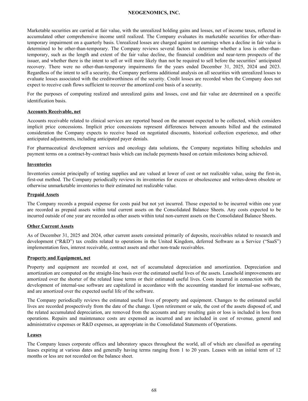 Marketable securities are carried at fair value, with the unrealized holding gains and losses, net of income taxes, reflected in accumulated other comprehensive income until realized. The Company evaluates its marketable securities for other-than- temporary impairment on a quarterly basis. Unrealized losses are charged against net earnings when a decline in fair value is determined to be other-than-temporary. The Company reviews several factors to determine whether a loss is other-than- temporary, such as the length and extent of the fair value decline, the financial condition and near-term prospects of the issuer, and whether there is the intent to sell or will more likely than not be required to sell before the securities’ anticipated recovery. There were no other-than-temporary impairments for the years ended December 31, 2025, 2024 and 2023. Regardless of the intent to sell a security, the Company performs additional analysis on all securities with unrealized losses to evaluate losses associated with the creditworthiness of the security. Credit losses are recorded when the Company does not expect to receive cash flows sufficient to recover the amortized cost basis of a security. For the purposes of computing realized and unrealized gains and losses, cost and fair value are determined on a specific identification basis. Accounts Receivable, net Accounts receivable related to clinical services are reported based on the amount expected to be collected, which considers implicit price concessions. Implicit price concessions represent differences between amounts billed and the estimated consideration the Company expects to receive based on negotiated discounts, historical collection experience, and other anticipated adjustments, including anticipated payer denials. For pharmaceutical development services and oncology data solutions, the Company negotiates billing schedules and payment terms on a contract-by-contract basis which can include payments based on certain milestones being achieved. Inventories Inventories consist principally of testing supplies and are valued at lower of cost or net realizable value, using the first-in, first-out method. The Company periodically reviews its inventories for excess or obsolescence and writes-down obsolete or otherwise unmarketable inventories to their estimated net realizable value. Prepaid Assets The Company records a prepaid expense for costs paid but not yet incurred. Those expected to be incurred within one year are recorded as prepaid assets within total current assets on the Consolidated Balance Sheets. Any costs expected to be incurred outside of one year are recorded as other assets within total non-current assets on the Consolidated Balance Sheets. Other Current Assets As of December 31, 2025 and 2024, other current assets consisted primarily of deposits, receivables related to research and development (“R&D”) tax credits related to operations in the United Kingdom, deferred Software as a Service (“SaaS”) implementation fees, interest receivable, contract assets and other non-trade receivables. Property and Equipment, net Property and equipment are recorded at cost, net of accumulated depreciation and amortization. Depreciation and amortization are computed on the straight-line basis over the estimated useful lives of the assets. Leasehold improvements are amortized over the shorter of the related lease terms or their estimated useful lives. Costs incurred in connection with the development of internal-use software are capitalized in accordance with the accounting standard for internal-use software, and are amortized over the expected useful life of the software. The Company periodically reviews the estimated useful lives of property and equipment. Changes to the estimated useful lives are recorded prospectively from the date of the change. Upon retirement or sale, the cost of the assets disposed of, and the related accumulated depreciation, are removed from the accounts and any resulting gain or loss is included in loss from operations. Repairs and maintenance costs are expensed as incurred and are included in cost of revenue, general and administrative expenses or R&D expenses, as appropriate in the Consolidated Statements of Operations. Leases The Company leases corporate offices and laboratory spaces throughout the world, all of which are classified as operating leases expiring at various dates and generally having terms ranging from 1 to 20 years. Leases with an initial term of 12 months or less are not recorded on the balance sheet. NEOGENOMICS, INC. 68