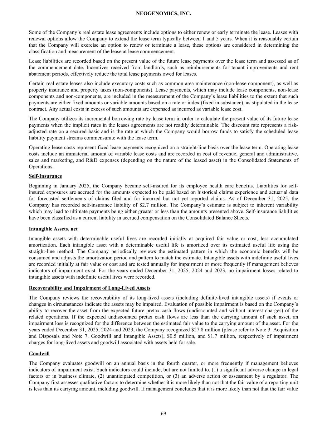 Some of the Company’s real estate lease agreements include options to either renew or early terminate the lease. Leases with renewal options allow the Company to extend the lease term typically between 1 and 5 years. When it is reasonably certain that the Company will exercise an option to renew or terminate a lease, these options are considered in determining the classification and measurement of the lease at lease commencement. Lease liabilities are recorded based on the present value of the future lease payments over the lease term and assessed as of the commencement date. Incentives received from landlords, such as reimbursements for tenant improvements and rent abatement periods, effectively reduce the total lease payments owed for leases. Certain real estate leases also include executory costs such as common area maintenance (non-lease component), as well as property insurance and property taxes (non-components). Lease payments, which may include lease components, non-lease components and non-components, are included in the measurement of the Company’s lease liabilities to the extent that such payments are either fixed amounts or variable amounts based on a rate or index (fixed in substance), as stipulated in the lease contract. Any actual costs in excess of such amounts are expensed as incurred as variable lease cost. The Company utilizes its incremental borrowing rate by lease term in order to calculate the present value of its future lease payments when the implicit rates in the leases agreements are not readily determinable. The discount rate represents a risk- adjusted rate on a secured basis and is the rate at which the Company would borrow funds to satisfy the scheduled lease liability payment streams commensurate with the lease term. Operating lease costs represent fixed lease payments recognized on a straight-line basis over the lease term. Operating lease costs include an immaterial amount of variable lease costs and are recorded in cost of revenue, general and administrative, sales and marketing, and R&D expenses (depending on the nature of the leased asset) in the Consolidated Statements of Operations. Self-Insurance Beginning in January 2025, the Company became self-insured for its employee health care benefits. Liabilities for self- insured exposures are accrued for the amounts expected to be paid based on historical claims experience and actuarial data for forecasted settlements of claims filed and for incurred but not yet reported claims. As of December 31, 2025, the Company has recorded self-insurance liability of $2.7 million. The Company’s estimate is subject to inherent variability which may lead to ultimate payments being either greater or less than the amounts presented above. Self-insurance liabilities have been classified as a current liability in accrued compensation on the Consolidated Balance Sheets. Intangible Assets, net Intangible assets with determinable useful lives are recorded initially at acquired fair value or cost, less accumulated amortization. Each intangible asset with a determinable useful life is amortized over its estimated useful life using the straight-line method. The Company periodically reviews the estimated pattern in which the economic benefits will be consumed and adjusts the amortization period and pattern to match the estimate. Intangible assets with indefinite useful lives are recorded initially at fair value or cost and are tested annually for impairment or more frequently if management believes indicators of impairment exist. For the years ended December 31, 2025, 2024 and 2023, no impairment losses related to intangible assets with indefinite useful lives were recorded. Recoverability and Impairment of Long-Lived Assets The Company reviews the recoverability of its long-lived assets (including definite-lived intangible assets) if events or changes in circumstances indicate the assets may be impaired. Evaluation of possible impairment is based on the Company’s ability to recover the asset from the expected future pretax cash flows (undiscounted and without interest charges) of the related operations. If the expected undiscounted pretax cash flows are less than the carrying amount of such asset, an impairment loss is recognized for the difference between the estimated fair value to the carrying amount of the asset. For the years ended December 31, 2025, 2024 and 2023, the Company recognized $27.8 million (please refer to Note 3. Acquisition and Disposals and Note 7. Goodwill and Intangible Assets), $0.5 million, and $1.7 million, respectively of impairment charges for long-lived assets and goodwill associated with assets held for sale. Goodwill The Company evaluates goodwill on an annual basis in the fourth quarter, or more frequently if management believes indicators of impairment exist. Such indicators could include, but are not limited to, (1) a significant adverse change in legal factors or in business climate, (2) unanticipated competition, or (3) an adverse action or assessment by a regulator. The Company first assesses qualitative factors to determine whether it is more likely than not that the fair value of a reporting unit is less than its carrying amount, including goodwill. If management concludes that it is more likely than not that the fair value NEOGENOMICS, INC. 69