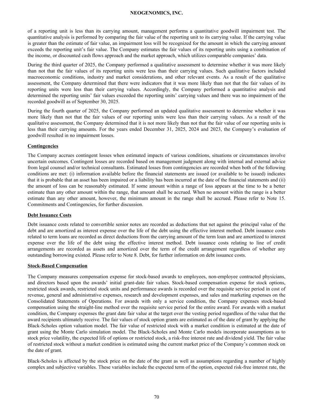 of a reporting unit is less than its carrying amount, management performs a quantitative goodwill impairment test. The quantitative analysis is performed by comparing the fair value of the reporting unit to its carrying value. If the carrying value is greater than the estimate of fair value, an impairment loss will be recognized for the amount in which the carrying amount exceeds the reporting unit’s fair value. The Company estimates the fair values of its reporting units using a combination of the income, or discounted cash flows approach and the market approach, which utilizes comparable companies’ data. During the third quarter of 2025, the Company performed a qualitative assessment to determine whether it was more likely than not that the fair values of its reporting units were less than their carrying values. Such qualitative factors included macroeconomic conditions, industry and market considerations, and other relevant events. As a result of the qualitative assessment, the Company determined that there were indicators that it was more likely than not that the fair values of its reporting units were less than their carrying values. Accordingly, the Company performed a quantitative analysis and determined the reporting units’ fair values exceeded the reporting units’ carrying values and there was no impairment of the recorded goodwill as of September 30, 2025. During the fourth quarter of 2025, the Company performed an updated qualitative assessment to determine whether it was more likely than not that the fair values of our reporting units were less than their carrying values. As a result of the qualitative assessment, the Company determined that it is not more likely than not that the fair value of our reporting units is less than their carrying amounts. For the years ended December 31, 2025, 2024 and 2023, the Company’s evaluation of goodwill resulted in no impairment losses. Contingencies The Company accrues contingent losses when estimated impacts of various conditions, situations or circumstances involve uncertain outcomes. Contingent losses are recorded based on management judgment along with internal and external advice from legal counsel and/or technical consultants. Estimated losses from contingencies are recorded when both of the following conditions are met: (i) information available before the financial statements are issued (or available to be issued) indicates that it is probable that an asset has been impaired or a liability has been incurred at the date of the financial statements and (ii) the amount of loss can be reasonably estimated. If some amount within a range of loss appears at the time to be a better estimate than any other amount within the range, that amount shall be accrued. When no amount within the range is a better estimate than any other amount, however, the minimum amount in the range shall be accrued. Please refer to Note 15. Commitments and Contingencies, for further discussion. Debt Issuance Costs Debt issuance costs related to convertible senior notes are recorded as deductions that net against the principal value of the debt and are amortized as interest expense over the life of the debt using the effective interest method. Debt issuance costs related to term loans are recorded as direct deductions from the carrying amount of the term loan and are amortized to interest expense over the life of the debt using the effective interest method. Debt issuance costs relating to line of credit arrangements are recorded as assets and amortized over the term of the credit arrangement regardless of whether any outstanding borrowing existed. Please refer to Note 8. Debt, for further information on debt issuance costs. Stock-Based Compensation The Company measures compensation expense for stock-based awards to employees, non-employee contracted physicians, and directors based upon the awards’ initial grant-date fair values. Stock-based compensation expense for stock options, restricted stock awards, restricted stock units and performance awards is recorded over the requisite service period in cost of revenue, general and administrative expenses, research and development expenses, and sales and marketing expenses on the Consolidated Statements of Operations. For awards with only a service condition, the Company expenses stock-based compensation using the straight-line method over the requisite service period for the entire award. For awards with a market condition, the Company expenses the grant date fair value at the target over the vesting period regardless of the value that the award recipients ultimately receive. The fair values of stock option grants are estimated as of the date of grant by applying the Black-Scholes option valuation model. The fair value of restricted stock with a market condition is estimated at the date of grant using the Monte Carlo simulation model. The Black-Scholes and Monte Carlo models incorporate assumptions as to stock price volatility, the expected life of options or restricted stock, a risk-free interest rate and dividend yield. The fair value of restricted stock without a market condition is estimated using the current market price of the Company’s common stock on the date of grant. Black-Scholes is affected by the stock price on the date of the grant as well as assumptions regarding a number of highly complex and subjective variables. These variables include the expected term of the option, expected risk-free interest rate, the NEOGENOMICS, INC. 70