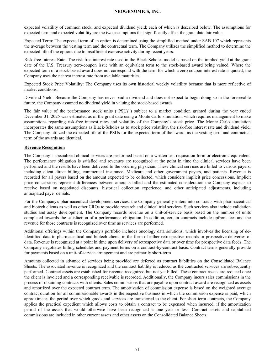 expected volatility of common stock, and expected dividend yield; each of which is described below. The assumptions for expected term and expected volatility are the two assumptions that significantly affect the grant date fair value. Expected Term: The expected term of an option is determined using the simplified method under SAB 107 which represents the average between the vesting term and the contractual term. The Company utilizes the simplified method to determine the expected life of the options due to insufficient exercise activity during recent years. Risk-free Interest Rate: The risk-free interest rate used in the Black-Scholes model is based on the implied yield at the grant date of the U.S. Treasury zero-coupon issue with an equivalent term to the stock-based award being valued. Where the expected term of a stock-based award does not correspond with the term for which a zero coupon interest rate is quoted, the Company uses the nearest interest rate from available maturities. Expected Stock Price Volatility: The Company uses its own historical weekly volatility because that is more reflective of market conditions. Dividend Yield: Because the Company has never paid a dividend and does not expect to begin doing so in the foreseeable future, the Company assumed no dividend yield in valuing the stock-based awards. The fair value of the performance stock units (“PSUs”) subject to a market condition granted during the year ended December 31, 2025 was estimated as of the grant date using a Monte Carlo simulation, which requires management to make assumptions regarding risk-free interest rates and volatility of the Company’s stock price. The Monte Carlo simulation incorporates the same assumptions as Black-Scholes as to stock price volatility, the risk-free interest rate and dividend yield. The Company utilized the expected life of the PSUs for the expected term of the award, as the vesting term and contractual term of the awards are identical. Revenue Recognition The Company’s specialized clinical services are performed based on a written test requisition form or electronic equivalent. The performance obligation is satisfied and revenues are recognized at the point in time the clinical services have been performed and the results have been delivered to the ordering physician. These clinical services are billed to various payers, including client direct billing, commercial insurance, Medicare and other government payers, and patients. Revenue is recorded for all payers based on the amount expected to be collected, which considers implicit price concessions. Implicit price concessions represent differences between amounts billed and the estimated consideration the Company expects to receive based on negotiated discounts, historical collection experience, and other anticipated adjustments, including anticipated payer denials. For the Company's pharmaceutical development services, the Company generally enters into contracts with pharmaceutical and biotech clients as well as other CROs to provide research and clinical trial services. Such services also include validation studies and assay development. The Company records revenue on a unit-of-service basis based on the number of units completed towards the satisfaction of a performance obligation. In addition, certain contracts include upfront fees and the revenue for those contracts is recognized over time as services are performed. Additional offerings within the Company's portfolio includes oncology data solutions, which involves the licensing of de- identified data to pharmaceutical and biotech clients in the form of either retrospective records or prospective deliveries of data. Revenue is recognized at a point in time upon delivery of retrospective data or over time for prospective data feeds. The Company negotiates billing schedules and payment terms on a contract-by-contract basis. Contract terms generally provide for payments based on a unit-of-service arrangement and are primarily short-term. Amounts collected in advance of services being provided are deferred as contract liabilities on the Consolidated Balance Sheets. The associated revenue is recognized and the contract liability is reduced as the contracted services are subsequently performed. Contract assets are established for revenue recognized but not yet billed. These contract assets are reduced once the client is invoiced and a corresponding receivable is recorded. Additionally, the Company incurs sales commissions in the process of obtaining contracts with clients. Sales commissions that are payable upon contract award are recognized as assets and amortized over the expected contract term. The amortization of commission expense is based on the weighted average contract duration for all commissionable awards in the respective business in which the commission expense is paid, which approximates the period over which goods and services are transferred to the client. For short-term contracts, the Company applies the practical expedient which allows costs to obtain a contract to be expensed when incurred, if the amortization period of the assets that would otherwise have been recognized is one year or less. Contract assets and capitalized commissions are included in other current assets and other assets on the Consolidated Balance Sheets. NEOGENOMICS, INC. 71