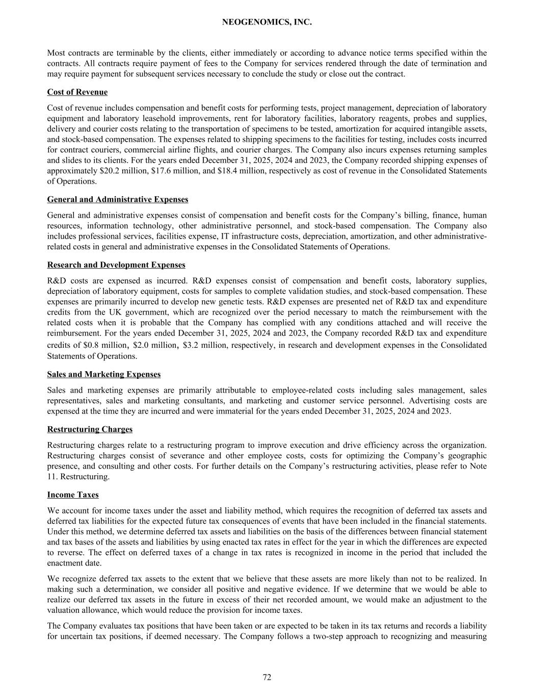 Most contracts are terminable by the clients, either immediately or according to advance notice terms specified within the contracts. All contracts require payment of fees to the Company for services rendered through the date of termination and may require payment for subsequent services necessary to conclude the study or close out the contract. Cost of Revenue Cost of revenue includes compensation and benefit costs for performing tests, project management, depreciation of laboratory equipment and laboratory leasehold improvements, rent for laboratory facilities, laboratory reagents, probes and supplies, delivery and courier costs relating to the transportation of specimens to be tested, amortization for acquired intangible assets, and stock-based compensation. The expenses related to shipping specimens to the facilities for testing, includes costs incurred for contract couriers, commercial airline flights, and courier charges. The Company also incurs expenses returning samples and slides to its clients. For the years ended December 31, 2025, 2024 and 2023, the Company recorded shipping expenses of approximately $20.2 million, $17.6 million, and $18.4 million, respectively as cost of revenue in the Consolidated Statements of Operations. General and Administrative Expenses General and administrative expenses consist of compensation and benefit costs for the Company’s billing, finance, human resources, information technology, other administrative personnel, and stock-based compensation. The Company also includes professional services, facilities expense, IT infrastructure costs, depreciation, amortization, and other administrative- related costs in general and administrative expenses in the Consolidated Statements of Operations. Research and Development Expenses R&D costs are expensed as incurred. R&D expenses consist of compensation and benefit costs, laboratory supplies, depreciation of laboratory equipment, costs for samples to complete validation studies, and stock-based compensation. These expenses are primarily incurred to develop new genetic tests. R&D expenses are presented net of R&D tax and expenditure credits from the UK government, which are recognized over the period necessary to match the reimbursement with the related costs when it is probable that the Company has complied with any conditions attached and will receive the reimbursement. For the years ended December 31, 2025, 2024 and 2023, the Company recorded R&D tax and expenditure credits of $0.8 million, $2.0 million, $3.2 million, respectively, in research and development expenses in the Consolidated Statements of Operations. Sales and Marketing Expenses Sales and marketing expenses are primarily attributable to employee-related costs including sales management, sales representatives, sales and marketing consultants, and marketing and customer service personnel. Advertising costs are expensed at the time they are incurred and were immaterial for the years ended December 31, 2025, 2024 and 2023. Restructuring Charges Restructuring charges relate to a restructuring program to improve execution and drive efficiency across the organization. Restructuring charges consist of severance and other employee costs, costs for optimizing the Company’s geographic presence, and consulting and other costs. For further details on the Company’s restructuring activities, please refer to Note 11. Restructuring. Income Taxes We account for income taxes under the asset and liability method, which requires the recognition of deferred tax assets and deferred tax liabilities for the expected future tax consequences of events that have been included in the financial statements. Under this method, we determine deferred tax assets and liabilities on the basis of the differences between financial statement and tax bases of the assets and liabilities by using enacted tax rates in effect for the year in which the differences are expected to reverse. The effect on deferred taxes of a change in tax rates is recognized in income in the period that included the enactment date. We recognize deferred tax assets to the extent that we believe that these assets are more likely than not to be realized. In making such a determination, we consider all positive and negative evidence. If we determine that we would be able to realize our deferred tax assets in the future in excess of their net recorded amount, we would make an adjustment to the valuation allowance, which would reduce the provision for income taxes. The Company evaluates tax positions that have been taken or are expected to be taken in its tax returns and records a liability for uncertain tax positions, if deemed necessary. The Company follows a two-step approach to recognizing and measuring NEOGENOMICS, INC. 72