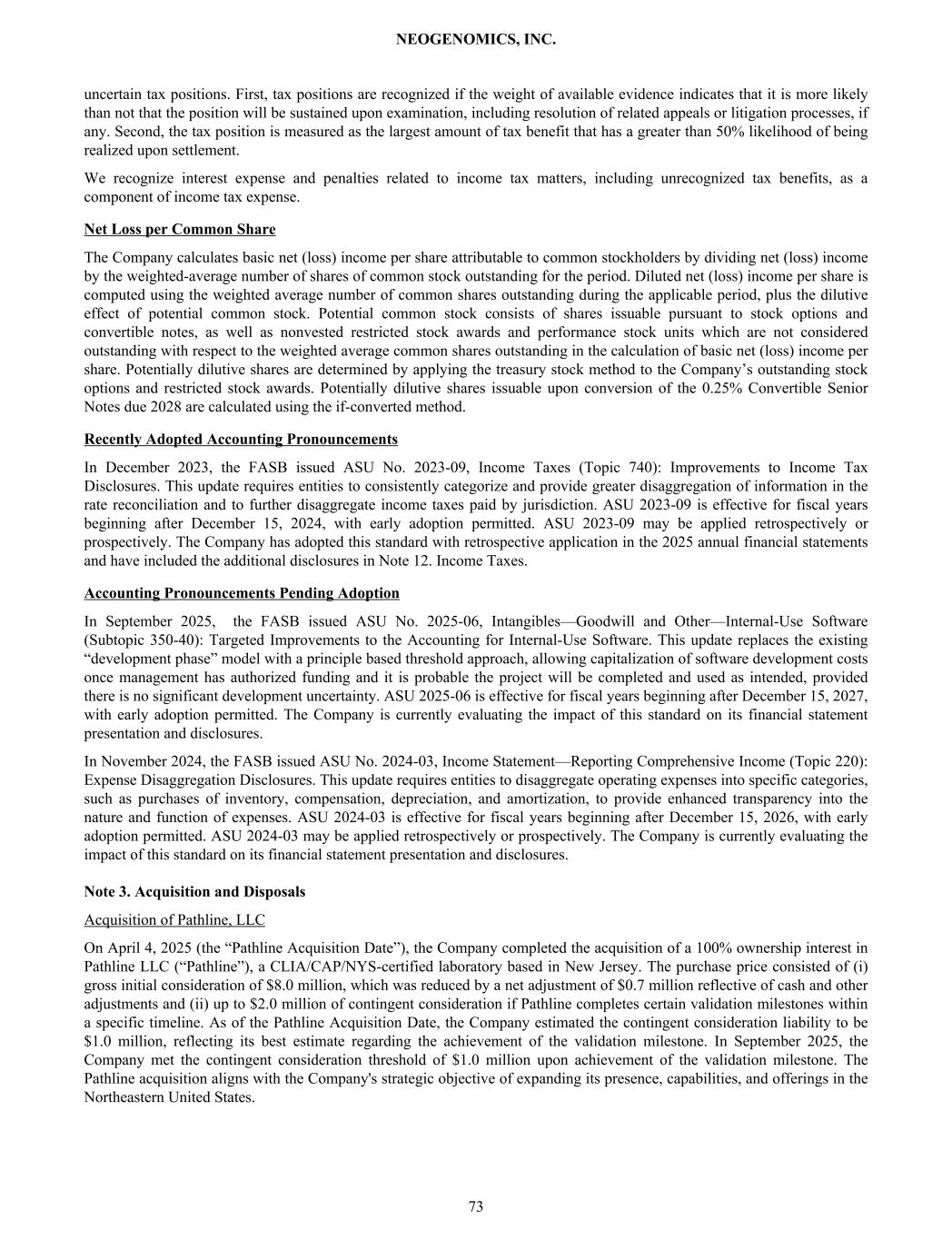 uncertain tax positions. First, tax positions are recognized if the weight of available evidence indicates that it is more likely than not that the position will be sustained upon examination, including resolution of related appeals or litigation processes, if any. Second, the tax position is measured as the largest amount of tax benefit that has a greater than 50% likelihood of being realized upon settlement. We recognize interest expense and penalties related to income tax matters, including unrecognized tax benefits, as a component of income tax expense. Net Loss per Common Share The Company calculates basic net (loss) income per share attributable to common stockholders by dividing net (loss) income by the weighted-average number of shares of common stock outstanding for the period. Diluted net (loss) income per share is computed using the weighted average number of common shares outstanding during the applicable period, plus the dilutive effect of potential common stock. Potential common stock consists of shares issuable pursuant to stock options and convertible notes, as well as nonvested restricted stock awards and performance stock units which are not considered outstanding with respect to the weighted average common shares outstanding in the calculation of basic net (loss) income per share. Potentially dilutive shares are determined by applying the treasury stock method to the Company’s outstanding stock options and restricted stock awards. Potentially dilutive shares issuable upon conversion of the 0.25% Convertible Senior Notes due 2028 are calculated using the if-converted method. Recently Adopted Accounting Pronouncements In December 2023, the FASB issued ASU No. 2023-09, Income Taxes (Topic 740): Improvements to Income Tax Disclosures. This update requires entities to consistently categorize and provide greater disaggregation of information in the rate reconciliation and to further disaggregate income taxes paid by jurisdiction. ASU 2023-09 is effective for fiscal years beginning after December 15, 2024, with early adoption permitted. ASU 2023-09 may be applied retrospectively or prospectively. The Company has adopted this standard with retrospective application in the 2025 annual financial statements and have included the additional disclosures in Note 12. Income Taxes. Accounting Pronouncements Pending Adoption In September 2025, the FASB issued ASU No. 2025-06, Intangibles—Goodwill and Other—Internal-Use Software (Subtopic 350-40): Targeted Improvements to the Accounting for Internal-Use Software. This update replaces the existing “development phase” model with a principle based threshold approach, allowing capitalization of software development costs once management has authorized funding and it is probable the project will be completed and used as intended, provided there is no significant development uncertainty. ASU 2025-06 is effective for fiscal years beginning after December 15, 2027, with early adoption permitted. The Company is currently evaluating the impact of this standard on its financial statement presentation and disclosures. In November 2024, the FASB issued ASU No. 2024-03, Income Statement—Reporting Comprehensive Income (Topic 220): Expense Disaggregation Disclosures. This update requires entities to disaggregate operating expenses into specific categories, such as purchases of inventory, compensation, depreciation, and amortization, to provide enhanced transparency into the nature and function of expenses. ASU 2024-03 is effective for fiscal years beginning after December 15, 2026, with early adoption permitted. ASU 2024-03 may be applied retrospectively or prospectively. The Company is currently evaluating the impact of this standard on its financial statement presentation and disclosures. Note 3. Acquisition and Disposals Acquisition of Pathline, LLC On April 4, 2025 (the “Pathline Acquisition Date”), the Company completed the acquisition of a 100% ownership interest in Pathline LLC (“Pathline”), a CLIA/CAP/NYS-certified laboratory based in New Jersey. The purchase price consisted of (i) gross initial consideration of $8.0 million, which was reduced by a net adjustment of $0.7 million reflective of cash and other adjustments and (ii) up to $2.0 million of contingent consideration if Pathline completes certain validation milestones within a specific timeline. As of the Pathline Acquisition Date, the Company estimated the contingent consideration liability to be $1.0 million, reflecting its best estimate regarding the achievement of the validation milestone. In September 2025, the Company met the contingent consideration threshold of $1.0 million upon achievement of the validation milestone. The Pathline acquisition aligns with the Company's strategic objective of expanding its presence, capabilities, and offerings in the Northeastern United States. NEOGENOMICS, INC. 73