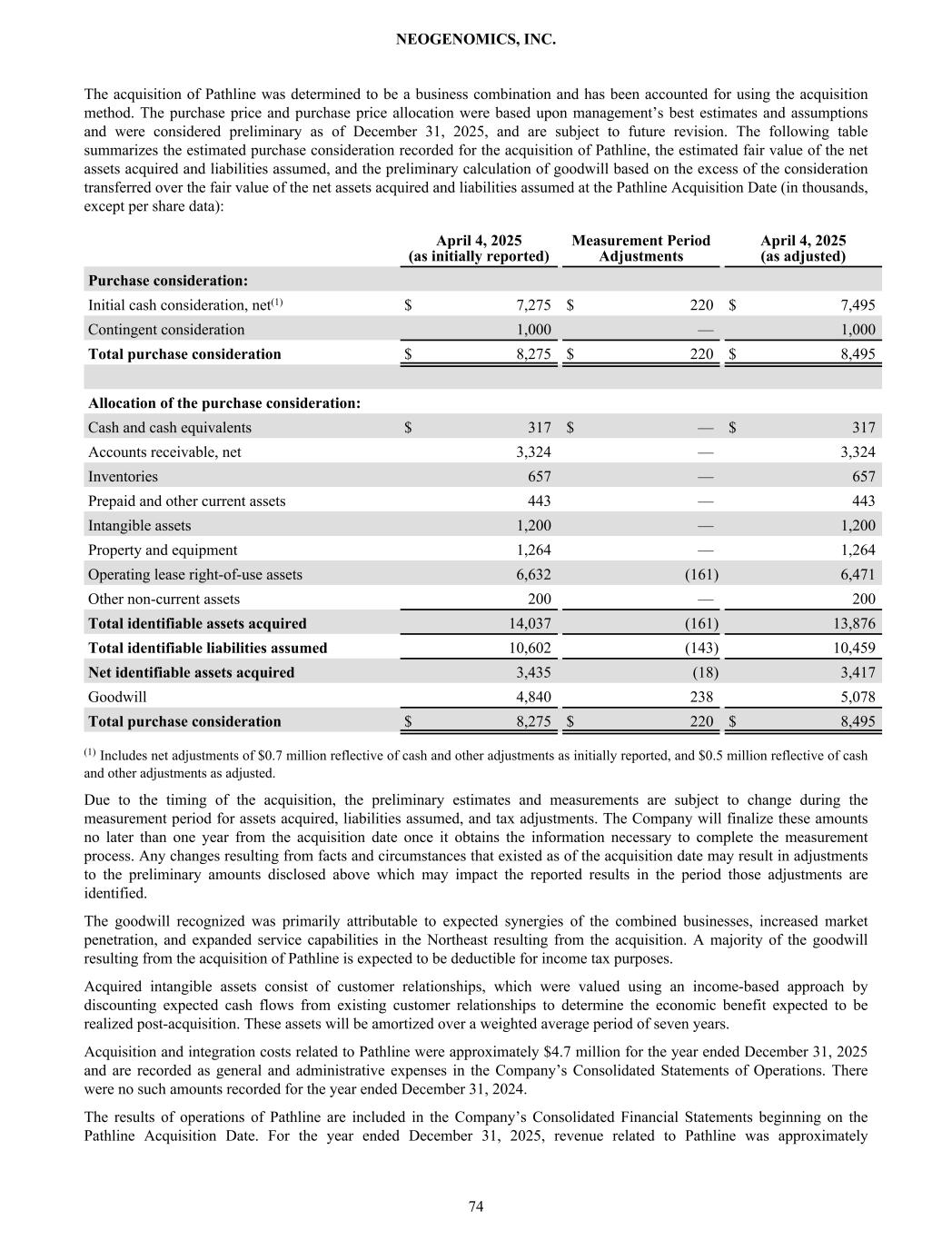 The acquisition of Pathline was determined to be a business combination and has been accounted for using the acquisition method. The purchase price and purchase price allocation were based upon management’s best estimates and assumptions and were considered preliminary as of December 31, 2025, and are subject to future revision. The following table summarizes the estimated purchase consideration recorded for the acquisition of Pathline, the estimated fair value of the net assets acquired and liabilities assumed, and the preliminary calculation of goodwill based on the excess of the consideration transferred over the fair value of the net assets acquired and liabilities assumed at the Pathline Acquisition Date (in thousands, except per share data): April 4, 2025 (as initially reported) Measurement Period Adjustments April 4, 2025 (as adjusted) Purchase consideration: Initial cash consideration, net(1) $ 7,275 $ 220 $ 7,495 Contingent consideration 1,000 — 1,000 Total purchase consideration $ 8,275 $ 220 $ 8,495 Allocation of the purchase consideration: Cash and cash equivalents $ 317 $ — $ 317 Accounts receivable, net 3,324 — 3,324 Inventories 657 — 657 Prepaid and other current assets 443 — 443 Intangible assets 1,200 — 1,200 Property and equipment 1,264 — 1,264 Operating lease right-of-use assets 6,632 (161) 6,471 Other non-current assets 200 — 200 Total identifiable assets acquired 14,037 (161) 13,876 Total identifiable liabilities assumed 10,602 (143) 10,459 Net identifiable assets acquired 3,435 (18) 3,417 Goodwill 4,840 238 5,078 Total purchase consideration $ 8,275 $ 220 $ 8,495 (1) Includes net adjustments of $0.7 million reflective of cash and other adjustments as initially reported, and $0.5 million reflective of cash and other adjustments as adjusted. Due to the timing of the acquisition, the preliminary estimates and measurements are subject to change during the measurement period for assets acquired, liabilities assumed, and tax adjustments. The Company will finalize these amounts no later than one year from the acquisition date once it obtains the information necessary to complete the measurement process. Any changes resulting from facts and circumstances that existed as of the acquisition date may result in adjustments to the preliminary amounts disclosed above which may impact the reported results in the period those adjustments are identified. The goodwill recognized was primarily attributable to expected synergies of the combined businesses, increased market penetration, and expanded service capabilities in the Northeast resulting from the acquisition. A majority of the goodwill resulting from the acquisition of Pathline is expected to be deductible for income tax purposes. Acquired intangible assets consist of customer relationships, which were valued using an income-based approach by discounting expected cash flows from existing customer relationships to determine the economic benefit expected to be realized post-acquisition. These assets will be amortized over a weighted average period of seven years. Acquisition and integration costs related to Pathline were approximately $4.7 million for the year ended December 31, 2025 and are recorded as general and administrative expenses in the Company’s Consolidated Statements of Operations. There were no such amounts recorded for the year ended December 31, 2024. The results of operations of Pathline are included in the Company’s Consolidated Financial Statements beginning on the Pathline Acquisition Date. For the year ended December 31, 2025, revenue related to Pathline was approximately NEOGENOMICS, INC. 74