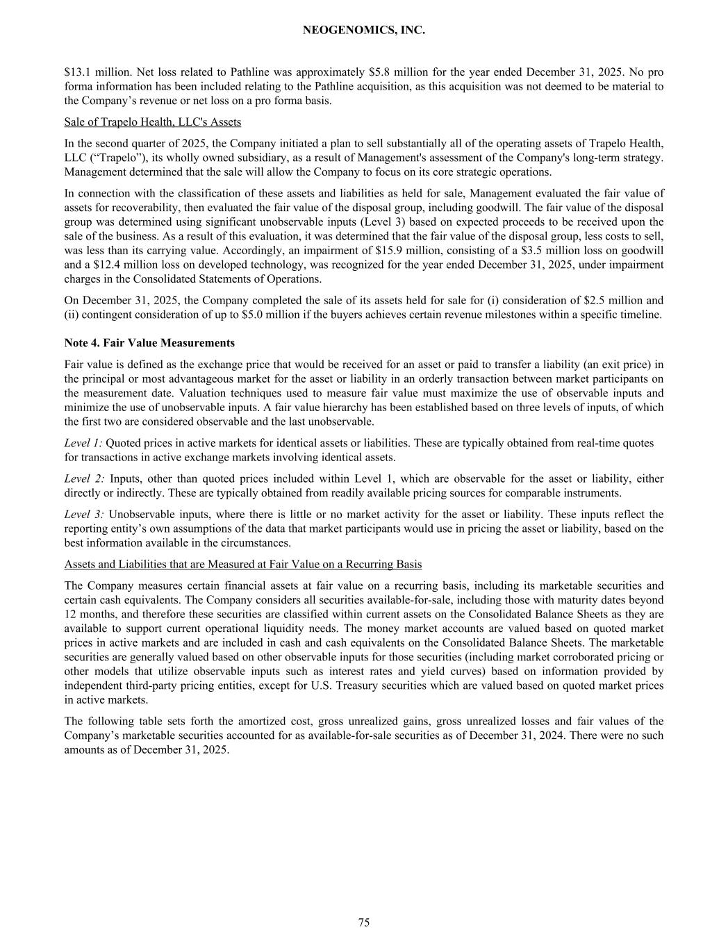 $13.1 million. Net loss related to Pathline was approximately $5.8 million for the year ended December 31, 2025. No pro forma information has been included relating to the Pathline acquisition, as this acquisition was not deemed to be material to the Company’s revenue or net loss on a pro forma basis. Sale of Trapelo Health, LLC's Assets In the second quarter of 2025, the Company initiated a plan to sell substantially all of the operating assets of Trapelo Health, LLC (“Trapelo”), its wholly owned subsidiary, as a result of Management's assessment of the Company's long-term strategy. Management determined that the sale will allow the Company to focus on its core strategic operations. In connection with the classification of these assets and liabilities as held for sale, Management evaluated the fair value of assets for recoverability, then evaluated the fair value of the disposal group, including goodwill. The fair value of the disposal group was determined using significant unobservable inputs (Level 3) based on expected proceeds to be received upon the sale of the business. As a result of this evaluation, it was determined that the fair value of the disposal group, less costs to sell, was less than its carrying value. Accordingly, an impairment of $15.9 million, consisting of a $3.5 million loss on goodwill and a $12.4 million loss on developed technology, was recognized for the year ended December 31, 2025, under impairment charges in the Consolidated Statements of Operations. On December 31, 2025, the Company completed the sale of its assets held for sale for (i) consideration of $2.5 million and (ii) contingent consideration of up to $5.0 million if the buyers achieves certain revenue milestones within a specific timeline. Note 4. Fair Value Measurements Fair value is defined as the exchange price that would be received for an asset or paid to transfer a liability (an exit price) in the principal or most advantageous market for the asset or liability in an orderly transaction between market participants on the measurement date. Valuation techniques used to measure fair value must maximize the use of observable inputs and minimize the use of unobservable inputs. A fair value hierarchy has been established based on three levels of inputs, of which the first two are considered observable and the last unobservable. Level 1: Quoted prices in active markets for identical assets or liabilities. These are typically obtained from real-time quotes for transactions in active exchange markets involving identical assets. Level 2: Inputs, other than quoted prices included within Level 1, which are observable for the asset or liability, either directly or indirectly. These are typically obtained from readily available pricing sources for comparable instruments. Level 3: Unobservable inputs, where there is little or no market activity for the asset or liability. These inputs reflect the reporting entity’s own assumptions of the data that market participants would use in pricing the asset or liability, based on the best information available in the circumstances. Assets and Liabilities that are Measured at Fair Value on a Recurring Basis The Company measures certain financial assets at fair value on a recurring basis, including its marketable securities and certain cash equivalents. The Company considers all securities available-for-sale, including those with maturity dates beyond 12 months, and therefore these securities are classified within current assets on the Consolidated Balance Sheets as they are available to support current operational liquidity needs. The money market accounts are valued based on quoted market prices in active markets and are included in cash and cash equivalents on the Consolidated Balance Sheets. The marketable securities are generally valued based on other observable inputs for those securities (including market corroborated pricing or other models that utilize observable inputs such as interest rates and yield curves) based on information provided by independent third-party pricing entities, except for U.S. Treasury securities which are valued based on quoted market prices in active markets. The following table sets forth the amortized cost, gross unrealized gains, gross unrealized losses and fair values of the Company’s marketable securities accounted for as available-for-sale securities as of December 31, 2024. There were no such amounts as of December 31, 2025. NEOGENOMICS, INC. 75