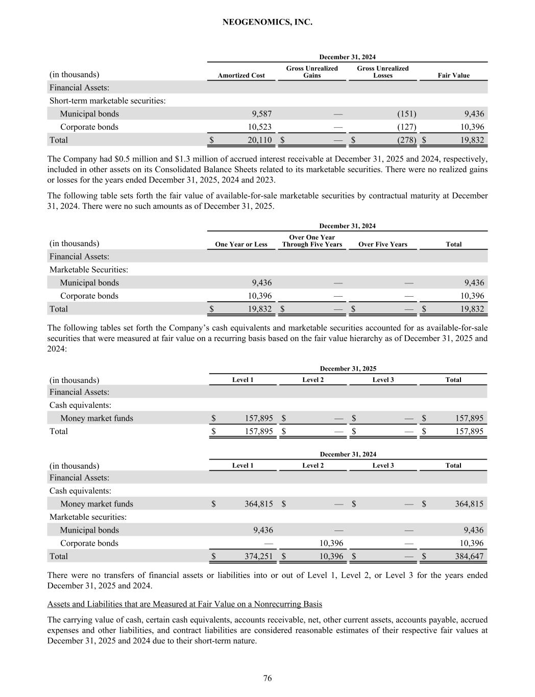 December 31, 2024 (in thousands) Amortized Cost Gross Unrealized Gains Gross Unrealized Losses Fair Value Financial Assets: Short-term marketable securities: Municipal bonds 9,587 — (151) 9,436 Corporate bonds 10,523 — (127) 10,396 Total $ 20,110 $ — $ (278) $ 19,832 The Company had $0.5 million and $1.3 million of accrued interest receivable at December 31, 2025 and 2024, respectively, included in other assets on its Consolidated Balance Sheets related to its marketable securities. There were no realized gains or losses for the years ended December 31, 2025, 2024 and 2023. The following table sets forth the fair value of available-for-sale marketable securities by contractual maturity at December 31, 2024. There were no such amounts as of December 31, 2025. December 31, 2024 (in thousands) One Year or Less Over One Year Through Five Years Over Five Years Total Financial Assets: Marketable Securities: Municipal bonds 9,436 — — 9,436 Corporate bonds 10,396 — — 10,396 Total $ 19,832 $ — $ — $ 19,832 The following tables set forth the Company’s cash equivalents and marketable securities accounted for as available-for-sale securities that were measured at fair value on a recurring basis based on the fair value hierarchy as of December 31, 2025 and 2024: December 31, 2025 (in thousands) Level 1 Level 2 Level 3 Total Financial Assets: Cash equivalents: Money market funds $ 157,895 $ — $ — $ 157,895 Total $ 157,895 $ — $ — $ 157,895 December 31, 2024 (in thousands) Level 1 Level 2 Level 3 Total Financial Assets: Cash equivalents: Money market funds $ 364,815 $ — $ — $ 364,815 Marketable securities: Municipal bonds 9,436 — — 9,436 Corporate bonds — 10,396 — 10,396 Total $ 374,251 $ 10,396 $ — $ 384,647 There were no transfers of financial assets or liabilities into or out of Level 1, Level 2, or Level 3 for the years ended December 31, 2025 and 2024. Assets and Liabilities that are Measured at Fair Value on a Nonrecurring Basis The carrying value of cash, certain cash equivalents, accounts receivable, net, other current assets, accounts payable, accrued expenses and other liabilities, and contract liabilities are considered reasonable estimates of their respective fair values at December 31, 2025 and 2024 due to their short-term nature. NEOGENOMICS, INC. 76