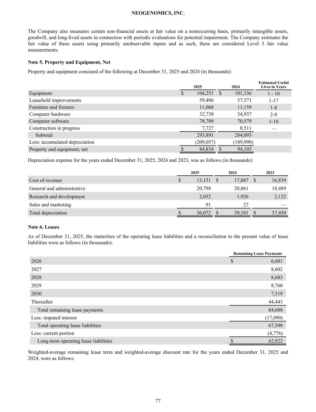The Company also measures certain non-financial assets at fair value on a nonrecurring basis, primarily intangible assets, goodwill, and long-lived assets in connection with periodic evaluations for potential impairment. The Company estimates the fair value of these assets using primarily unobservable inputs and as such, these are considered Level 3 fair value measurements. Note 5. Property and Equipment, Net Property and equipment consisted of the following at December 31, 2025 and 2024 (in thousands): 2025 2024 Estimated Useful Lives in Years Equipment $ 104,251 $ 101,336 1 - 10 Leasehold improvements 59,406 57,571 1-17 Furniture and fixtures 11,068 11,159 1-8 Computer hardware 32,730 34,937 2-8 Computer software 78,709 70,579 1-10 Construction in progress 7,727 8,511 — Subtotal 293,891 284,093 Less: accumulated depreciation (209,057) (189,990) Property and equipment, net $ 84,834 $ 94,103 Depreciation expense for the years ended December 31, 2025, 2024 and 2023, was as follows (in thousands): 2025 2024 2023 Cost of revenue $ 13,151 $ 17,087 $ 16,839 General and administrative 20,798 20,061 18,489 Research and development 2,032 1,926 2,122 Sales and marketing 91 27 — Total depreciation $ 36,072 $ 39,101 $ 37,450 Note 6. Leases As of December 31, 2025, the maturities of the operating lease liabilities and a reconciliation to the present value of lease liabilities were as follows (in thousands): Remaining Lease Payments 2026 $ 6,681 2027 8,602 2028 8,683 2029 8,760 2030 7,519 Thereafter 44,443 Total remaining lease payments 84,688 Less: imputed interest (17,090) Total operating lease liabilities 67,598 Less: current portion (4,776) Long-term operating lease liabilities $ 62,822 Weighted-average remaining lease term and weighted-average discount rate for the years ended December 31, 2025 and 2024, were as follows: NEOGENOMICS, INC. 77