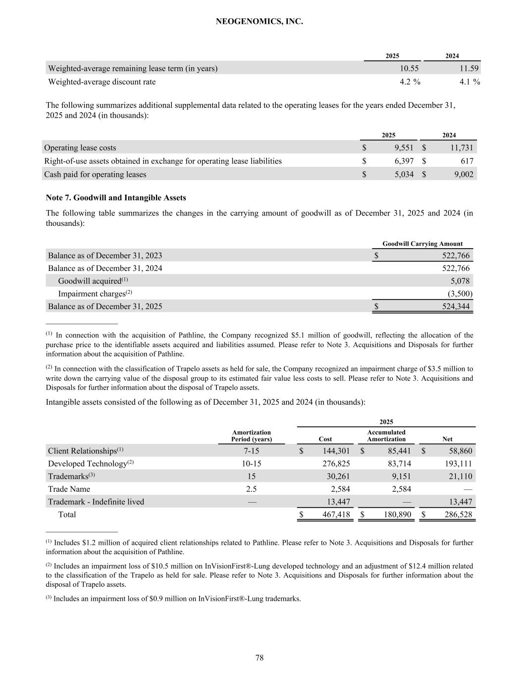 2025 2024 Weighted-average remaining lease term (in years) 10.55 11.59 Weighted-average discount rate 4.2 % 4.1 % The following summarizes additional supplemental data related to the operating leases for the years ended December 31, 2025 and 2024 (in thousands): 2025 2024 Operating lease costs $ 9,551 $ 11,731 Right-of-use assets obtained in exchange for operating lease liabilities $ 6,397 $ 617 Cash paid for operating leases $ 5,034 $ 9,002 Note 7. Goodwill and Intangible Assets The following table summarizes the changes in the carrying amount of goodwill as of December 31, 2025 and 2024 (in thousands): Goodwill Carrying Amount Balance as of December 31, 2023 $ 522,766 Balance as of December 31, 2024 522,766 Goodwill acquired(1) 5,078 Impairment charges(2) (3,500) Balance as of December 31, 2025 $ 524,344 _________________ (1) In connection with the acquisition of Pathline, the Company recognized $5.1 million of goodwill, reflecting the allocation of the purchase price to the identifiable assets acquired and liabilities assumed. Please refer to Note 3. Acquisitions and Disposals for further information about the acquisition of Pathline. (2) In connection with the classification of Trapelo assets as held for sale, the Company recognized an impairment charge of $3.5 million to write down the carrying value of the disposal group to its estimated fair value less costs to sell. Please refer to Note 3. Acquisitions and Disposals for further information about the disposal of Trapelo assets. Intangible assets consisted of the following as of December 31, 2025 and 2024 (in thousands): 2025 Amortization Period (years) Cost Accumulated Amortization Net Client Relationships(1) 7-15 $ 144,301 $ 85,441 $ 58,860 Developed Technology(2) 10-15 276,825 83,714 193,111 Trademarks(3) 15 30,261 9,151 21,110 Trade Name 2.5 2,584 2,584 — Trademark - Indefinite lived — 13,447 — 13,447 Total $ 467,418 $ 180,890 $ 286,528 _________________ (1) Includes $1.2 million of acquired client relationships related to Pathline. Please refer to Note 3. Acquisitions and Disposals for further information about the acquisition of Pathline. (2) Includes an impairment loss of $10.5 million on InVisionFirst®-Lung developed technology and an adjustment of $12.4 million related to the classification of the Trapelo as held for sale. Please refer to Note 3. Acquisitions and Disposals for further information about the disposal of Trapelo assets. (3) Includes an impairment loss of $0.9 million on InVisionFirst®-Lung trademarks. NEOGENOMICS, INC. 78