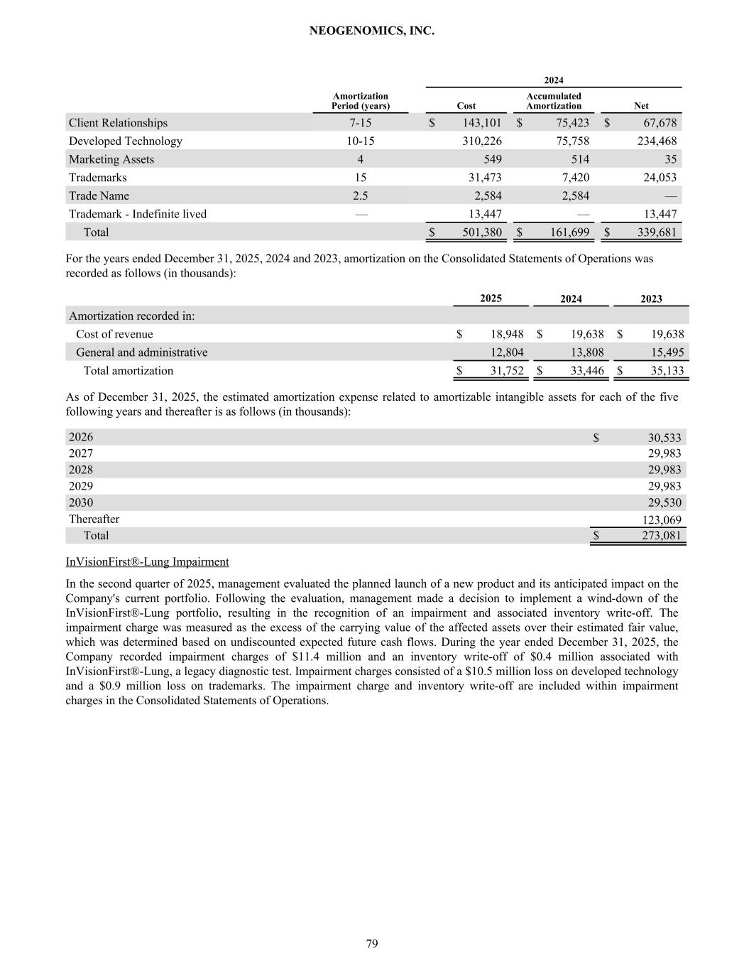 2024 Amortization Period (years) Cost Accumulated Amortization Net Client Relationships 7-15 $ 143,101 $ 75,423 $ 67,678 Developed Technology 10-15 310,226 75,758 234,468 Marketing Assets 4 549 514 35 Trademarks 15 31,473 7,420 24,053 Trade Name 2.5 2,584 2,584 — Trademark - Indefinite lived — 13,447 — 13,447 Total $ 501,380 $ 161,699 $ 339,681 For the years ended December 31, 2025, 2024 and 2023, amortization on the Consolidated Statements of Operations was recorded as follows (in thousands): 2025 2024 2023 Amortization recorded in: Cost of revenue $ 18,948 $ 19,638 $ 19,638 General and administrative 12,804 13,808 15,495 Total amortization $ 31,752 $ 33,446 $ 35,133 As of December 31, 2025, the estimated amortization expense related to amortizable intangible assets for each of the five following years and thereafter is as follows (in thousands): 2026 $ 30,533 2027 29,983 2028 29,983 2029 29,983 2030 29,530 Thereafter 123,069 Total $ 273,081 InVisionFirst®-Lung Impairment In the second quarter of 2025, management evaluated the planned launch of a new product and its anticipated impact on the Company's current portfolio. Following the evaluation, management made a decision to implement a wind-down of the InVisionFirst®-Lung portfolio, resulting in the recognition of an impairment and associated inventory write-off. The impairment charge was measured as the excess of the carrying value of the affected assets over their estimated fair value, which was determined based on undiscounted expected future cash flows. During the year ended December 31, 2025, the Company recorded impairment charges of $11.4 million and an inventory write-off of $0.4 million associated with InVisionFirst®-Lung, a legacy diagnostic test. Impairment charges consisted of a $10.5 million loss on developed technology and a $0.9 million loss on trademarks. The impairment charge and inventory write-off are included within impairment charges in the Consolidated Statements of Operations. NEOGENOMICS, INC. 79