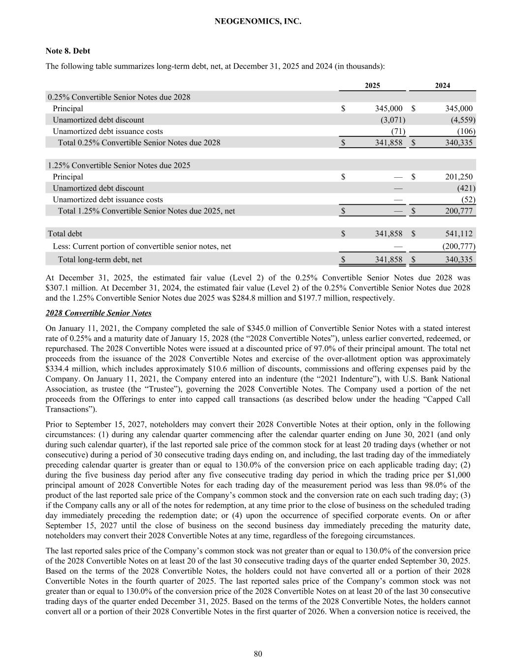 Note 8. Debt The following table summarizes long-term debt, net, at December 31, 2025 and 2024 (in thousands): 2025 2024 0.25% Convertible Senior Notes due 2028 Principal $ 345,000 $ 345,000 Unamortized debt discount (3,071) (4,559) Unamortized debt issuance costs (71) (106) Total 0.25% Convertible Senior Notes due 2028 $ 341,858 $ 340,335 1.25% Convertible Senior Notes due 2025 Principal $ — $ 201,250 Unamortized debt discount — (421) Unamortized debt issuance costs — (52) Total 1.25% Convertible Senior Notes due 2025, net $ — $ 200,777 Total debt $ 341,858 $ 541,112 Less: Current portion of convertible senior notes, net — (200,777) Total long-term debt, net $ 341,858 $ 340,335 At December 31, 2025, the estimated fair value (Level 2) of the 0.25% Convertible Senior Notes due 2028 was $307.1 million. At December 31, 2024, the estimated fair value (Level 2) of the 0.25% Convertible Senior Notes due 2028 and the 1.25% Convertible Senior Notes due 2025 was $284.8 million and $197.7 million, respectively. 2028 Convertible Senior Notes On January 11, 2021, the Company completed the sale of $345.0 million of Convertible Senior Notes with a stated interest rate of 0.25% and a maturity date of January 15, 2028 (the “2028 Convertible Notes”), unless earlier converted, redeemed, or repurchased. The 2028 Convertible Notes were issued at a discounted price of 97.0% of their principal amount. The total net proceeds from the issuance of the 2028 Convertible Notes and exercise of the over-allotment option was approximately $334.4 million, which includes approximately $10.6 million of discounts, commissions and offering expenses paid by the Company. On January 11, 2021, the Company entered into an indenture (the “2021 Indenture”), with U.S. Bank National Association, as trustee (the “Trustee”), governing the 2028 Convertible Notes. The Company used a portion of the net proceeds from the Offerings to enter into capped call transactions (as described below under the heading “Capped Call Transactions”). Prior to September 15, 2027, noteholders may convert their 2028 Convertible Notes at their option, only in the following circumstances: (1) during any calendar quarter commencing after the calendar quarter ending on June 30, 2021 (and only during such calendar quarter), if the last reported sale price of the common stock for at least 20 trading days (whether or not consecutive) during a period of 30 consecutive trading days ending on, and including, the last trading day of the immediately preceding calendar quarter is greater than or equal to 130.0% of the conversion price on each applicable trading day; (2) during the five business day period after any five consecutive trading day period in which the trading price per $1,000 principal amount of 2028 Convertible Notes for each trading day of the measurement period was less than 98.0% of the product of the last reported sale price of the Company’s common stock and the conversion rate on each such trading day; (3) if the Company calls any or all of the notes for redemption, at any time prior to the close of business on the scheduled trading day immediately preceding the redemption date; or (4) upon the occurrence of specified corporate events. On or after September 15, 2027 until the close of business on the second business day immediately preceding the maturity date, noteholders may convert their 2028 Convertible Notes at any time, regardless of the foregoing circumstances. The last reported sales price of the Company’s common stock was not greater than or equal to 130.0% of the conversion price of the 2028 Convertible Notes on at least 20 of the last 30 consecutive trading days of the quarter ended September 30, 2025. Based on the terms of the 2028 Convertible Notes, the holders could not have converted all or a portion of their 2028 Convertible Notes in the fourth quarter of 2025. The last reported sales price of the Company’s common stock was not greater than or equal to 130.0% of the conversion price of the 2028 Convertible Notes on at least 20 of the last 30 consecutive trading days of the quarter ended December 31, 2025. Based on the terms of the 2028 Convertible Notes, the holders cannot convert all or a portion of their 2028 Convertible Notes in the first quarter of 2026. When a conversion notice is received, the NEOGENOMICS, INC. 80