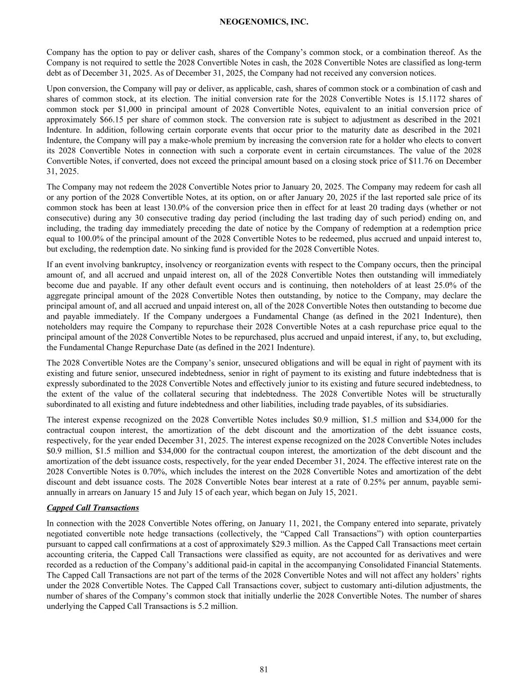 Company has the option to pay or deliver cash, shares of the Company’s common stock, or a combination thereof. As the Company is not required to settle the 2028 Convertible Notes in cash, the 2028 Convertible Notes are classified as long-term debt as of December 31, 2025. As of December 31, 2025, the Company had not received any conversion notices. Upon conversion, the Company will pay or deliver, as applicable, cash, shares of common stock or a combination of cash and shares of common stock, at its election. The initial conversion rate for the 2028 Convertible Notes is 15.1172 shares of common stock per $1,000 in principal amount of 2028 Convertible Notes, equivalent to an initial conversion price of approximately $66.15 per share of common stock. The conversion rate is subject to adjustment as described in the 2021 Indenture. In addition, following certain corporate events that occur prior to the maturity date as described in the 2021 Indenture, the Company will pay a make-whole premium by increasing the conversion rate for a holder who elects to convert its 2028 Convertible Notes in connection with such a corporate event in certain circumstances. The value of the 2028 Convertible Notes, if converted, does not exceed the principal amount based on a closing stock price of $11.76 on December 31, 2025. The Company may not redeem the 2028 Convertible Notes prior to January 20, 2025. The Company may redeem for cash all or any portion of the 2028 Convertible Notes, at its option, on or after January 20, 2025 if the last reported sale price of its common stock has been at least 130.0% of the conversion price then in effect for at least 20 trading days (whether or not consecutive) during any 30 consecutive trading day period (including the last trading day of such period) ending on, and including, the trading day immediately preceding the date of notice by the Company of redemption at a redemption price equal to 100.0% of the principal amount of the 2028 Convertible Notes to be redeemed, plus accrued and unpaid interest to, but excluding, the redemption date. No sinking fund is provided for the 2028 Convertible Notes. If an event involving bankruptcy, insolvency or reorganization events with respect to the Company occurs, then the principal amount of, and all accrued and unpaid interest on, all of the 2028 Convertible Notes then outstanding will immediately become due and payable. If any other default event occurs and is continuing, then noteholders of at least 25.0% of the aggregate principal amount of the 2028 Convertible Notes then outstanding, by notice to the Company, may declare the principal amount of, and all accrued and unpaid interest on, all of the 2028 Convertible Notes then outstanding to become due and payable immediately. If the Company undergoes a Fundamental Change (as defined in the 2021 Indenture), then noteholders may require the Company to repurchase their 2028 Convertible Notes at a cash repurchase price equal to the principal amount of the 2028 Convertible Notes to be repurchased, plus accrued and unpaid interest, if any, to, but excluding, the Fundamental Change Repurchase Date (as defined in the 2021 Indenture). The 2028 Convertible Notes are the Company’s senior, unsecured obligations and will be equal in right of payment with its existing and future senior, unsecured indebtedness, senior in right of payment to its existing and future indebtedness that is expressly subordinated to the 2028 Convertible Notes and effectively junior to its existing and future secured indebtedness, to the extent of the value of the collateral securing that indebtedness. The 2028 Convertible Notes will be structurally subordinated to all existing and future indebtedness and other liabilities, including trade payables, of its subsidiaries. The interest expense recognized on the 2028 Convertible Notes includes $0.9 million, $1.5 million and $34,000 for the contractual coupon interest, the amortization of the debt discount and the amortization of the debt issuance costs, respectively, for the year ended December 31, 2025. The interest expense recognized on the 2028 Convertible Notes includes $0.9 million, $1.5 million and $34,000 for the contractual coupon interest, the amortization of the debt discount and the amortization of the debt issuance costs, respectively, for the year ended December 31, 2024. The effective interest rate on the 2028 Convertible Notes is 0.70%, which includes the interest on the 2028 Convertible Notes and amortization of the debt discount and debt issuance costs. The 2028 Convertible Notes bear interest at a rate of 0.25% per annum, payable semi- annually in arrears on January 15 and July 15 of each year, which began on July 15, 2021. Capped Call Transactions In connection with the 2028 Convertible Notes offering, on January 11, 2021, the Company entered into separate, privately negotiated convertible note hedge transactions (collectively, the “Capped Call Transactions”) with option counterparties pursuant to capped call confirmations at a cost of approximately $29.3 million. As the Capped Call Transactions meet certain accounting criteria, the Capped Call Transactions were classified as equity, are not accounted for as derivatives and were recorded as a reduction of the Company’s additional paid-in capital in the accompanying Consolidated Financial Statements. The Capped Call Transactions are not part of the terms of the 2028 Convertible Notes and will not affect any holders’ rights under the 2028 Convertible Notes. The Capped Call Transactions cover, subject to customary anti-dilution adjustments, the number of shares of the Company’s common stock that initially underlie the 2028 Convertible Notes. The number of shares underlying the Capped Call Transactions is 5.2 million. NEOGENOMICS, INC. 81