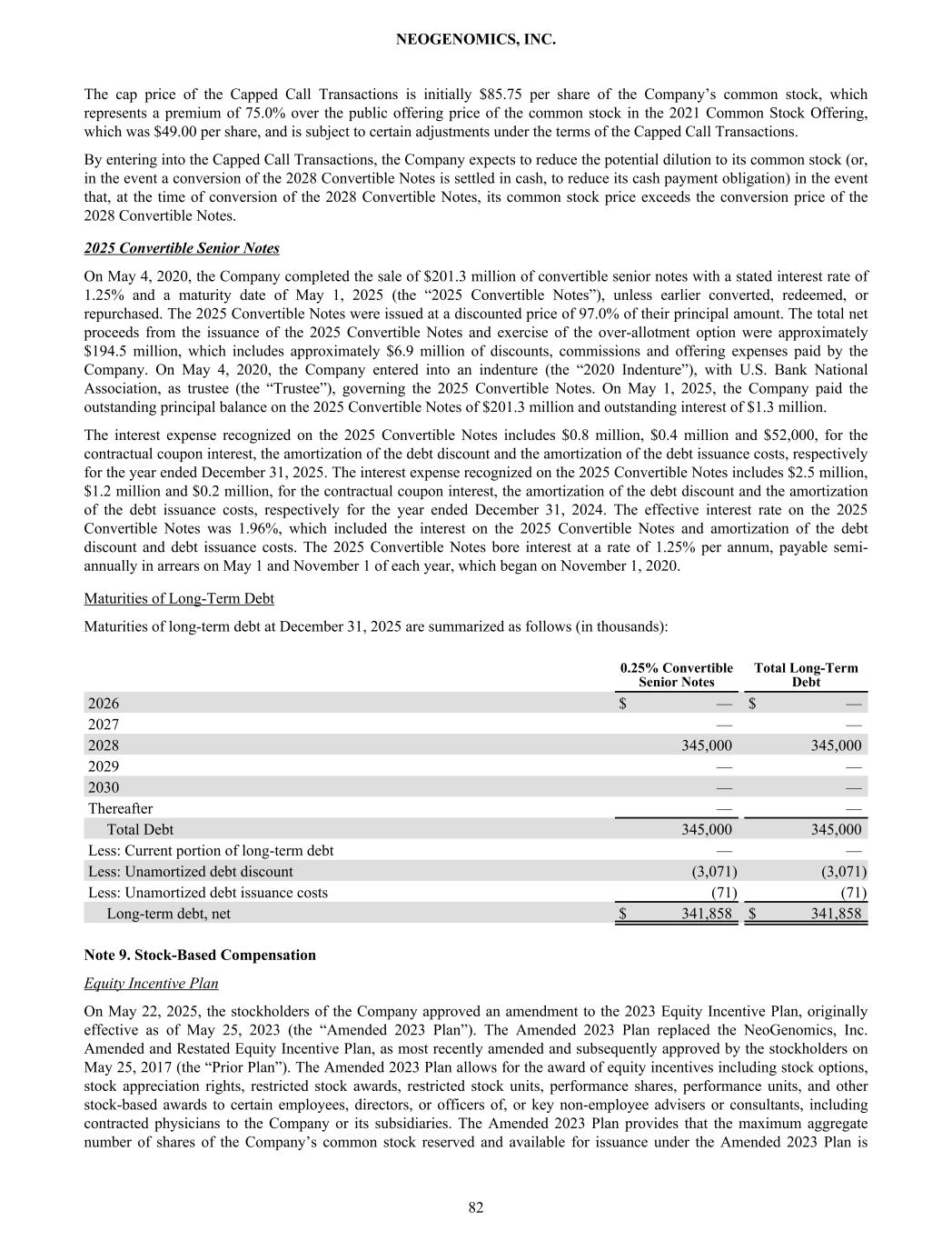 The cap price of the Capped Call Transactions is initially $85.75 per share of the Company’s common stock, which represents a premium of 75.0% over the public offering price of the common stock in the 2021 Common Stock Offering, which was $49.00 per share, and is subject to certain adjustments under the terms of the Capped Call Transactions. By entering into the Capped Call Transactions, the Company expects to reduce the potential dilution to its common stock (or, in the event a conversion of the 2028 Convertible Notes is settled in cash, to reduce its cash payment obligation) in the event that, at the time of conversion of the 2028 Convertible Notes, its common stock price exceeds the conversion price of the 2028 Convertible Notes. 2025 Convertible Senior Notes On May 4, 2020, the Company completed the sale of $201.3 million of convertible senior notes with a stated interest rate of 1.25% and a maturity date of May 1, 2025 (the “2025 Convertible Notes”), unless earlier converted, redeemed, or repurchased. The 2025 Convertible Notes were issued at a discounted price of 97.0% of their principal amount. The total net proceeds from the issuance of the 2025 Convertible Notes and exercise of the over-allotment option were approximately $194.5 million, which includes approximately $6.9 million of discounts, commissions and offering expenses paid by the Company. On May 4, 2020, the Company entered into an indenture (the “2020 Indenture”), with U.S. Bank National Association, as trustee (the “Trustee”), governing the 2025 Convertible Notes. On May 1, 2025, the Company paid the outstanding principal balance on the 2025 Convertible Notes of $201.3 million and outstanding interest of $1.3 million. The interest expense recognized on the 2025 Convertible Notes includes $0.8 million, $0.4 million and $52,000, for the contractual coupon interest, the amortization of the debt discount and the amortization of the debt issuance costs, respectively for the year ended December 31, 2025. The interest expense recognized on the 2025 Convertible Notes includes $2.5 million, $1.2 million and $0.2 million, for the contractual coupon interest, the amortization of the debt discount and the amortization of the debt issuance costs, respectively for the year ended December 31, 2024. The effective interest rate on the 2025 Convertible Notes was 1.96%, which included the interest on the 2025 Convertible Notes and amortization of the debt discount and debt issuance costs. The 2025 Convertible Notes bore interest at a rate of 1.25% per annum, payable semi- annually in arrears on May 1 and November 1 of each year, which began on November 1, 2020. Maturities of Long-Term Debt Maturities of long-term debt at December 31, 2025 are summarized as follows (in thousands): 0.25% Convertible Senior Notes Total Long-Term Debt 2026 $ — $ — 2027 — — 2028 345,000 345,000 2029 — — 2030 — — Thereafter — — Total Debt 345,000 345,000 Less: Current portion of long-term debt — — Less: Unamortized debt discount (3,071) (3,071) Less: Unamortized debt issuance costs (71) (71) Long-term debt, net $ 341,858 $ 341,858 Note 9. Stock-Based Compensation Equity Incentive Plan On May 22, 2025, the stockholders of the Company approved an amendment to the 2023 Equity Incentive Plan, originally effective as of May 25, 2023 (the “Amended 2023 Plan”). The Amended 2023 Plan replaced the NeoGenomics, Inc. Amended and Restated Equity Incentive Plan, as most recently amended and subsequently approved by the stockholders on May 25, 2017 (the “Prior Plan”). The Amended 2023 Plan allows for the award of equity incentives including stock options, stock appreciation rights, restricted stock awards, restricted stock units, performance shares, performance units, and other stock-based awards to certain employees, directors, or officers of, or key non-employee advisers or consultants, including contracted physicians to the Company or its subsidiaries. The Amended 2023 Plan provides that the maximum aggregate number of shares of the Company’s common stock reserved and available for issuance under the Amended 2023 Plan is NEOGENOMICS, INC. 82