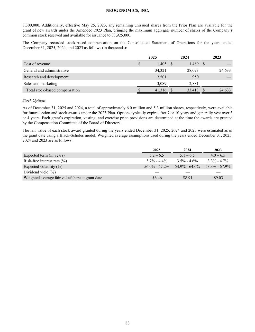 8,300,000. Additionally, effective May 25, 2023, any remaining unissued shares from the Prior Plan are available for the grant of new awards under the Amended 2023 Plan, bringing the maximum aggregate number of shares of the Company’s common stock reserved and available for issuance to 33,925,000. The Company recorded stock-based compensation on the Consolidated Statement of Operations for the years ended December 31, 2025, 2024, and 2023 as follows (in thousands): 2025 2024 2023 Cost of revenue $ 1,405 $ 1,489 $ — General and administrative 34,321 28,093 24,633 Research and development 2,501 950 — Sales and marketing 3,089 2,881 — Total stock-based compensation $ 41,316 $ 33,413 $ 24,633 Stock Options As of December 31, 2025 and 2024, a total of approximately 6.0 million and 5.3 million shares, respectively, were available for future option and stock awards under the 2023 Plan. Options typically expire after 7 or 10 years and generally vest over 3 or 4 years. Each grant’s expiration, vesting, and exercise price provisions are determined at the time the awards are granted by the Compensation Committee of the Board of Directors. The fair value of each stock award granted during the years ended December 31, 2025, 2024 and 2023 were estimated as of the grant date using a Black-Scholes model. Weighted average assumptions used during the years ended December 31, 2025, 2024 and 2023 are as follows: 2025 2024 2023 Expected term (in years) 5.2 – 6.5 5.1 – 6.5 4.0 – 6.5 Risk-free interest rate (%) 3.7% - 4.4% 3.5% - 4.6% 3.3% - 4.7% Expected volatility (%) 56.0% - 67.2% 54.9% - 64.6% 53.3% - 67.9% Dividend yield (%) — — — Weighted average fair value/share at grant date $6.46 $8.91 $9.03 NEOGENOMICS, INC. 83