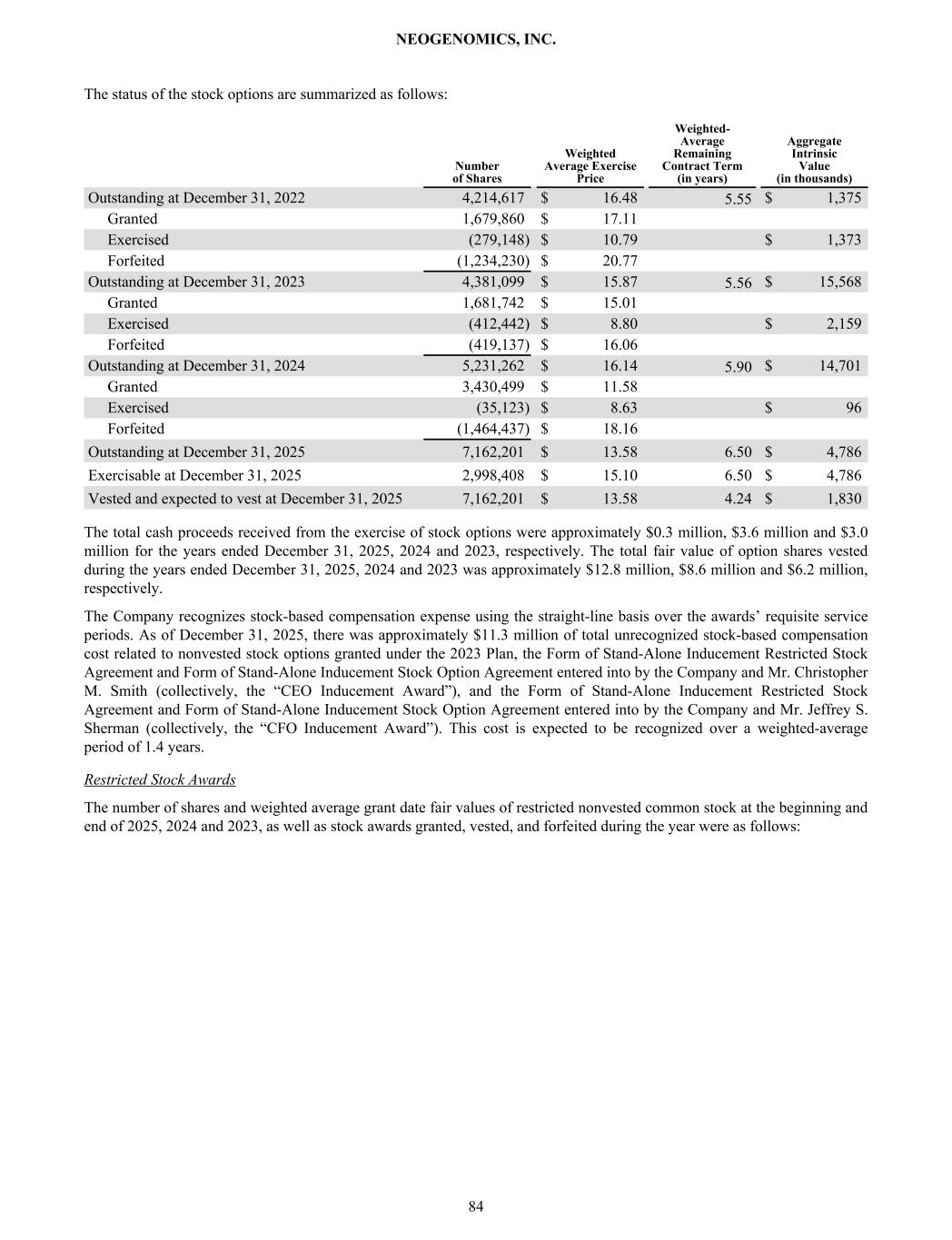 The status of the stock options are summarized as follows: Number of Shares Weighted Average Exercise Price Weighted- Average Remaining Contract Term (in years) Aggregate Intrinsic Value (in thousands) Outstanding at December 31, 2022 4,214,617 $ 16.48 5.55 $ 1,375 Granted 1,679,860 $ 17.11 Exercised (279,148) $ 10.79 $ 1,373 Forfeited (1,234,230) $ 20.77 Outstanding at December 31, 2023 4,381,099 $ 15.87 5.56 $ 15,568 Granted 1,681,742 $ 15.01 Exercised (412,442) $ 8.80 $ 2,159 Forfeited (419,137) $ 16.06 Outstanding at December 31, 2024 5,231,262 $ 16.14 5.90 $ 14,701 Granted 3,430,499 $ 11.58 Exercised (35,123) $ 8.63 $ 96 Forfeited (1,464,437) $ 18.16 Outstanding at December 31, 2025 7,162,201 $ 13.58 6.50 $ 4,786 Exercisable at December 31, 2025 2,998,408 $ 15.10 6.50 $ 4,786 Vested and expected to vest at December 31, 2025 7,162,201 $ 13.58 4.24 $ 1,830 The total cash proceeds received from the exercise of stock options were approximately $0.3 million, $3.6 million and $3.0 million for the years ended December 31, 2025, 2024 and 2023, respectively. The total fair value of option shares vested during the years ended December 31, 2025, 2024 and 2023 was approximately $12.8 million, $8.6 million and $6.2 million, respectively. The Company recognizes stock-based compensation expense using the straight-line basis over the awards’ requisite service periods. As of December 31, 2025, there was approximately $11.3 million of total unrecognized stock-based compensation cost related to nonvested stock options granted under the 2023 Plan, the Form of Stand-Alone Inducement Restricted Stock Agreement and Form of Stand-Alone Inducement Stock Option Agreement entered into by the Company and Mr. Christopher M. Smith (collectively, the “CEO Inducement Award”), and the Form of Stand-Alone Inducement Restricted Stock Agreement and Form of Stand-Alone Inducement Stock Option Agreement entered into by the Company and Mr. Jeffrey S. Sherman (collectively, the “CFO Inducement Award”). This cost is expected to be recognized over a weighted-average period of 1.4 years. Restricted Stock Awards The number of shares and weighted average grant date fair values of restricted nonvested common stock at the beginning and end of 2025, 2024 and 2023, as well as stock awards granted, vested, and forfeited during the year were as follows: NEOGENOMICS, INC. 84