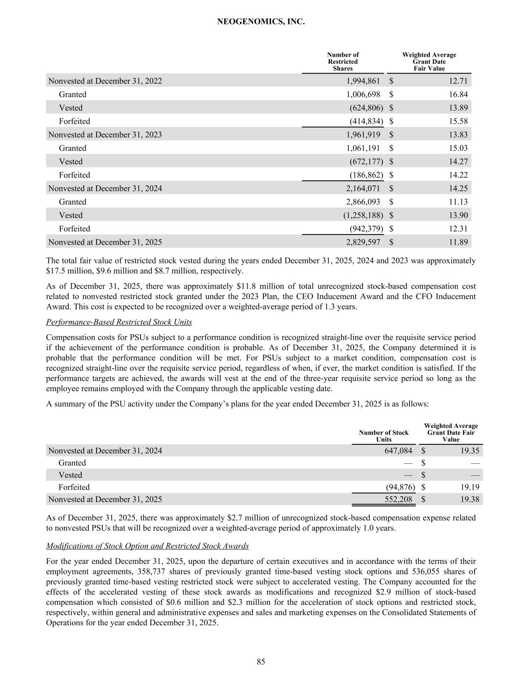 Number of Restricted Shares Weighted Average Grant Date Fair Value Nonvested at December 31, 2022 1,994,861 $ 12.71 Granted 1,006,698 $ 16.84 Vested (624,806) $ 13.89 Forfeited (414,834) $ 15.58 Nonvested at December 31, 2023 1,961,919 $ 13.83 Granted 1,061,191 $ 15.03 Vested (672,177) $ 14.27 Forfeited (186,862) $ 14.22 Nonvested at December 31, 2024 2,164,071 $ 14.25 Granted 2,866,093 $ 11.13 Vested (1,258,188) $ 13.90 Forfeited (942,379) $ 12.31 Nonvested at December 31, 2025 2,829,597 $ 11.89 The total fair value of restricted stock vested during the years ended December 31, 2025, 2024 and 2023 was approximately $17.5 million, $9.6 million and $8.7 million, respectively. As of December 31, 2025, there was approximately $11.8 million of total unrecognized stock-based compensation cost related to nonvested restricted stock granted under the 2023 Plan, the CEO Inducement Award and the CFO Inducement Award. This cost is expected to be recognized over a weighted-average period of 1.3 years. Performance-Based Restricted Stock Units Compensation costs for PSUs subject to a performance condition is recognized straight-line over the requisite service period if the achievement of the performance condition is probable. As of December 31, 2025, the Company determined it is probable that the performance condition will be met. For PSUs subject to a market condition, compensation cost is recognized straight-line over the requisite service period, regardless of when, if ever, the market condition is satisfied. If the performance targets are achieved, the awards will vest at the end of the three-year requisite service period so long as the employee remains employed with the Company through the applicable vesting date. A summary of the PSU activity under the Company’s plans for the year ended December 31, 2025 is as follows: Number of Stock Units Weighted Average Grant Date Fair Value Nonvested at December 31, 2024 647,084 $ 19.35 Granted — $ — Vested — $ — Forfeited (94,876) $ 19.19 Nonvested at December 31, 2025 552,208 $ 19.38 As of December 31, 2025, there was approximately $2.7 million of unrecognized stock-based compensation expense related to nonvested PSUs that will be recognized over a weighted-average period of approximately 1.0 years. Modifications of Stock Option and Restricted Stock Awards For the year ended December 31, 2025, upon the departure of certain executives and in accordance with the terms of their employment agreements, 358,737 shares of previously granted time-based vesting stock options and 536,055 shares of previously granted time-based vesting restricted stock were subject to accelerated vesting. The Company accounted for the effects of the accelerated vesting of these stock awards as modifications and recognized $2.9 million of stock-based compensation which consisted of $0.6 million and $2.3 million for the acceleration of stock options and restricted stock, respectively, within general and administrative expenses and sales and marketing expenses on the Consolidated Statements of Operations for the year ended December 31, 2025. NEOGENOMICS, INC. 85