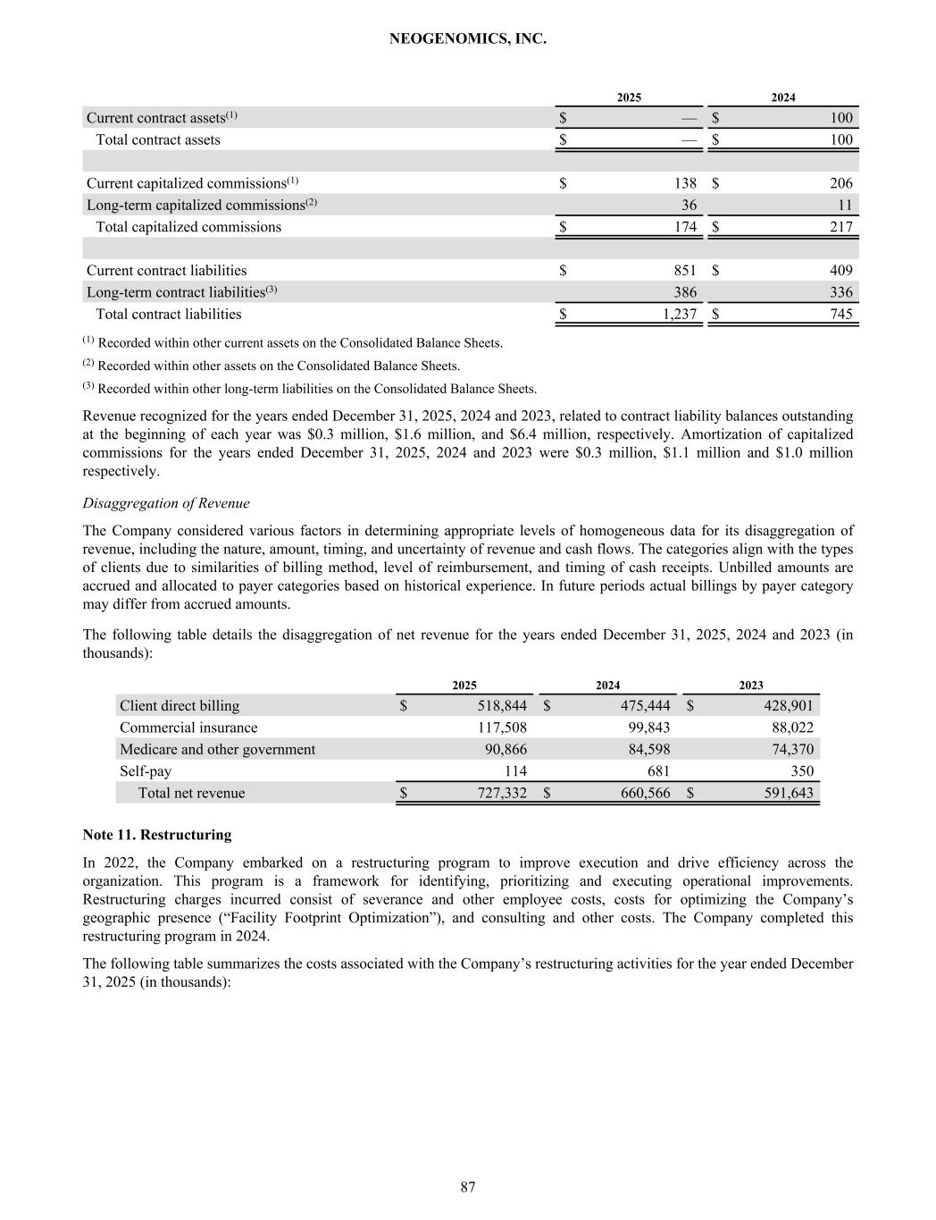 2025 2024 Current contract assets(1) $ — $ 100 Total contract assets $ — $ 100 Current capitalized commissions(1) $ 138 $ 206 Long-term capitalized commissions(2) 36 11 Total capitalized commissions $ 174 $ 217 Current contract liabilities $ 851 $ 409 Long-term contract liabilities(3) 386 336 Total contract liabilities $ 1,237 $ 745 (1) Recorded within other current assets on the Consolidated Balance Sheets. (2) Recorded within other assets on the Consolidated Balance Sheets. (3) Recorded within other long-term liabilities on the Consolidated Balance Sheets. Revenue recognized for the years ended December 31, 2025, 2024 and 2023, related to contract liability balances outstanding at the beginning of each year was $0.3 million, $1.6 million, and $6.4 million, respectively. Amortization of capitalized commissions for the years ended December 31, 2025, 2024 and 2023 were $0.3 million, $1.1 million and $1.0 million respectively. Disaggregation of Revenue The Company considered various factors in determining appropriate levels of homogeneous data for its disaggregation of revenue, including the nature, amount, timing, and uncertainty of revenue and cash flows. The categories align with the types of clients due to similarities of billing method, level of reimbursement, and timing of cash receipts. Unbilled amounts are accrued and allocated to payer categories based on historical experience. In future periods actual billings by payer category may differ from accrued amounts. The following table details the disaggregation of net revenue for the years ended December 31, 2025, 2024 and 2023 (in thousands): 2025 2024 2023 Client direct billing $ 518,844 $ 475,444 $ 428,901 Commercial insurance 117,508 99,843 88,022 Medicare and other government 90,866 84,598 74,370 Self-pay 114 681 350 Total net revenue $ 727,332 $ 660,566 $ 591,643 Note 11. Restructuring In 2022, the Company embarked on a restructuring program to improve execution and drive efficiency across the organization. This program is a framework for identifying, prioritizing and executing operational improvements. Restructuring charges incurred consist of severance and other employee costs, costs for optimizing the Company’s geographic presence (“Facility Footprint Optimization”), and consulting and other costs. The Company completed this restructuring program in 2024. The following table summarizes the costs associated with the Company’s restructuring activities for the year ended December 31, 2025 (in thousands): NEOGENOMICS, INC. 87
