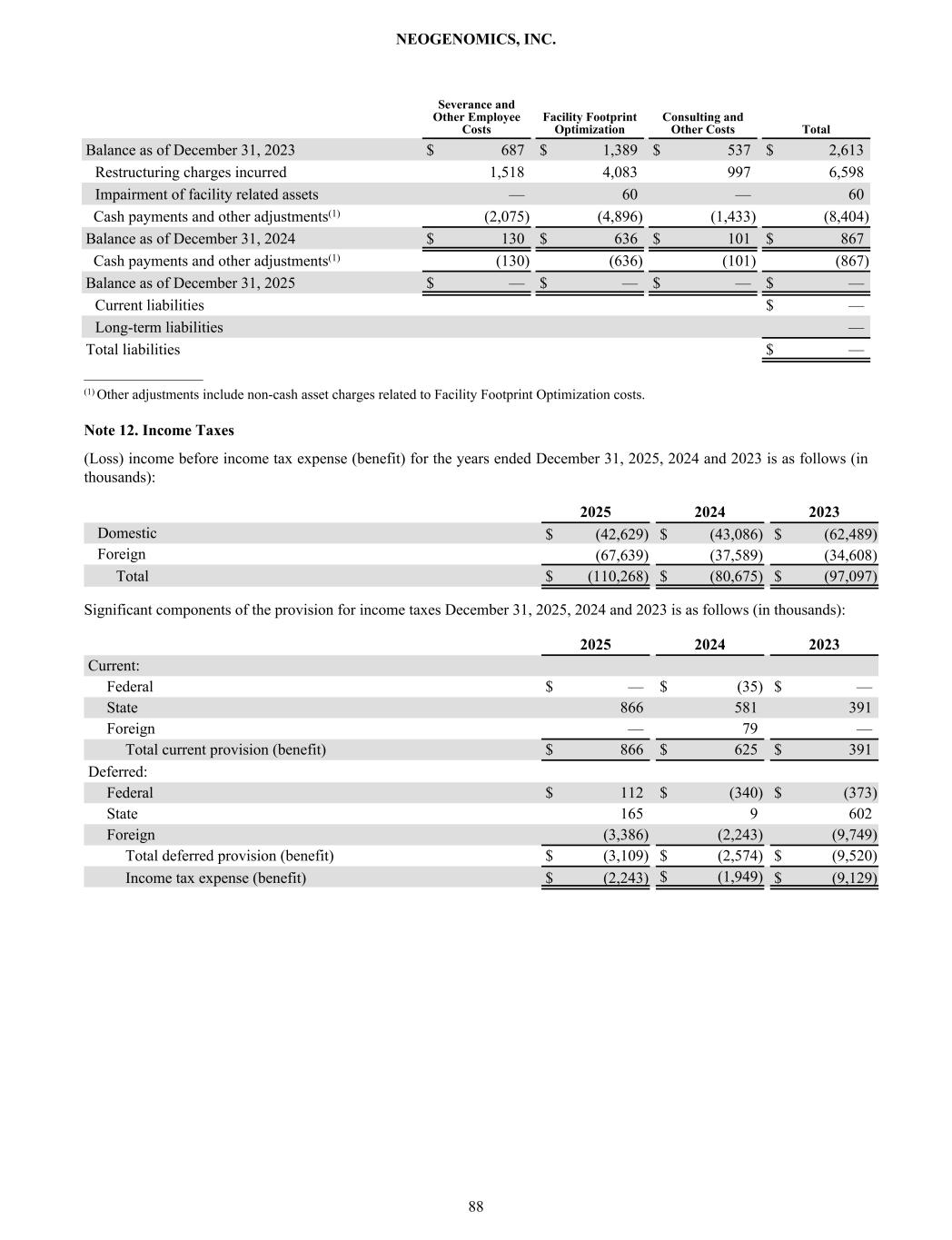 Severance and Other Employee Costs Facility Footprint Optimization Consulting and Other Costs Total Balance as of December 31, 2023 $ 687 $ 1,389 $ 537 $ 2,613 Restructuring charges incurred 1,518 4,083 997 6,598 Impairment of facility related assets — 60 — 60 Cash payments and other adjustments(1) (2,075) (4,896) (1,433) (8,404) Balance as of December 31, 2024 $ 130 $ 636 $ 101 $ 867 Cash payments and other adjustments(1) (130) (636) (101) (867) Balance as of December 31, 2025 $ — $ — $ — $ — Current liabilities $ — Long-term liabilities — Total liabilities $ — _________________ (1) Other adjustments include non-cash asset charges related to Facility Footprint Optimization costs. Note 12. Income Taxes (Loss) income before income tax expense (benefit) for the years ended December 31, 2025, 2024 and 2023 is as follows (in thousands): 2025 2024 2023 Domestic $ (42,629) $ (43,086) $ (62,489) Foreign (67,639) (37,589) (34,608) Total $ (110,268) $ (80,675) $ (97,097) Significant components of the provision for income taxes December 31, 2025, 2024 and 2023 is as follows (in thousands): 2025 2024 2023 Current: Federal $ — $ (35) $ — State 866 581 391 Foreign — 79 — Total current provision (benefit) $ 866 $ 625 $ 391 Deferred: Federal $ 112 $ (340) $ (373) State 165 9 602 Foreign (3,386) (2,243) (9,749) Total deferred provision (benefit) $ (3,109) $ (2,574) $ (9,520) Income tax expense (benefit) $ (2,243) $ (1,949) $ (9,129) NEOGENOMICS, INC. 88