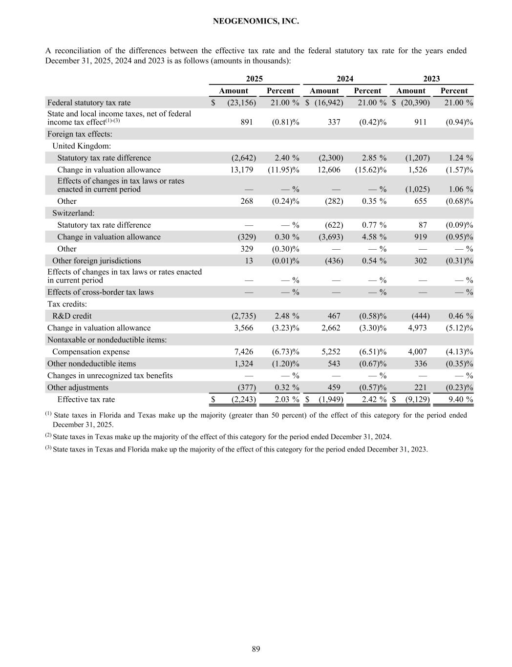 A reconciliation of the differences between the effective tax rate and the federal statutory tax rate for the years ended December 31, 2025, 2024 and 2023 is as follows (amounts in thousands): 2025 2024 2023 Amount Percent Amount Percent Amount Percent Federal statutory tax rate $ (23,156) 21.00 % $ (16,942) 21.00 % $ (20,390) 21.00 % State and local income taxes, net of federal income tax effect(1)-(3) 891 (0.81) % 337 (0.42) % 911 (0.94) % Foreign tax effects: United Kingdom: Statutory tax rate difference (2,642) 2.40 % (2,300) 2.85 % (1,207) 1.24 % Change in valuation allowance 13,179 (11.95) % 12,606 (15.62) % 1,526 (1.57) % Effects of changes in tax laws or rates enacted in current period — — % — — % (1,025) 1.06 % Other 268 (0.24) % (282) 0.35 % 655 (0.68) % Switzerland: Statutory tax rate difference — — % (622) 0.77 % 87 (0.09) % Change in valuation allowance (329) 0.30 % (3,693) 4.58 % 919 (0.95) % Other 329 (0.30) % — — % — — % Other foreign jurisdictions 13 (0.01) % (436) 0.54 % 302 (0.31) % Effects of changes in tax laws or rates enacted in current period — — % — — % — — % Effects of cross-border tax laws — — % — — % — — % Tax credits: R&D credit (2,735) 2.48 % 467 (0.58) % (444) 0.46 % Change in valuation allowance 3,566 (3.23) % 2,662 (3.30) % 4,973 (5.12) % Nontaxable or nondeductible items: Compensation expense 7,426 (6.73) % 5,252 (6.51) % 4,007 (4.13) % Other nondeductible items 1,324 (1.20) % 543 (0.67) % 336 (0.35) % Changes in unrecognized tax benefits — — % — — % — — % Other adjustments (377) 0.32 % 459 (0.57) % 221 (0.23) % Effective tax rate $ (2,243) 2.03 % $ (1,949) 2.42 % $ (9,129) 9.40 % (1) State taxes in Florida and Texas make up the majority (greater than 50 percent) of the effect of this category for the period ended December 31, 2025. (2) State taxes in Texas make up the majority of the effect of this category for the period ended December 31, 2024. (3) State taxes in Texas and Florida make up the majority of the effect of this category for the period ended December 31, 2023. NEOGENOMICS, INC. 89