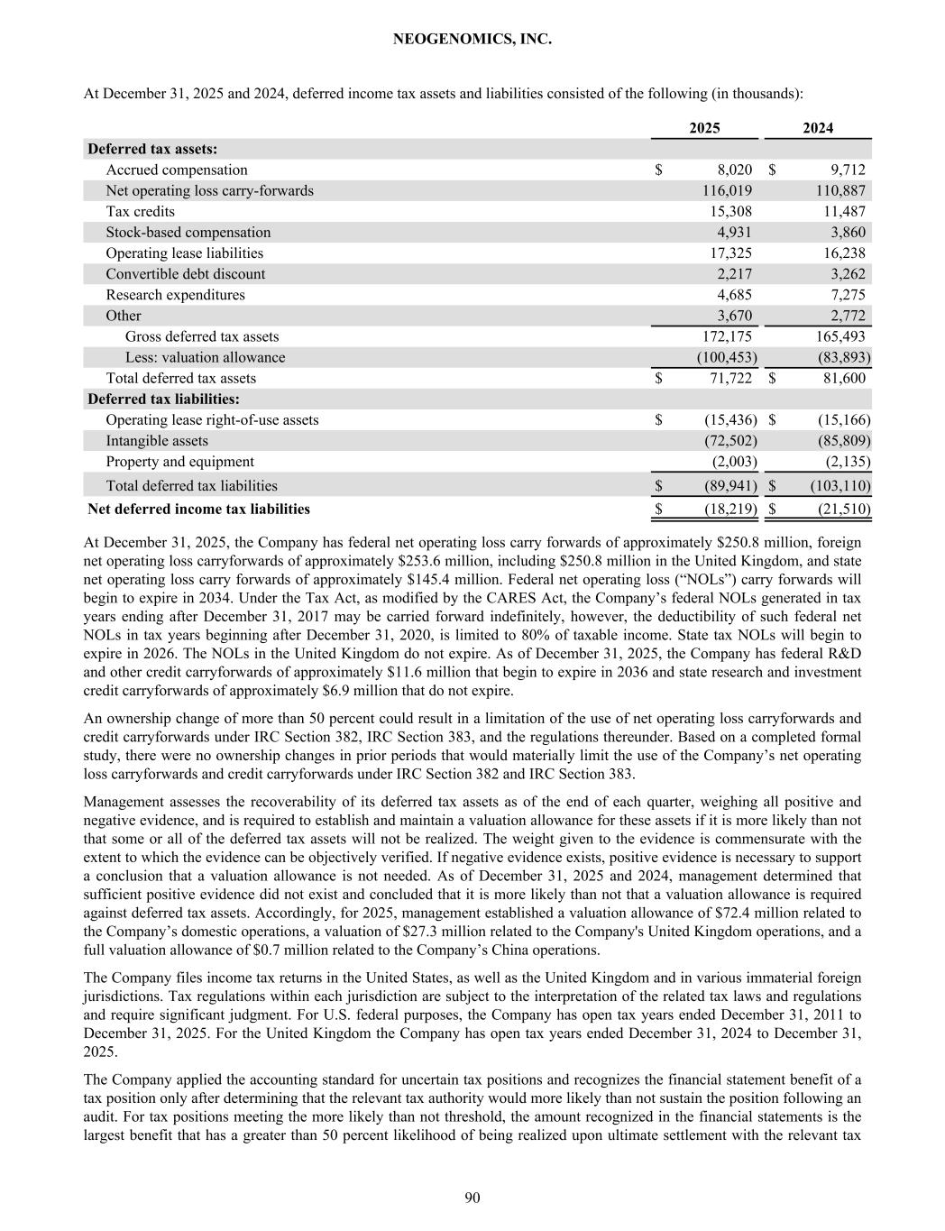 At December 31, 2025 and 2024, deferred income tax assets and liabilities consisted of the following (in thousands): 2025 2024 Deferred tax assets: Accrued compensation $ 8,020 $ 9,712 Net operating loss carry-forwards 116,019 110,887 Tax credits 15,308 11,487 Stock-based compensation 4,931 3,860 Operating lease liabilities 17,325 16,238 Convertible debt discount 2,217 3,262 Research expenditures 4,685 7,275 Other 3,670 2,772 Gross deferred tax assets 172,175 165,493 Less: valuation allowance (100,453) (83,893) Total deferred tax assets $ 71,722 $ 81,600 Deferred tax liabilities: Operating lease right-of-use assets $ (15,436) $ (15,166) Intangible assets (72,502) (85,809) Property and equipment (2,003) (2,135) Total deferred tax liabilities $ (89,941) $ (103,110) Net deferred income tax liabilities $ (18,219) $ (21,510) At December 31, 2025, the Company has federal net operating loss carry forwards of approximately $250.8 million, foreign net operating loss carryforwards of approximately $253.6 million, including $250.8 million in the United Kingdom, and state net operating loss carry forwards of approximately $145.4 million. Federal net operating loss (“NOLs”) carry forwards will begin to expire in 2034. Under the Tax Act, as modified by the CARES Act, the Company’s federal NOLs generated in tax years ending after December 31, 2017 may be carried forward indefinitely, however, the deductibility of such federal net NOLs in tax years beginning after December 31, 2020, is limited to 80% of taxable income. State tax NOLs will begin to expire in 2026. The NOLs in the United Kingdom do not expire. As of December 31, 2025, the Company has federal R&D and other credit carryforwards of approximately $11.6 million that begin to expire in 2036 and state research and investment credit carryforwards of approximately $6.9 million that do not expire. An ownership change of more than 50 percent could result in a limitation of the use of net operating loss carryforwards and credit carryforwards under IRC Section 382, IRC Section 383, and the regulations thereunder. Based on a completed formal study, there were no ownership changes in prior periods that would materially limit the use of the Company’s net operating loss carryforwards and credit carryforwards under IRC Section 382 and IRC Section 383. Management assesses the recoverability of its deferred tax assets as of the end of each quarter, weighing all positive and negative evidence, and is required to establish and maintain a valuation allowance for these assets if it is more likely than not that some or all of the deferred tax assets will not be realized. The weight given to the evidence is commensurate with the extent to which the evidence can be objectively verified. If negative evidence exists, positive evidence is necessary to support a conclusion that a valuation allowance is not needed. As of December 31, 2025 and 2024, management determined that sufficient positive evidence did not exist and concluded that it is more likely than not that a valuation allowance is required against deferred tax assets. Accordingly, for 2025, management established a valuation allowance of $72.4 million related to the Company’s domestic operations, a valuation of $27.3 million related to the Company's United Kingdom operations, and a full valuation allowance of $0.7 million related to the Company’s China operations. The Company files income tax returns in the United States, as well as the United Kingdom and in various immaterial foreign jurisdictions. Tax regulations within each jurisdiction are subject to the interpretation of the related tax laws and regulations and require significant judgment. For U.S. federal purposes, the Company has open tax years ended December 31, 2011 to December 31, 2025. For the United Kingdom the Company has open tax years ended December 31, 2024 to December 31, 2025. The Company applied the accounting standard for uncertain tax positions and recognizes the financial statement benefit of a tax position only after determining that the relevant tax authority would more likely than not sustain the position following an audit. For tax positions meeting the more likely than not threshold, the amount recognized in the financial statements is the largest benefit that has a greater than 50 percent likelihood of being realized upon ultimate settlement with the relevant tax NEOGENOMICS, INC. 90