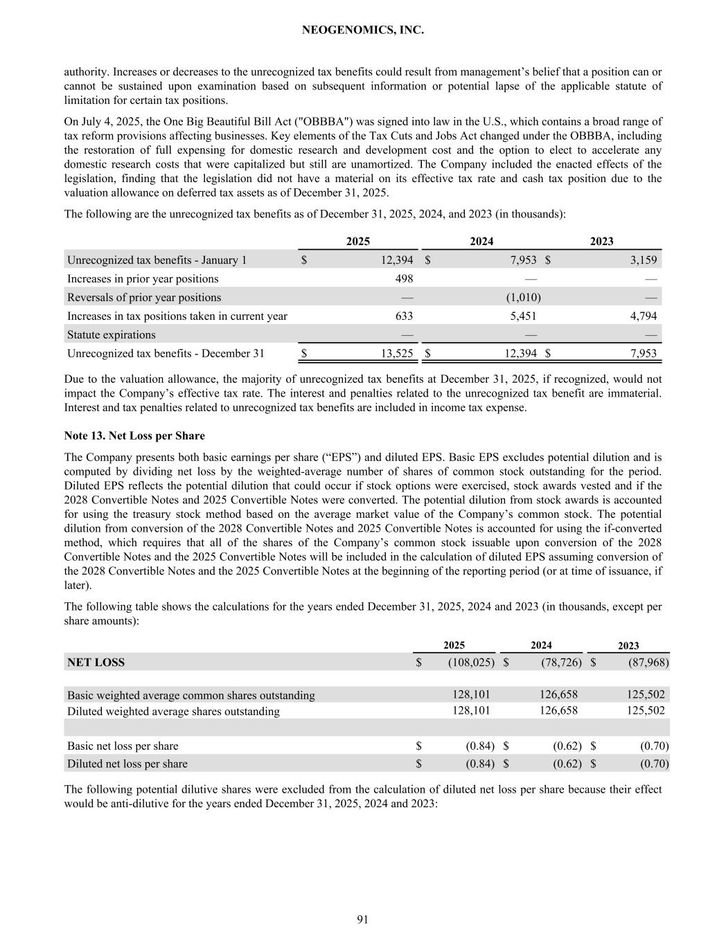 authority. Increases or decreases to the unrecognized tax benefits could result from management’s belief that a position can or cannot be sustained upon examination based on subsequent information or potential lapse of the applicable statute of limitation for certain tax positions. On July 4, 2025, the One Big Beautiful Bill Act ("OBBBA") was signed into law in the U.S., which contains a broad range of tax reform provisions affecting businesses. Key elements of the Tax Cuts and Jobs Act changed under the OBBBA, including the restoration of full expensing for domestic research and development cost and the option to elect to accelerate any domestic research costs that were capitalized but still are unamortized. The Company included the enacted effects of the legislation, finding that the legislation did not have a material on its effective tax rate and cash tax position due to the valuation allowance on deferred tax assets as of December 31, 2025. The following are the unrecognized tax benefits as of December 31, 2025, 2024, and 2023 (in thousands): 2025 2024 2023 Unrecognized tax benefits - January 1 $ 12,394 $ 7,953 $ 3,159 Increases in prior year positions 498 — — Reversals of prior year positions — (1,010) — Increases in tax positions taken in current year 633 5,451 4,794 Statute expirations — — — Unrecognized tax benefits - December 31 $ 13,525 $ 12,394 $ 7,953 Due to the valuation allowance, the majority of unrecognized tax benefits at December 31, 2025, if recognized, would not impact the Company’s effective tax rate. The interest and penalties related to the unrecognized tax benefit are immaterial. Interest and tax penalties related to unrecognized tax benefits are included in income tax expense. Note 13. Net Loss per Share The Company presents both basic earnings per share (“EPS”) and diluted EPS. Basic EPS excludes potential dilution and is computed by dividing net loss by the weighted-average number of shares of common stock outstanding for the period. Diluted EPS reflects the potential dilution that could occur if stock options were exercised, stock awards vested and if the 2028 Convertible Notes and 2025 Convertible Notes were converted. The potential dilution from stock awards is accounted for using the treasury stock method based on the average market value of the Company’s common stock. The potential dilution from conversion of the 2028 Convertible Notes and 2025 Convertible Notes is accounted for using the if-converted method, which requires that all of the shares of the Company’s common stock issuable upon conversion of the 2028 Convertible Notes and the 2025 Convertible Notes will be included in the calculation of diluted EPS assuming conversion of the 2028 Convertible Notes and the 2025 Convertible Notes at the beginning of the reporting period (or at time of issuance, if later). The following table shows the calculations for the years ended December 31, 2025, 2024 and 2023 (in thousands, except per share amounts): 2025 2024 2023 NET LOSS $ (108,025) $ (78,726) $ (87,968) Basic weighted average common shares outstanding 128,101 126,658 125,502 Diluted weighted average shares outstanding 128,101 126,658 125,502 Basic net loss per share $ (0.84) $ (0.62) $ (0.70) Diluted net loss per share $ (0.84) $ (0.62) $ (0.70) The following potential dilutive shares were excluded from the calculation of diluted net loss per share because their effect would be anti-dilutive for the years ended December 31, 2025, 2024 and 2023: NEOGENOMICS, INC. 91