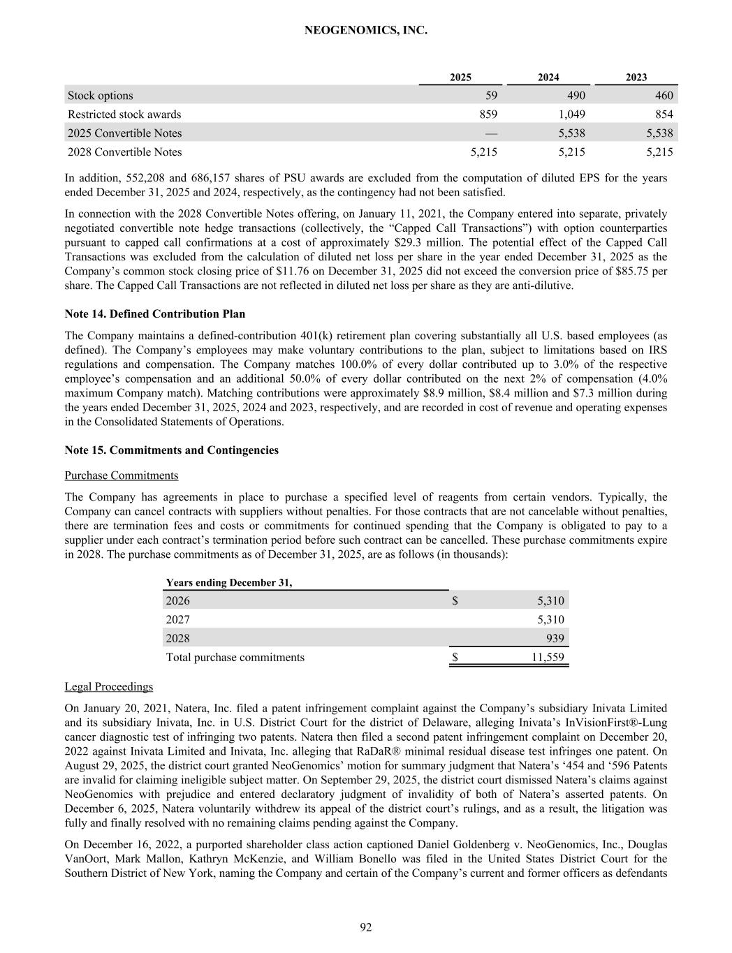 2025 2024 2023 Stock options 59 490 460 Restricted stock awards 859 1,049 854 2025 Convertible Notes — 5,538 5,538 2028 Convertible Notes 5,215 5,215 5,215 In addition, 552,208 and 686,157 shares of PSU awards are excluded from the computation of diluted EPS for the years ended December 31, 2025 and 2024, respectively, as the contingency had not been satisfied. In connection with the 2028 Convertible Notes offering, on January 11, 2021, the Company entered into separate, privately negotiated convertible note hedge transactions (collectively, the “Capped Call Transactions”) with option counterparties pursuant to capped call confirmations at a cost of approximately $29.3 million. The potential effect of the Capped Call Transactions was excluded from the calculation of diluted net loss per share in the year ended December 31, 2025 as the Company’s common stock closing price of $11.76 on December 31, 2025 did not exceed the conversion price of $85.75 per share. The Capped Call Transactions are not reflected in diluted net loss per share as they are anti-dilutive. Note 14. Defined Contribution Plan The Company maintains a defined-contribution 401(k) retirement plan covering substantially all U.S. based employees (as defined). The Company’s employees may make voluntary contributions to the plan, subject to limitations based on IRS regulations and compensation. The Company matches 100.0% of every dollar contributed up to 3.0% of the respective employee’s compensation and an additional 50.0% of every dollar contributed on the next 2% of compensation (4.0% maximum Company match). Matching contributions were approximately $8.9 million, $8.4 million and $7.3 million during the years ended December 31, 2025, 2024 and 2023, respectively, and are recorded in cost of revenue and operating expenses in the Consolidated Statements of Operations. Note 15. Commitments and Contingencies Purchase Commitments The Company has agreements in place to purchase a specified level of reagents from certain vendors. Typically, the Company can cancel contracts with suppliers without penalties. For those contracts that are not cancelable without penalties, there are termination fees and costs or commitments for continued spending that the Company is obligated to pay to a supplier under each contract’s termination period before such contract can be cancelled. These purchase commitments expire in 2028. The purchase commitments as of December 31, 2025, are as follows (in thousands): Years ending December 31, 2026 $ 5,310 2027 5,310 2028 939 Total purchase commitments $ 11,559 Legal Proceedings On January 20, 2021, Natera, Inc. filed a patent infringement complaint against the Company’s subsidiary Inivata Limited and its subsidiary Inivata, Inc. in U.S. District Court for the district of Delaware, alleging Inivata’s InVisionFirst®-Lung cancer diagnostic test of infringing two patents. Natera then filed a second patent infringement complaint on December 20, 2022 against Inivata Limited and Inivata, Inc. alleging that RaDaR® minimal residual disease test infringes one patent. On August 29, 2025, the district court granted NeoGenomics’ motion for summary judgment that Natera’s ‘454 and ‘596 Patents are invalid for claiming ineligible subject matter. On September 29, 2025, the district court dismissed Natera’s claims against NeoGenomics with prejudice and entered declaratory judgment of invalidity of both of Natera’s asserted patents. On December 6, 2025, Natera voluntarily withdrew its appeal of the district court’s rulings, and as a result, the litigation was fully and finally resolved with no remaining claims pending against the Company. On December 16, 2022, a purported shareholder class action captioned Daniel Goldenberg v. NeoGenomics, Inc., Douglas VanOort, Mark Mallon, Kathryn McKenzie, and William Bonello was filed in the United States District Court for the Southern District of New York, naming the Company and certain of the Company’s current and former officers as defendants NEOGENOMICS, INC. 92