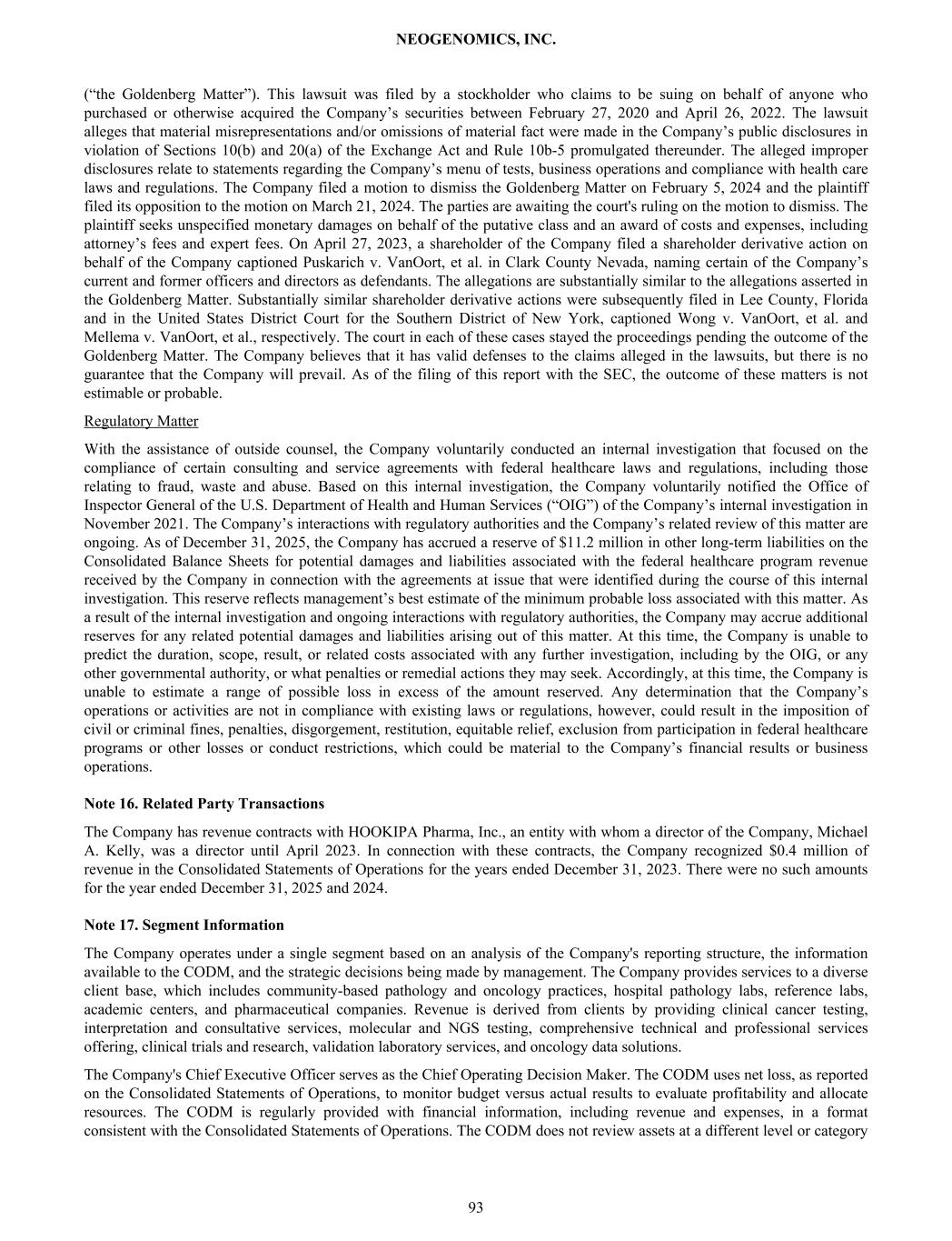 (“the Goldenberg Matter”). This lawsuit was filed by a stockholder who claims to be suing on behalf of anyone who purchased or otherwise acquired the Company’s securities between February 27, 2020 and April 26, 2022. The lawsuit alleges that material misrepresentations and/or omissions of material fact were made in the Company’s public disclosures in violation of Sections 10(b) and 20(a) of the Exchange Act and Rule 10b-5 promulgated thereunder. The alleged improper disclosures relate to statements regarding the Company’s menu of tests, business operations and compliance with health care laws and regulations. The Company filed a motion to dismiss the Goldenberg Matter on February 5, 2024 and the plaintiff filed its opposition to the motion on March 21, 2024. The parties are awaiting the court's ruling on the motion to dismiss. The plaintiff seeks unspecified monetary damages on behalf of the putative class and an award of costs and expenses, including attorney’s fees and expert fees. On April 27, 2023, a shareholder of the Company filed a shareholder derivative action on behalf of the Company captioned Puskarich v. VanOort, et al. in Clark County Nevada, naming certain of the Company’s current and former officers and directors as defendants. The allegations are substantially similar to the allegations asserted in the Goldenberg Matter. Substantially similar shareholder derivative actions were subsequently filed in Lee County, Florida and in the United States District Court for the Southern District of New York, captioned Wong v. VanOort, et al. and Mellema v. VanOort, et al., respectively. The court in each of these cases stayed the proceedings pending the outcome of the Goldenberg Matter. The Company believes that it has valid defenses to the claims alleged in the lawsuits, but there is no guarantee that the Company will prevail. As of the filing of this report with the SEC, the outcome of these matters is not estimable or probable. Regulatory Matter With the assistance of outside counsel, the Company voluntarily conducted an internal investigation that focused on the compliance of certain consulting and service agreements with federal healthcare laws and regulations, including those relating to fraud, waste and abuse. Based on this internal investigation, the Company voluntarily notified the Office of Inspector General of the U.S. Department of Health and Human Services (“OIG”) of the Company’s internal investigation in November 2021. The Company’s interactions with regulatory authorities and the Company’s related review of this matter are ongoing. As of December 31, 2025, the Company has accrued a reserve of $11.2 million in other long-term liabilities on the Consolidated Balance Sheets for potential damages and liabilities associated with the federal healthcare program revenue received by the Company in connection with the agreements at issue that were identified during the course of this internal investigation. This reserve reflects management’s best estimate of the minimum probable loss associated with this matter. As a result of the internal investigation and ongoing interactions with regulatory authorities, the Company may accrue additional reserves for any related potential damages and liabilities arising out of this matter. At this time, the Company is unable to predict the duration, scope, result, or related costs associated with any further investigation, including by the OIG, or any other governmental authority, or what penalties or remedial actions they may seek. Accordingly, at this time, the Company is unable to estimate a range of possible loss in excess of the amount reserved. Any determination that the Company’s operations or activities are not in compliance with existing laws or regulations, however, could result in the imposition of civil or criminal fines, penalties, disgorgement, restitution, equitable relief, exclusion from participation in federal healthcare programs or other losses or conduct restrictions, which could be material to the Company’s financial results or business operations. Note 16. Related Party Transactions The Company has revenue contracts with HOOKIPA Pharma, Inc., an entity with whom a director of the Company, Michael A. Kelly, was a director until April 2023. In connection with these contracts, the Company recognized $0.4 million of revenue in the Consolidated Statements of Operations for the years ended December 31, 2023. There were no such amounts for the year ended December 31, 2025 and 2024. Note 17. Segment Information The Company operates under a single segment based on an analysis of the Company's reporting structure, the information available to the CODM, and the strategic decisions being made by management. The Company provides services to a diverse client base, which includes community-based pathology and oncology practices, hospital pathology labs, reference labs, academic centers, and pharmaceutical companies. Revenue is derived from clients by providing clinical cancer testing, interpretation and consultative services, molecular and NGS testing, comprehensive technical and professional services offering, clinical trials and research, validation laboratory services, and oncology data solutions. The Company's Chief Executive Officer serves as the Chief Operating Decision Maker. The CODM uses net loss, as reported on the Consolidated Statements of Operations, to monitor budget versus actual results to evaluate profitability and allocate resources. The CODM is regularly provided with financial information, including revenue and expenses, in a format consistent with the Consolidated Statements of Operations. The CODM does not review assets at a different level or category NEOGENOMICS, INC. 93