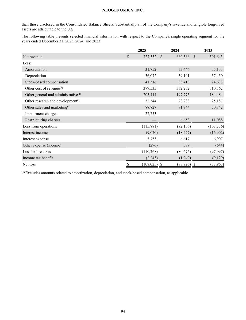than those disclosed in the Consolidated Balance Sheets. Substantially all of the Company's revenue and tangible long-lived assets are attributable to the U.S. The following table presents selected financial information with respect to the Company's single operating segment for the years ended December 31, 2025, 2024, and 2023: 2025 2024 2023 Net revenue $ 727,332 $ 660,566 $ 591,643 Less: Amortization 31,752 33,446 35,133 Depreciation 36,072 39,101 37,450 Stock-based compensation 41,316 33,413 24,633 Other cost of revenue(1) 379,535 332,252 310,562 Other general and administrative(1) 205,414 197,775 184,484 Other research and development(1) 32,544 28,283 25,187 Other sales and marketing(1) 88,827 81,744 70,842 Impairment charges 27,753 — — Restructuring charges — 6,658 11,088 Loss from operations (115,881) (92,106) (107,736) Interest income (9,070) (18,427) (16,902) Interest expense 3,753 6,617 6,907 Other expense (income) (296) 379 (644) Loss before taxes (110,268) (80,675) (97,097) Income tax benefit (2,243) (1,949) (9,129) Net loss $ (108,025) $ (78,726) $ (87,968) (1) Excludes amounts related to amortization, depreciation, and stock-based compensation, as applicable. NEOGENOMICS, INC. 94