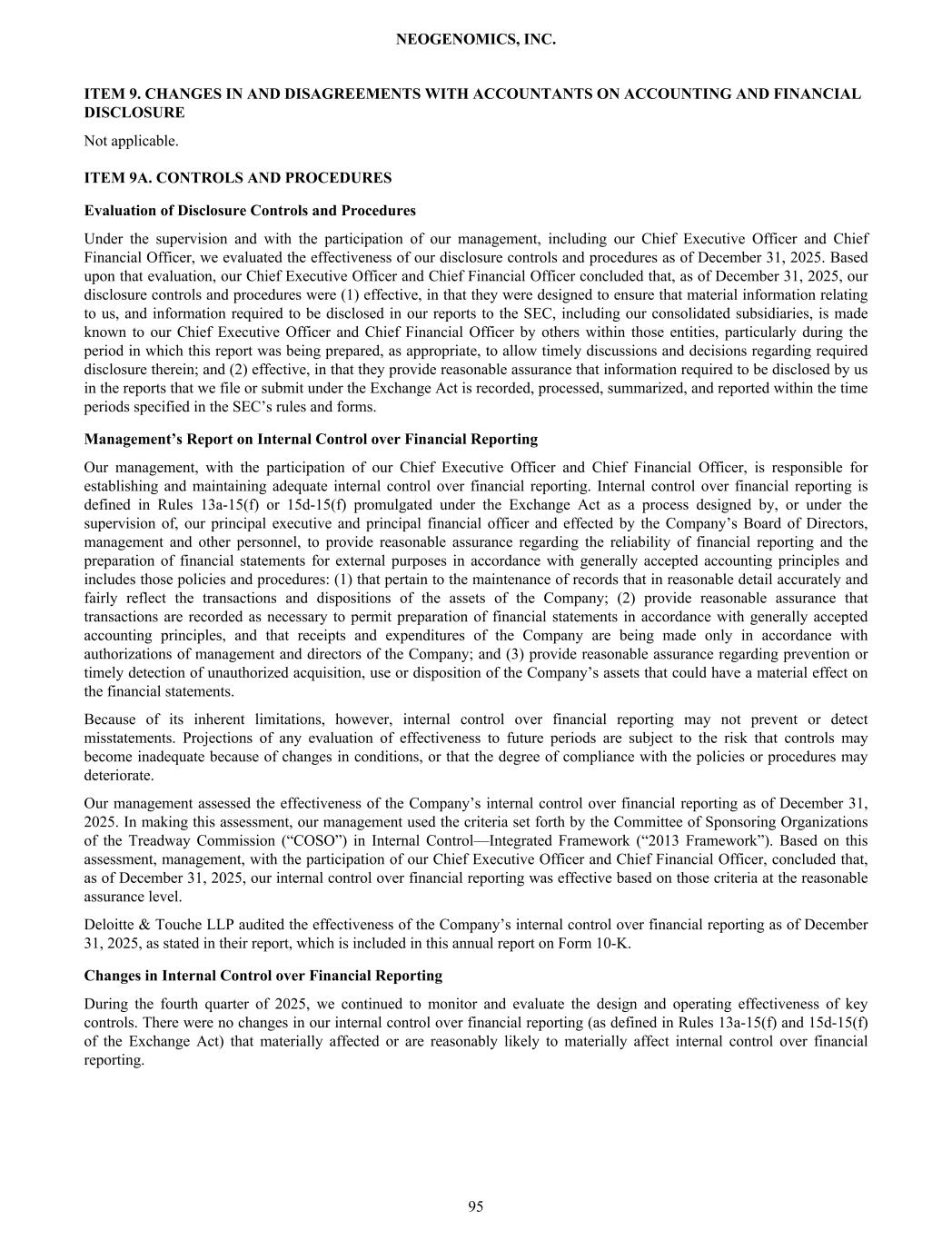 ITEM 9. CHANGES IN AND DISAGREEMENTS WITH ACCOUNTANTS ON ACCOUNTING AND FINANCIAL DISCLOSURE Not applicable. ITEM 9A. CONTROLS AND PROCEDURES Evaluation of Disclosure Controls and Procedures Under the supervision and with the participation of our management, including our Chief Executive Officer and Chief Financial Officer, we evaluated the effectiveness of our disclosure controls and procedures as of December 31, 2025. Based upon that evaluation, our Chief Executive Officer and Chief Financial Officer concluded that, as of December 31, 2025, our disclosure controls and procedures were (1) effective, in that they were designed to ensure that material information relating to us, and information required to be disclosed in our reports to the SEC, including our consolidated subsidiaries, is made known to our Chief Executive Officer and Chief Financial Officer by others within those entities, particularly during the period in which this report was being prepared, as appropriate, to allow timely discussions and decisions regarding required disclosure therein; and (2) effective, in that they provide reasonable assurance that information required to be disclosed by us in the reports that we file or submit under the Exchange Act is recorded, processed, summarized, and reported within the time periods specified in the SEC’s rules and forms. Management’s Report on Internal Control over Financial Reporting Our management, with the participation of our Chief Executive Officer and Chief Financial Officer, is responsible for establishing and maintaining adequate internal control over financial reporting. Internal control over financial reporting is defined in Rules 13a-15(f) or 15d-15(f) promulgated under the Exchange Act as a process designed by, or under the supervision of, our principal executive and principal financial officer and effected by the Company’s Board of Directors, management and other personnel, to provide reasonable assurance regarding the reliability of financial reporting and the preparation of financial statements for external purposes in accordance with generally accepted accounting principles and includes those policies and procedures: (1) that pertain to the maintenance of records that in reasonable detail accurately and fairly reflect the transactions and dispositions of the assets of the Company; (2) provide reasonable assurance that transactions are recorded as necessary to permit preparation of financial statements in accordance with generally accepted accounting principles, and that receipts and expenditures of the Company are being made only in accordance with authorizations of management and directors of the Company; and (3) provide reasonable assurance regarding prevention or timely detection of unauthorized acquisition, use or disposition of the Company’s assets that could have a material effect on the financial statements. Because of its inherent limitations, however, internal control over financial reporting may not prevent or detect misstatements. Projections of any evaluation of effectiveness to future periods are subject to the risk that controls may become inadequate because of changes in conditions, or that the degree of compliance with the policies or procedures may deteriorate. Our management assessed the effectiveness of the Company’s internal control over financial reporting as of December 31, 2025. In making this assessment, our management used the criteria set forth by the Committee of Sponsoring Organizations of the Treadway Commission (“COSO”) in Internal Control—Integrated Framework (“2013 Framework”). Based on this assessment, management, with the participation of our Chief Executive Officer and Chief Financial Officer, concluded that, as of December 31, 2025, our internal control over financial reporting was effective based on those criteria at the reasonable assurance level. Deloitte & Touche LLP audited the effectiveness of the Company’s internal control over financial reporting as of December 31, 2025, as stated in their report, which is included in this annual report on Form 10-K. Changes in Internal Control over Financial Reporting During the fourth quarter of 2025, we continued to monitor and evaluate the design and operating effectiveness of key controls. There were no changes in our internal control over financial reporting (as defined in Rules 13a-15(f) and 15d-15(f) of the Exchange Act) that materially affected or are reasonably likely to materially affect internal control over financial reporting. NEOGENOMICS, INC. 95