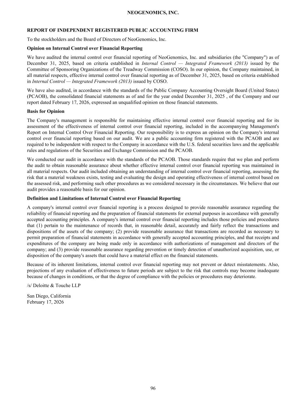 REPORT OF INDEPENDENT REGISTERED PUBLIC ACCOUNTING FIRM To the stockholders and the Board of Directors of NeoGenomics, Inc. Opinion on Internal Control over Financial Reporting We have audited the internal control over financial reporting of NeoGenomics, Inc. and subsidiaries (the "Company") as of December 31, 2025, based on criteria established in Internal Control — Integrated Framework (2013) issued by the Committee of Sponsoring Organizations of the Treadway Commission (COSO). In our opinion, the Company maintained, in all material respects, effective internal control over financial reporting as of December 31, 2025, based on criteria established in Internal Control — Integrated Framework (2013) issued by COSO. We have also audited, in accordance with the standards of the Public Company Accounting Oversight Board (United States) (PCAOB), the consolidated financial statements as of and for the year ended December 31, 2025 , of the Company and our report dated February 17, 2026, expressed an unqualified opinion on those financial statements. Basis for Opinion The Company's management is responsible for maintaining effective internal control over financial reporting and for its assessment of the effectiveness of internal control over financial reporting, included in the accompanying Management's Report on Internal Control Over Financial Reporting. Our responsibility is to express an opinion on the Company's internal control over financial reporting based on our audit. We are a public accounting firm registered with the PCAOB and are required to be independent with respect to the Company in accordance with the U.S. federal securities laws and the applicable rules and regulations of the Securities and Exchange Commission and the PCAOB. We conducted our audit in accordance with the standards of the PCAOB. Those standards require that we plan and perform the audit to obtain reasonable assurance about whether effective internal control over financial reporting was maintained in all material respects. Our audit included obtaining an understanding of internal control over financial reporting, assessing the risk that a material weakness exists, testing and evaluating the design and operating effectiveness of internal control based on the assessed risk, and performing such other procedures as we considered necessary in the circumstances. We believe that our audit provides a reasonable basis for our opinion. Definition and Limitations of Internal Control over Financial Reporting A company's internal control over financial reporting is a process designed to provide reasonable assurance regarding the reliability of financial reporting and the preparation of financial statements for external purposes in accordance with generally accepted accounting principles. A company's internal control over financial reporting includes those policies and procedures that (1) pertain to the maintenance of records that, in reasonable detail, accurately and fairly reflect the transactions and dispositions of the assets of the company; (2) provide reasonable assurance that transactions are recorded as necessary to permit preparation of financial statements in accordance with generally accepted accounting principles, and that receipts and expenditures of the company are being made only in accordance with authorizations of management and directors of the company; and (3) provide reasonable assurance regarding prevention or timely detection of unauthorized acquisition, use, or disposition of the company's assets that could have a material effect on the financial statements. Because of its inherent limitations, internal control over financial reporting may not prevent or detect misstatements. Also, projections of any evaluation of effectiveness to future periods are subject to the risk that controls may become inadequate because of changes in conditions, or that the degree of compliance with the policies or procedures may deteriorate. /s/ Deloitte & Touche LLP San Diego, California February 17, 2026 NEOGENOMICS, INC. 96