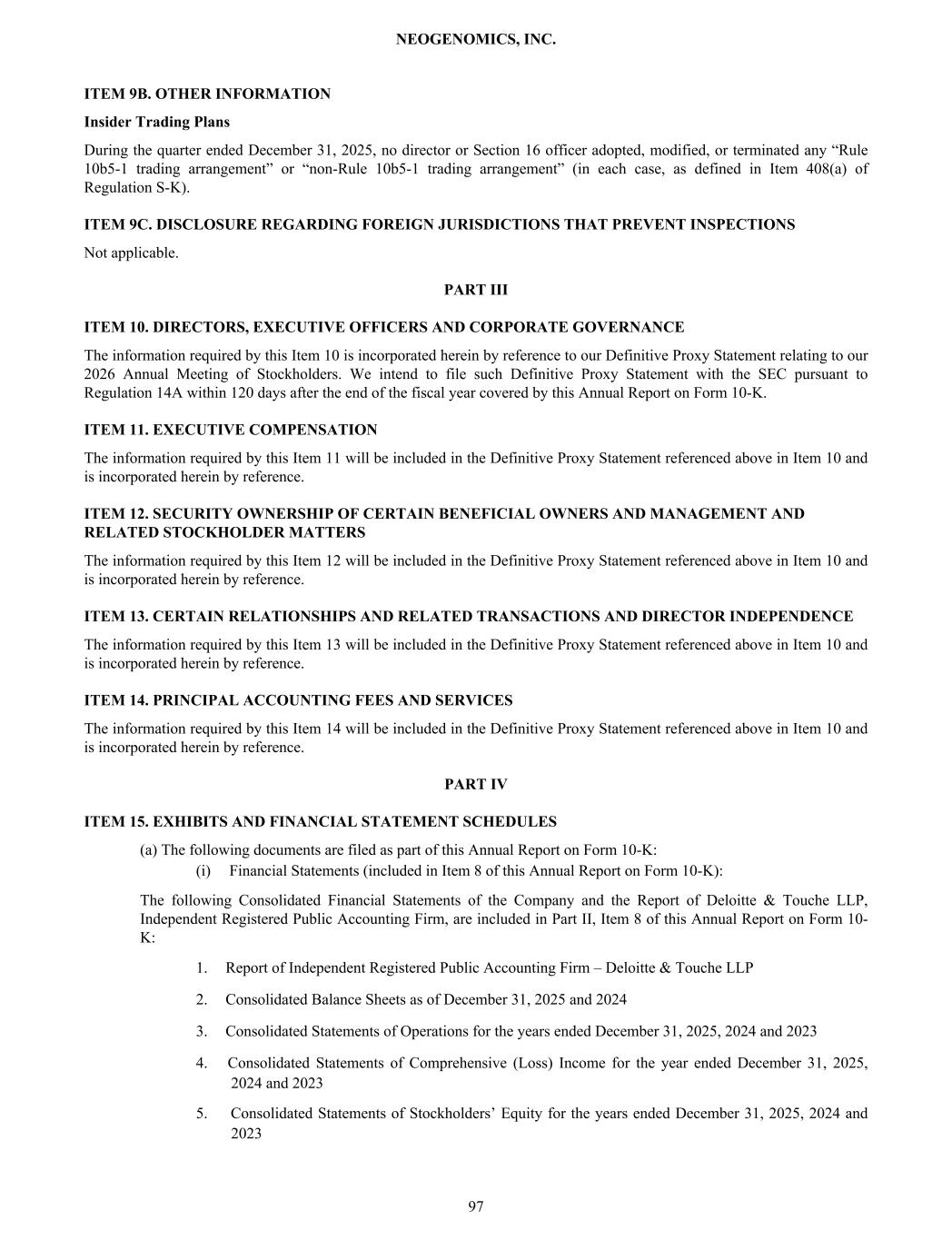 ITEM 9B. OTHER INFORMATION Insider Trading Plans During the quarter ended December 31, 2025, no director or Section 16 officer adopted, modified, or terminated any “Rule 10b5-1 trading arrangement” or “non-Rule 10b5-1 trading arrangement” (in each case, as defined in Item 408(a) of Regulation S-K). ITEM 9C. DISCLOSURE REGARDING FOREIGN JURISDICTIONS THAT PREVENT INSPECTIONS Not applicable. PART III ITEM 10. DIRECTORS, EXECUTIVE OFFICERS AND CORPORATE GOVERNANCE The information required by this Item 10 is incorporated herein by reference to our Definitive Proxy Statement relating to our 2026 Annual Meeting of Stockholders. We intend to file such Definitive Proxy Statement with the SEC pursuant to Regulation 14A within 120 days after the end of the fiscal year covered by this Annual Report on Form 10-K. ITEM 11. EXECUTIVE COMPENSATION The information required by this Item 11 will be included in the Definitive Proxy Statement referenced above in Item 10 and is incorporated herein by reference. ITEM 12. SECURITY OWNERSHIP OF CERTAIN BENEFICIAL OWNERS AND MANAGEMENT AND RELATED STOCKHOLDER MATTERS The information required by this Item 12 will be included in the Definitive Proxy Statement referenced above in Item 10 and is incorporated herein by reference. ITEM 13. CERTAIN RELATIONSHIPS AND RELATED TRANSACTIONS AND DIRECTOR INDEPENDENCE The information required by this Item 13 will be included in the Definitive Proxy Statement referenced above in Item 10 and is incorporated herein by reference. ITEM 14. PRINCIPAL ACCOUNTING FEES AND SERVICES The information required by this Item 14 will be included in the Definitive Proxy Statement referenced above in Item 10 and is incorporated herein by reference. PART IV ITEM 15. EXHIBITS AND FINANCIAL STATEMENT SCHEDULES (a) The following documents are filed as part of this Annual Report on Form 10-K: (i) Financial Statements (included in Item 8 of this Annual Report on Form 10-K): The following Consolidated Financial Statements of the Company and the Report of Deloitte & Touche LLP, Independent Registered Public Accounting Firm, are included in Part II, Item 8 of this Annual Report on Form 10- K: 1. Report of Independent Registered Public Accounting Firm – Deloitte & Touche LLP 2. Consolidated Balance Sheets as of December 31, 2025 and 2024 3. Consolidated Statements of Operations for the years ended December 31, 2025, 2024 and 2023 4. Consolidated Statements of Comprehensive (Loss) Income for the year ended December 31, 2025, 2024 and 2023 5. Consolidated Statements of Stockholders’ Equity for the years ended December 31, 2025, 2024 and 2023 NEOGENOMICS, INC. 97