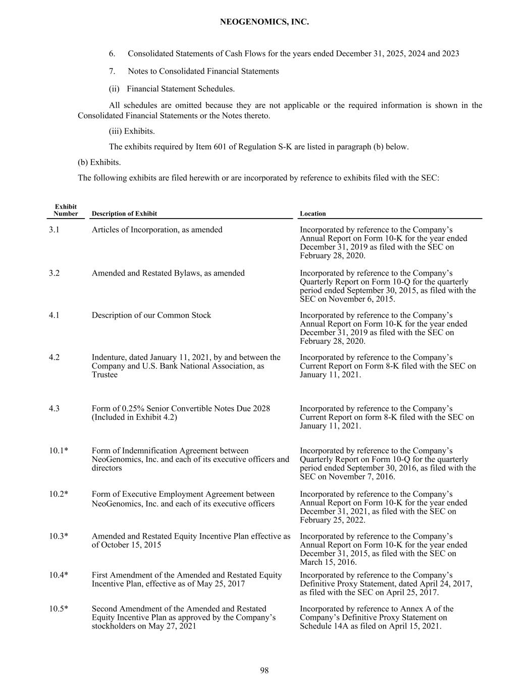 6. Consolidated Statements of Cash Flows for the years ended December 31, 2025, 2024 and 2023 7. Notes to Consolidated Financial Statements (ii) Financial Statement Schedules. All schedules are omitted because they are not applicable or the required information is shown in the Consolidated Financial Statements or the Notes thereto. (iii) Exhibits. The exhibits required by Item 601 of Regulation S-K are listed in paragraph (b) below. (b) Exhibits. The following exhibits are filed herewith or are incorporated by reference to exhibits filed with the SEC: Exhibit Number Description of Exhibit Location 3.1 Articles of Incorporation, as amended Incorporated by reference to the Company’s Annual Report on Form 10-K for the year ended December 31, 2019 as filed with the SEC on February 28, 2020. 3.2 Amended and Restated Bylaws, as amended Incorporated by reference to the Company’s Quarterly Report on Form 10-Q for the quarterly period ended September 30, 2015, as filed with the SEC on November 6, 2015. 4.1 Description of our Common Stock Incorporated by reference to the Company’s Annual Report on Form 10-K for the year ended December 31, 2019 as filed with the SEC on February 28, 2020. 4.2 Indenture, dated January 11, 2021, by and between the Company and U.S. Bank National Association, as Trustee Incorporated by reference to the Company’s Current Report on Form 8-K filed with the SEC on January 11, 2021. 4.3 Form of 0.25% Senior Convertible Notes Due 2028 (Included in Exhibit 4.2) Incorporated by reference to the Company’s Current Report on form 8-K filed with the SEC on January 11, 2021. 10.1* Form of Indemnification Agreement between NeoGenomics, Inc. and each of its executive officers and directors Incorporated by reference to the Company’s Quarterly Report on Form 10-Q for the quarterly period ended September 30, 2016, as filed with the SEC on November 7, 2016. 10.2* Form of Executive Employment Agreement between NeoGenomics, Inc. and each of its executive officers Incorporated by reference to the Company’s Annual Report on Form 10-K for the year ended December 31, 2021, as filed with the SEC on February 25, 2022. 10.3* Amended and Restated Equity Incentive Plan effective as of October 15, 2015 Incorporated by reference to the Company’s Annual Report on Form 10-K for the year ended December 31, 2015, as filed with the SEC on March 15, 2016. 10.4* First Amendment of the Amended and Restated Equity Incentive Plan, effective as of May 25, 2017 Incorporated by reference to the Company’s Definitive Proxy Statement, dated April 24, 2017, as filed with the SEC on April 25, 2017. 10.5* Second Amendment of the Amended and Restated Equity Incentive Plan as approved by the Company’s stockholders on May 27, 2021 Incorporated by reference to Annex A of the Company’s Definitive Proxy Statement on Schedule 14A as filed on April 15, 2021. NEOGENOMICS, INC. 98