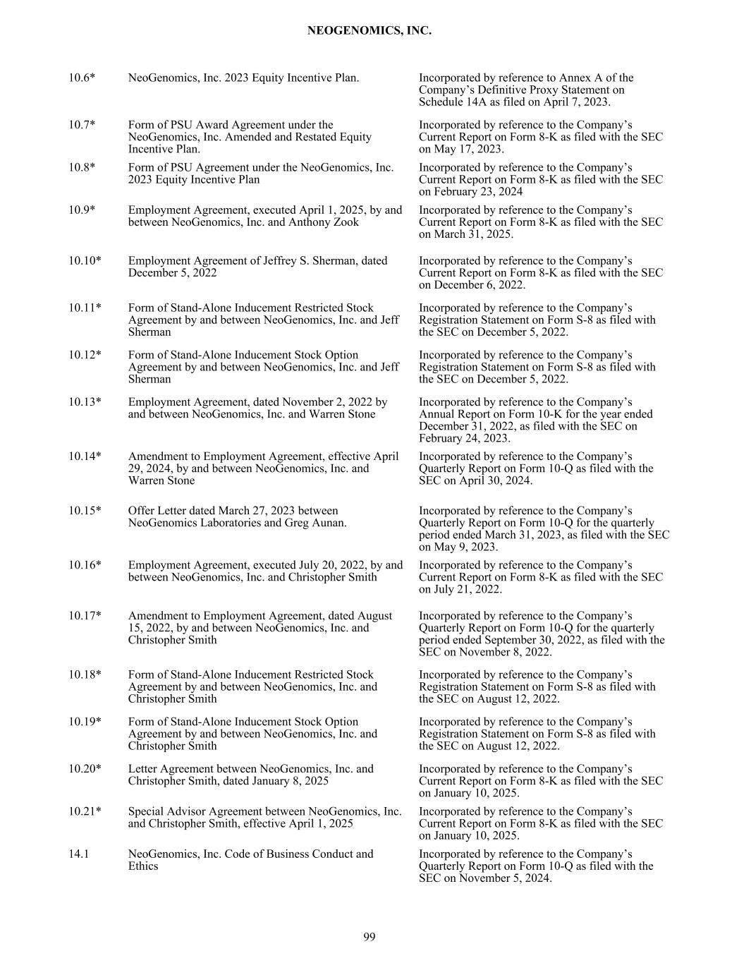 10.6* NeoGenomics, Inc. 2023 Equity Incentive Plan. Incorporated by reference to Annex A of the Company’s Definitive Proxy Statement on Schedule 14A as filed on April 7, 2023. 10.7* Form of PSU Award Agreement under the NeoGenomics, Inc. Amended and Restated Equity Incentive Plan. Incorporated by reference to the Company’s Current Report on Form 8-K as filed with the SEC on May 17, 2023. 10.8* Form of PSU Agreement under the NeoGenomics, Inc. 2023 Equity Incentive Plan Incorporated by reference to the Company’s Current Report on Form 8-K as filed with the SEC on February 23, 2024 10.9* Employment Agreement, executed April 1, 2025, by and between NeoGenomics, Inc. and Anthony Zook Incorporated by reference to the Company’s Current Report on Form 8-K as filed with the SEC on March 31, 2025. 10.10* Employment Agreement of Jeffrey S. Sherman, dated December 5, 2022 Incorporated by reference to the Company’s Current Report on Form 8-K as filed with the SEC on December 6, 2022. 10.11* Form of Stand-Alone Inducement Restricted Stock Agreement by and between NeoGenomics, Inc. and Jeff Sherman Incorporated by reference to the Company’s Registration Statement on Form S-8 as filed with the SEC on December 5, 2022. 10.12* Form of Stand-Alone Inducement Stock Option Agreement by and between NeoGenomics, Inc. and Jeff Sherman Incorporated by reference to the Company’s Registration Statement on Form S-8 as filed with the SEC on December 5, 2022. 10.13* Employment Agreement, dated November 2, 2022 by and between NeoGenomics, Inc. and Warren Stone Incorporated by reference to the Company’s Annual Report on Form 10-K for the year ended December 31, 2022, as filed with the SEC on February 24, 2023. 10.14* Amendment to Employment Agreement, effective April 29, 2024, by and between NeoGenomics, Inc. and Warren Stone Incorporated by reference to the Company’s Quarterly Report on Form 10-Q as filed with the SEC on April 30, 2024. 10.15* Offer Letter dated March 27, 2023 between NeoGenomics Laboratories and Greg Aunan. Incorporated by reference to the Company’s Quarterly Report on Form 10-Q for the quarterly period ended March 31, 2023, as filed with the SEC on May 9, 2023. 10.16* Employment Agreement, executed July 20, 2022, by and between NeoGenomics, Inc. and Christopher Smith Incorporated by reference to the Company’s Current Report on Form 8-K as filed with the SEC on July 21, 2022. 10.17* Amendment to Employment Agreement, dated August 15, 2022, by and between NeoGenomics, Inc. and Christopher Smith Incorporated by reference to the Company’s Quarterly Report on Form 10-Q for the quarterly period ended September 30, 2022, as filed with the SEC on November 8, 2022. 10.18* Form of Stand-Alone Inducement Restricted Stock Agreement by and between NeoGenomics, Inc. and Christopher Smith Incorporated by reference to the Company’s Registration Statement on Form S-8 as filed with the SEC on August 12, 2022. 10.19* Form of Stand-Alone Inducement Stock Option Agreement by and between NeoGenomics, Inc. and Christopher Smith Incorporated by reference to the Company’s Registration Statement on Form S-8 as filed with the SEC on August 12, 2022. 10.20* Letter Agreement between NeoGenomics, Inc. and Christopher Smith, dated January 8, 2025 Incorporated by reference to the Company’s Current Report on Form 8-K as filed with the SEC on January 10, 2025. 10.21* Special Advisor Agreement between NeoGenomics, Inc. and Christopher Smith, effective April 1, 2025 Incorporated by reference to the Company’s Current Report on Form 8-K as filed with the SEC on January 10, 2025. 14.1 NeoGenomics, Inc. Code of Business Conduct and Ethics Incorporated by reference to the Company’s Quarterly Report on Form 10-Q as filed with the SEC on November 5, 2024. NEOGENOMICS, INC. 99