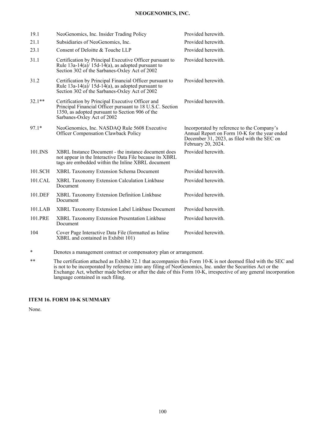 19.1 NeoGenomics, Inc. Insider Trading Policy Provided herewith. 21.1 Subsidiaries of NeoGenomics, Inc. Provided herewith. 23.1 Consent of Deloitte & Touche LLP Provided herewith. 31.1 Certification by Principal Executive Officer pursuant to Rule 13a-14(a)/ 15d-14(a), as adopted pursuant to Section 302 of the Sarbanes-Oxley Act of 2002 Provided herewith. 31.2 Certification by Principal Financial Officer pursuant to Rule 13a-14(a)/ 15d-14(a), as adopted pursuant to Section 302 of the Sarbanes-Oxley Act of 2002 Provided herewith. 32.1** Certification by Principal Executive Officer and Principal Financial Officer pursuant to 18 U.S.C. Section 1350, as adopted pursuant to Section 906 of the Sarbanes-Oxley Act of 2002 Provided herewith. 97.1* NeoGenomics, Inc. NASDAQ Rule 5608 Executive Officer Compensation Clawback Policy Incorporated by reference to the Company’s Annual Report on Form 10-K for the year ended December 31, 2023, as filed with the SEC on February 20, 2024. 101.INS XBRL Instance Document - the instance document does not appear in the Interactive Data File because its XBRL tags are embedded within the Inline XBRL document Provided herewith. 101.SCH XBRL Taxonomy Extension Schema Document Provided herewith. 101.CAL XBRL Taxonomy Extension Calculation Linkbase Document Provided herewith. 101.DEF XBRL Taxonomy Extension Definition Linkbase Document Provided herewith. 101.LAB XBRL Taxonomy Extension Label Linkbase Document Provided herewith. 101.PRE XBRL Taxonomy Extension Presentation Linkbase Document Provided herewith. 104 Cover Page Interactive Data File (formatted as Inline XBRL and contained in Exhibit 101) Provided herewith. * Denotes a management contract or compensatory plan or arrangement. ** The certification attached as Exhibit 32.1 that accompanies this Form 10-K is not deemed filed with the SEC and is not to be incorporated by reference into any filing of NeoGenomics, Inc. under the Securities Act or the Exchange Act, whether made before or after the date of this Form 10-K, irrespective of any general incorporation language contained in such filing. ITEM 16. FORM 10-K SUMMARY None. NEOGENOMICS, INC. 100